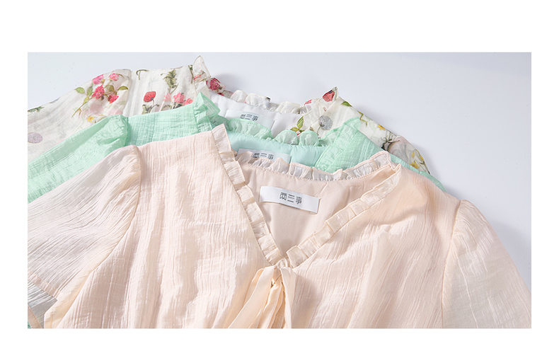两三事不拘心迹小清新印花领带v领长袖衬衫女宽松衬衣