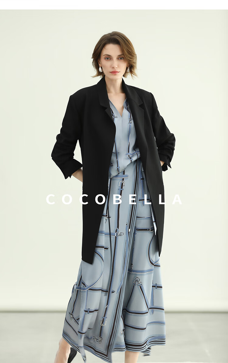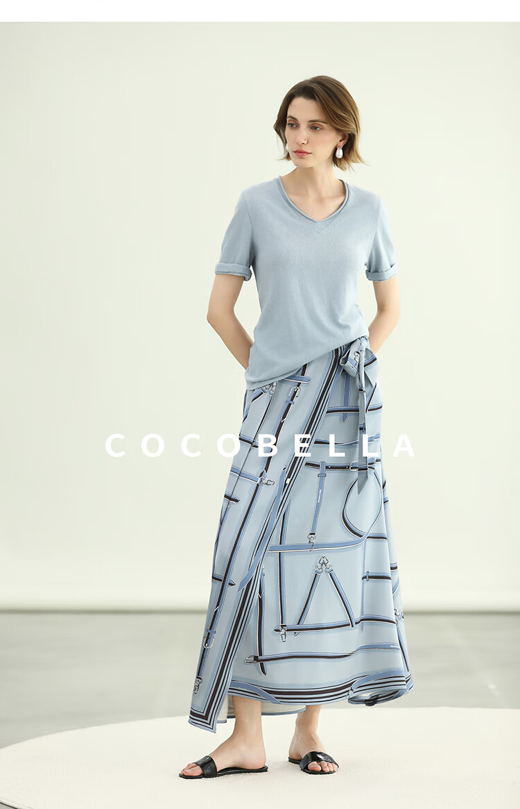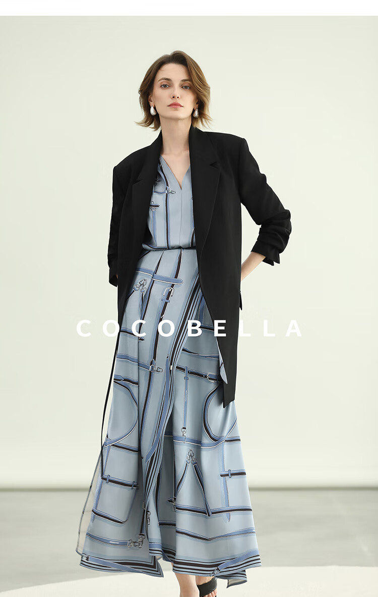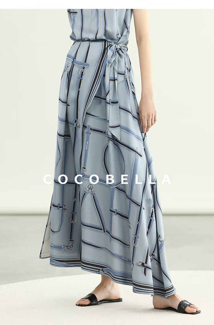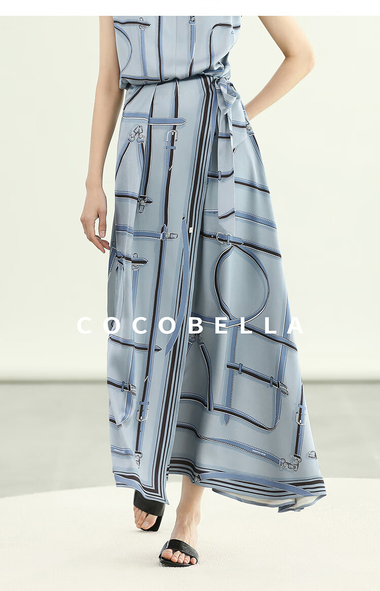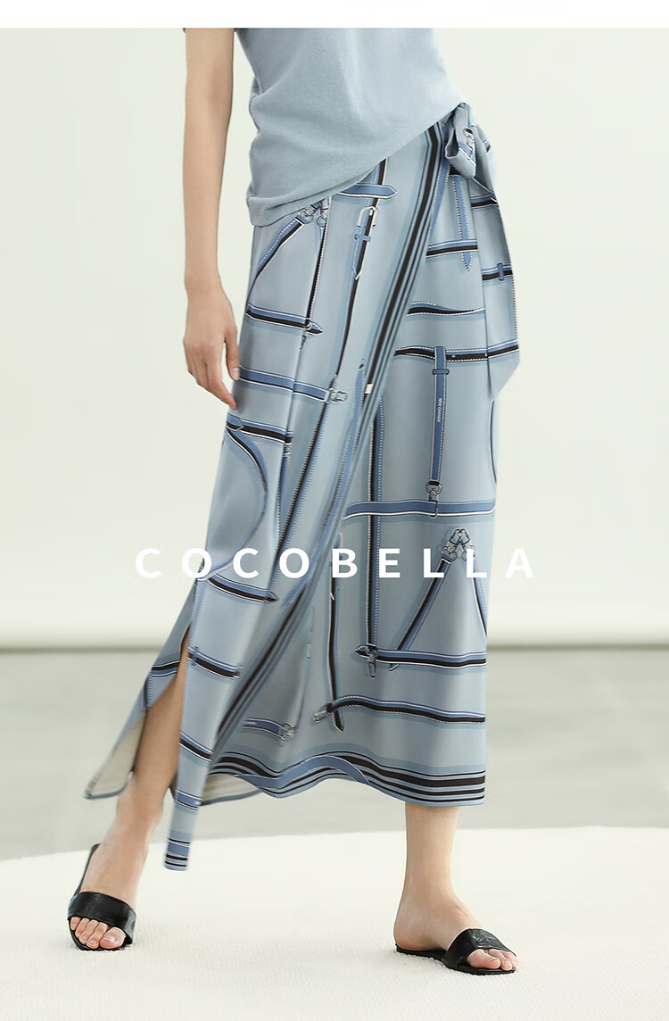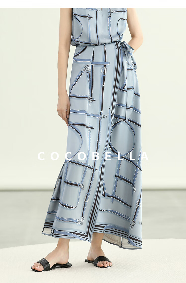 COCOBELLA知性蓝重磅缎面半身裙女早秋设计感印花长裙HS3112-2
