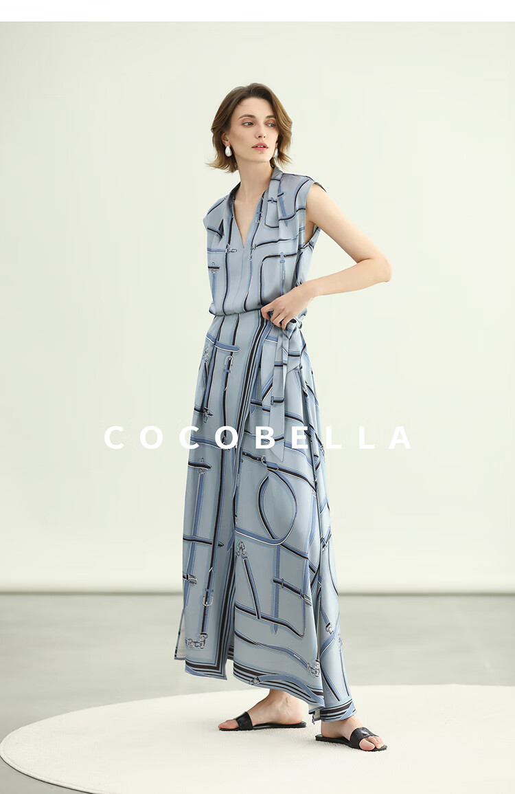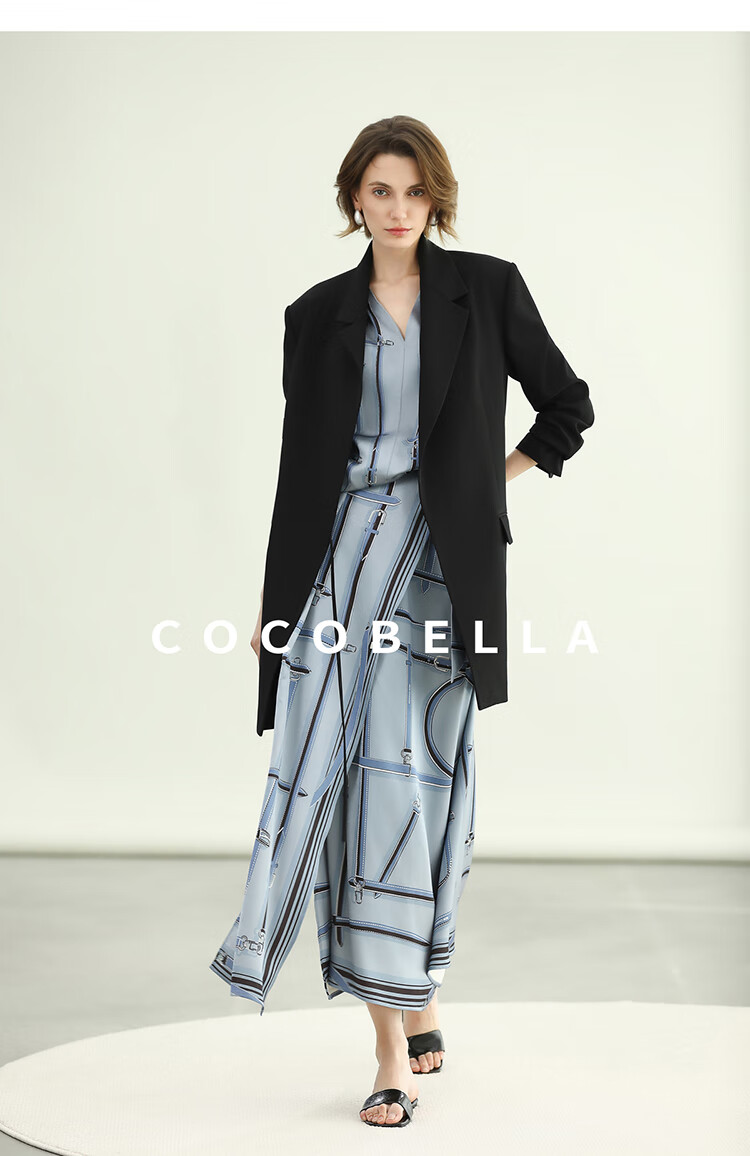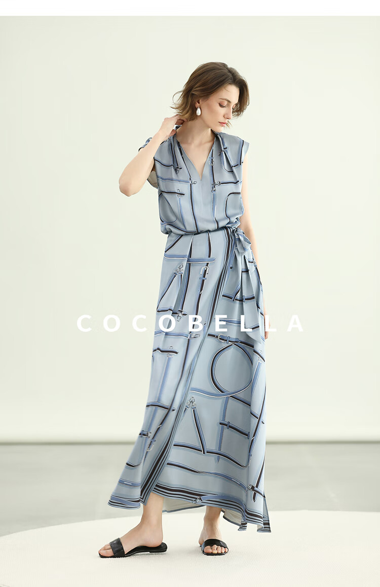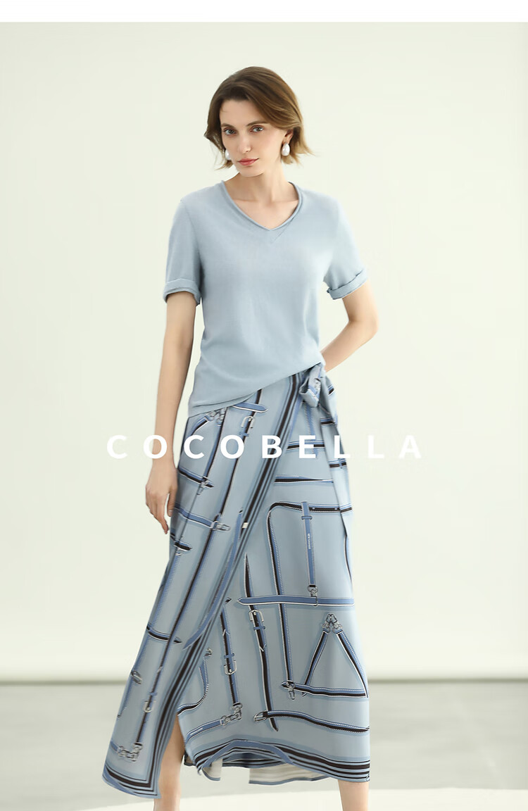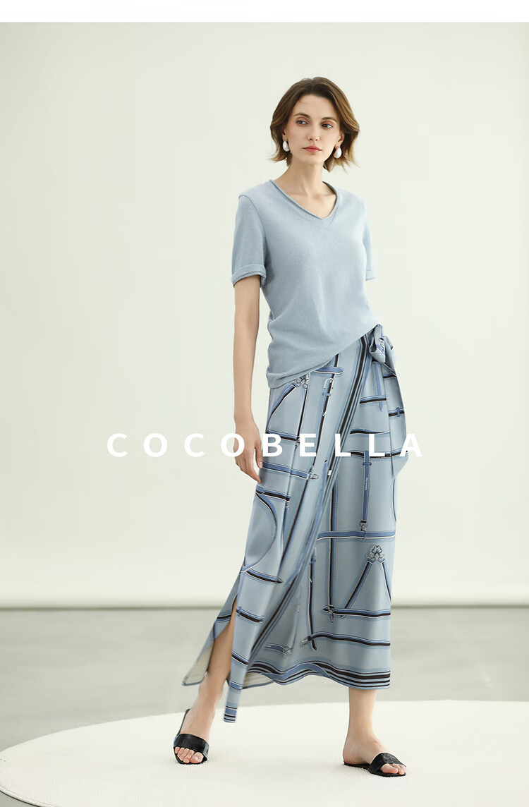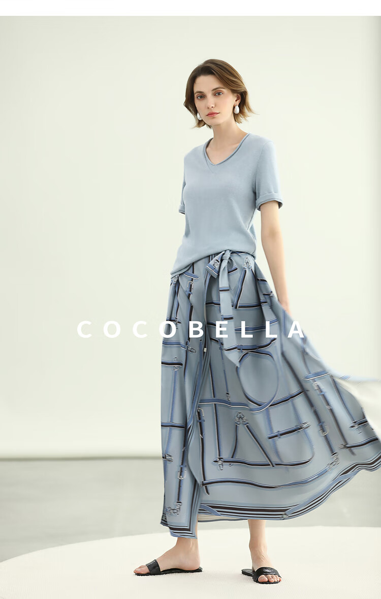 COCOBELLA知性蓝重磅缎面半身裙女早秋设计感印花长裙HS3112-2