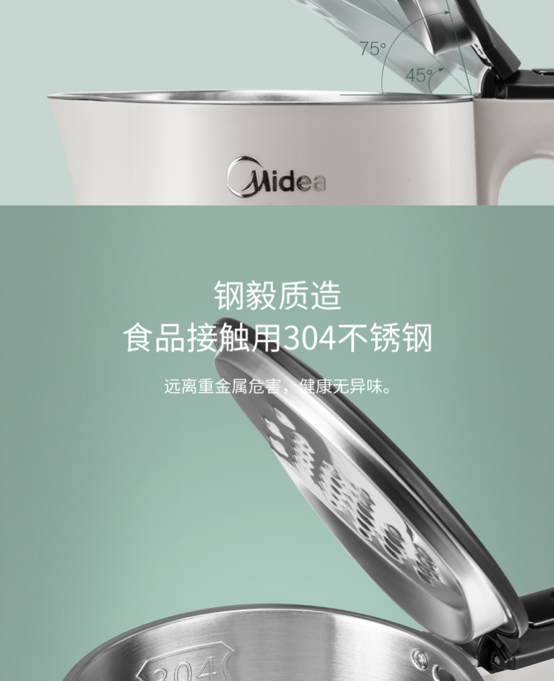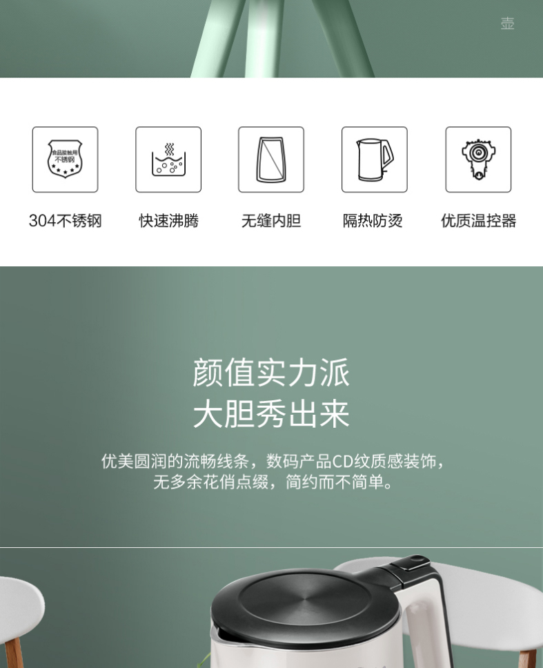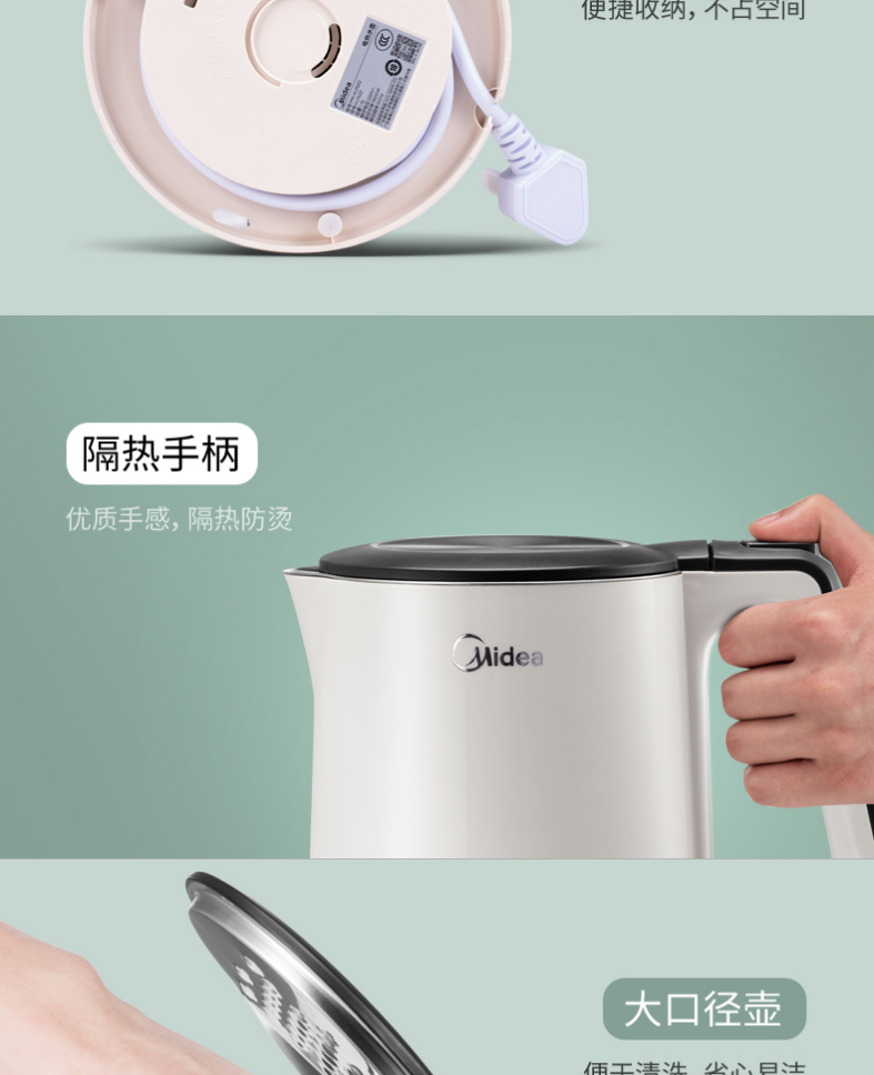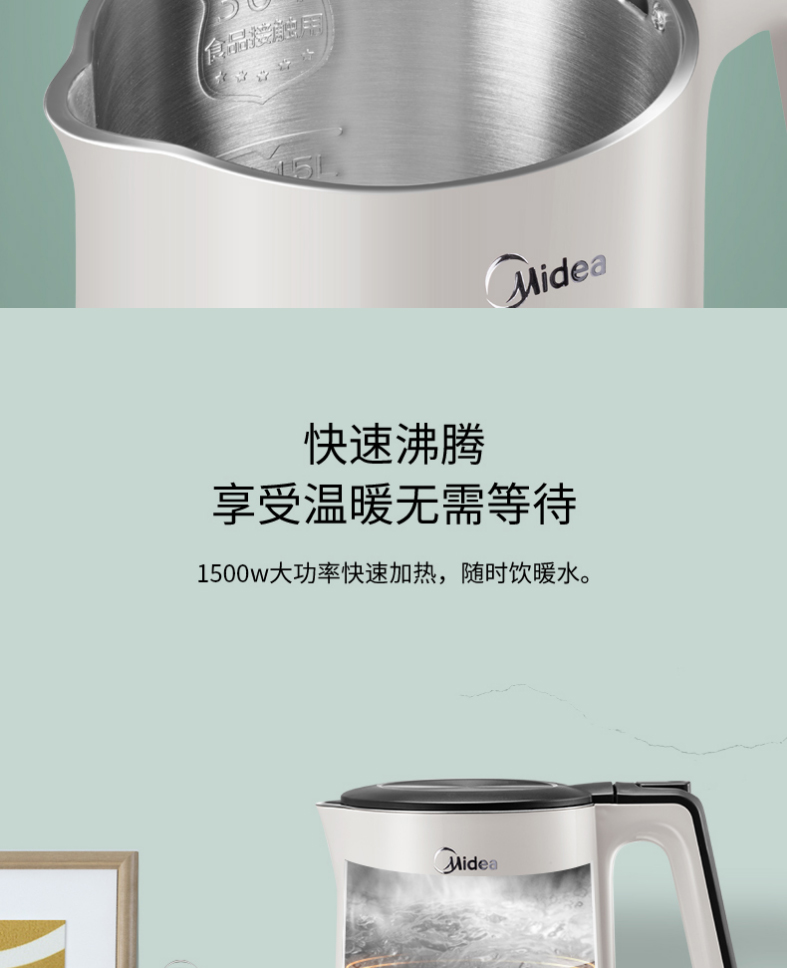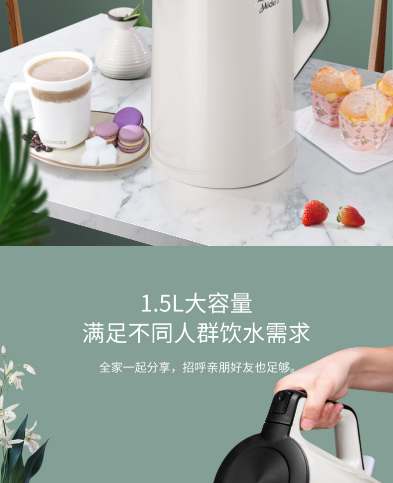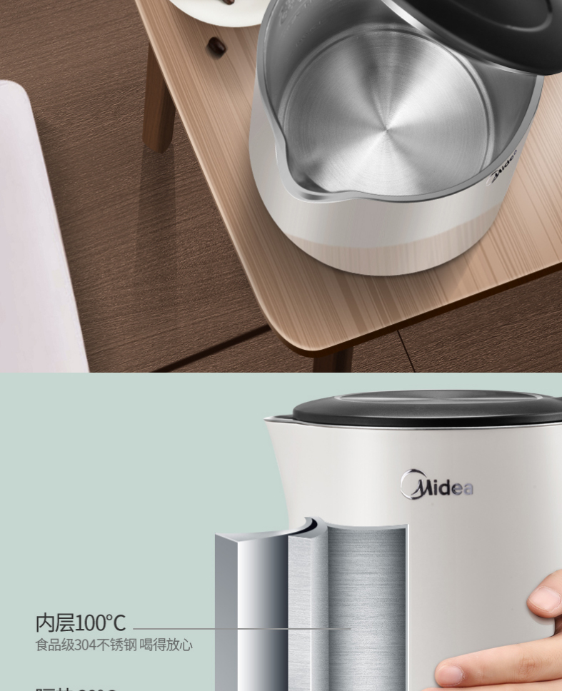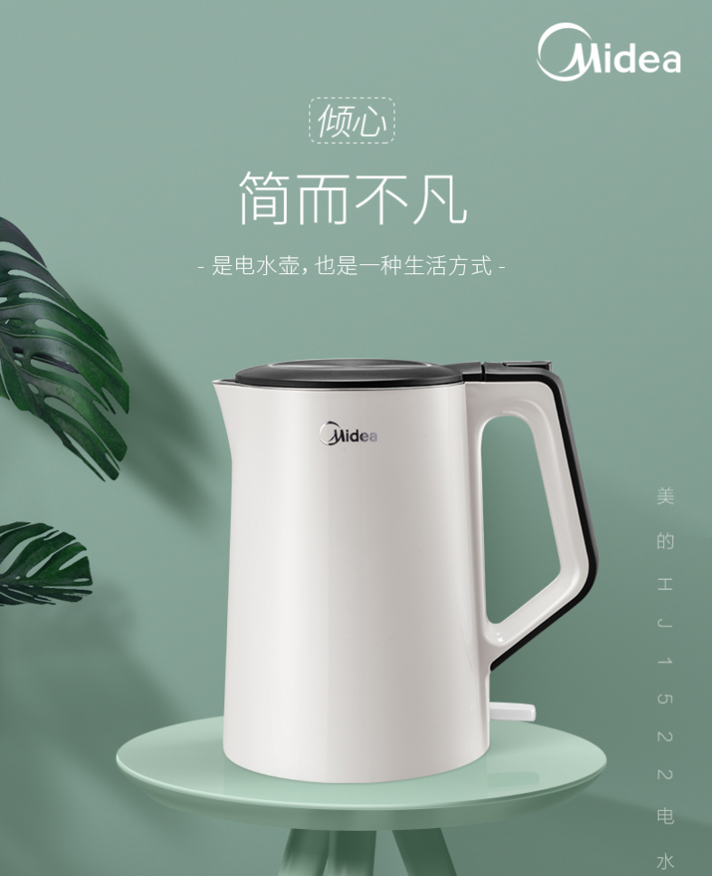 美的电热水壶双层304不锈钢1.5L升家用白色进口温控自动断电防烫线下同款无缝内胆HJ1522