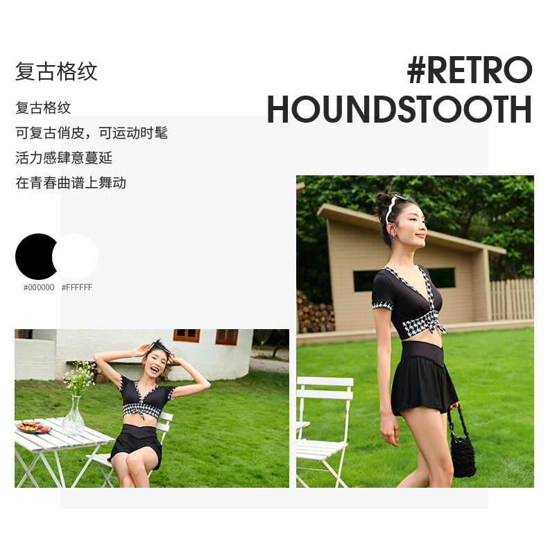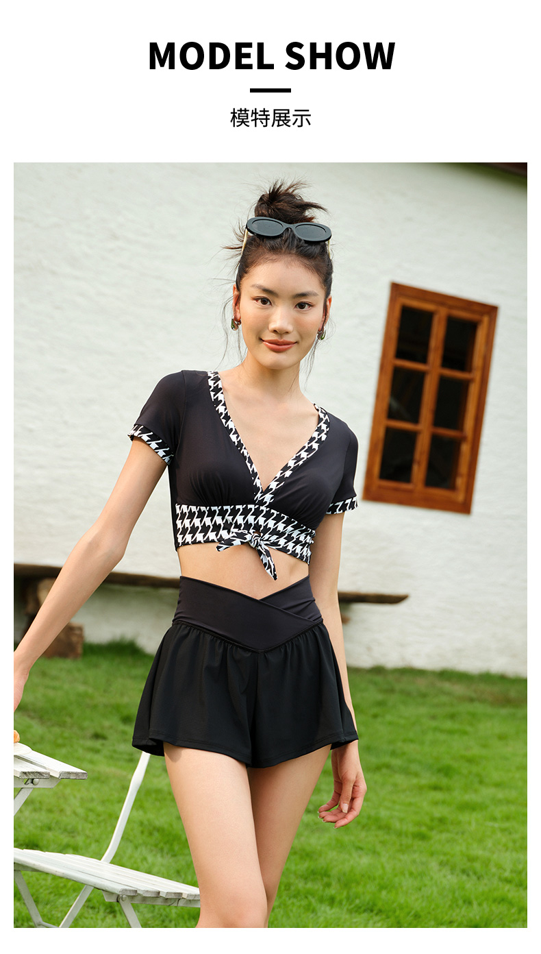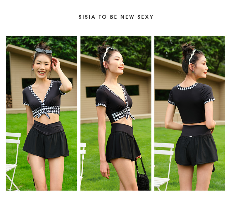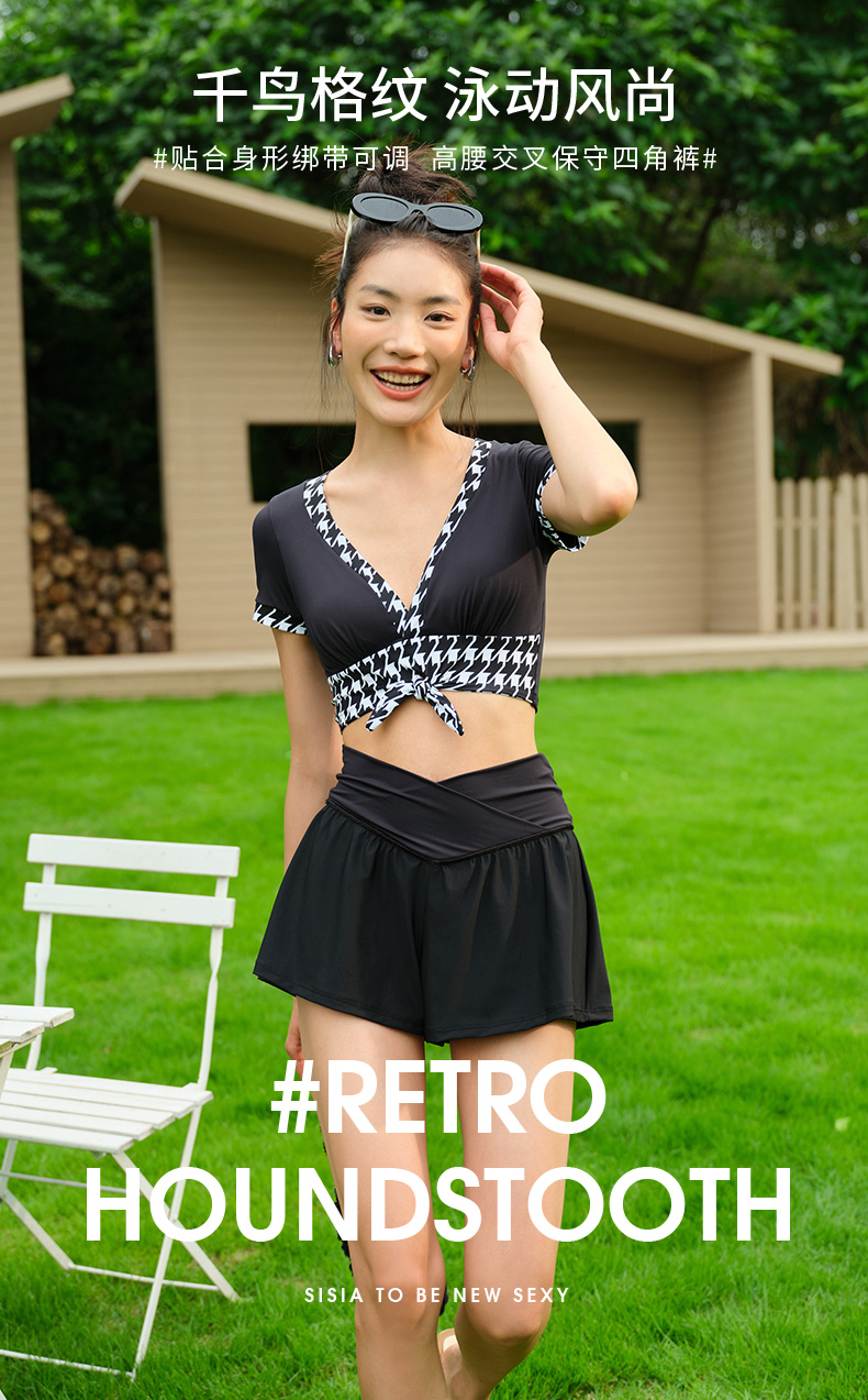 sisia2025新款泳衣女千鸟格纹拼色性感高腰显瘦遮腹温泉分体泳衣SWT24-06A