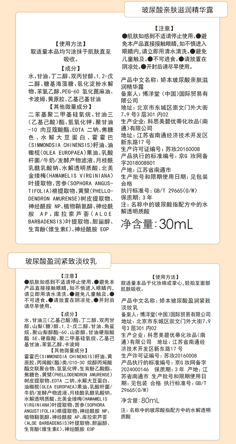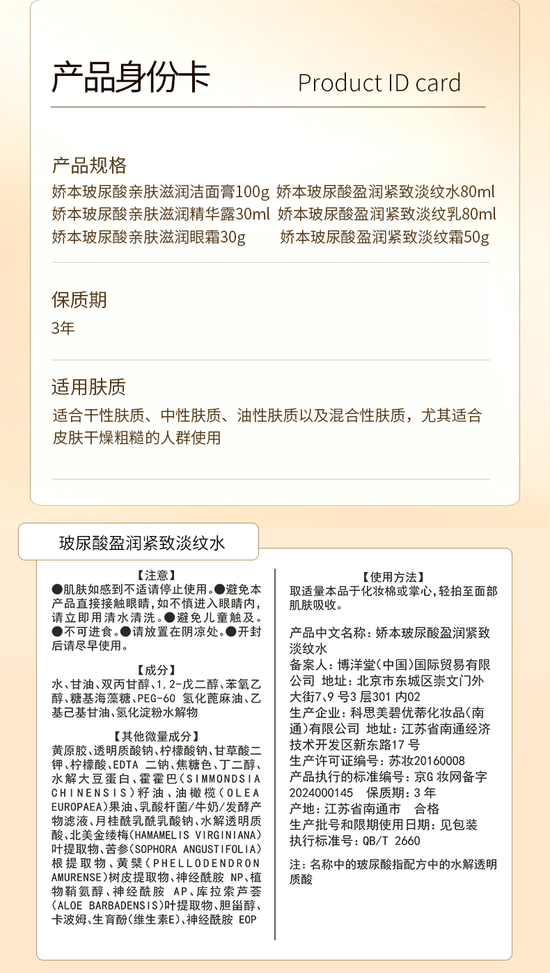| 京G妆网备字2024000145 | 娇本玻尿酸盈润紧致淡纹水 |