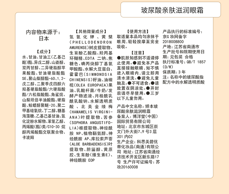 | 京G妆网备字2018008800 | 娇本玻尿酸亲肤滋润眼霜 |