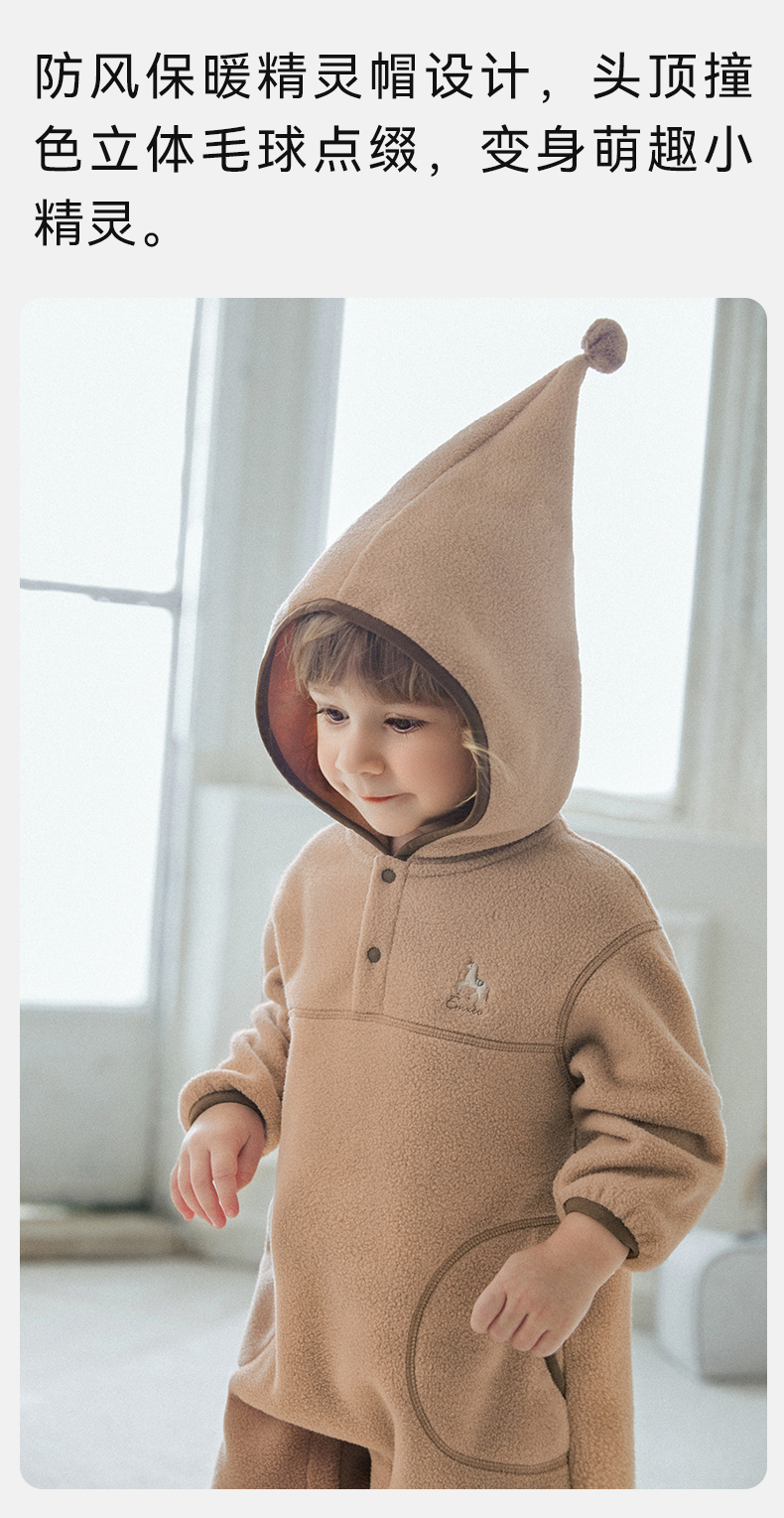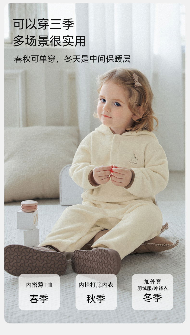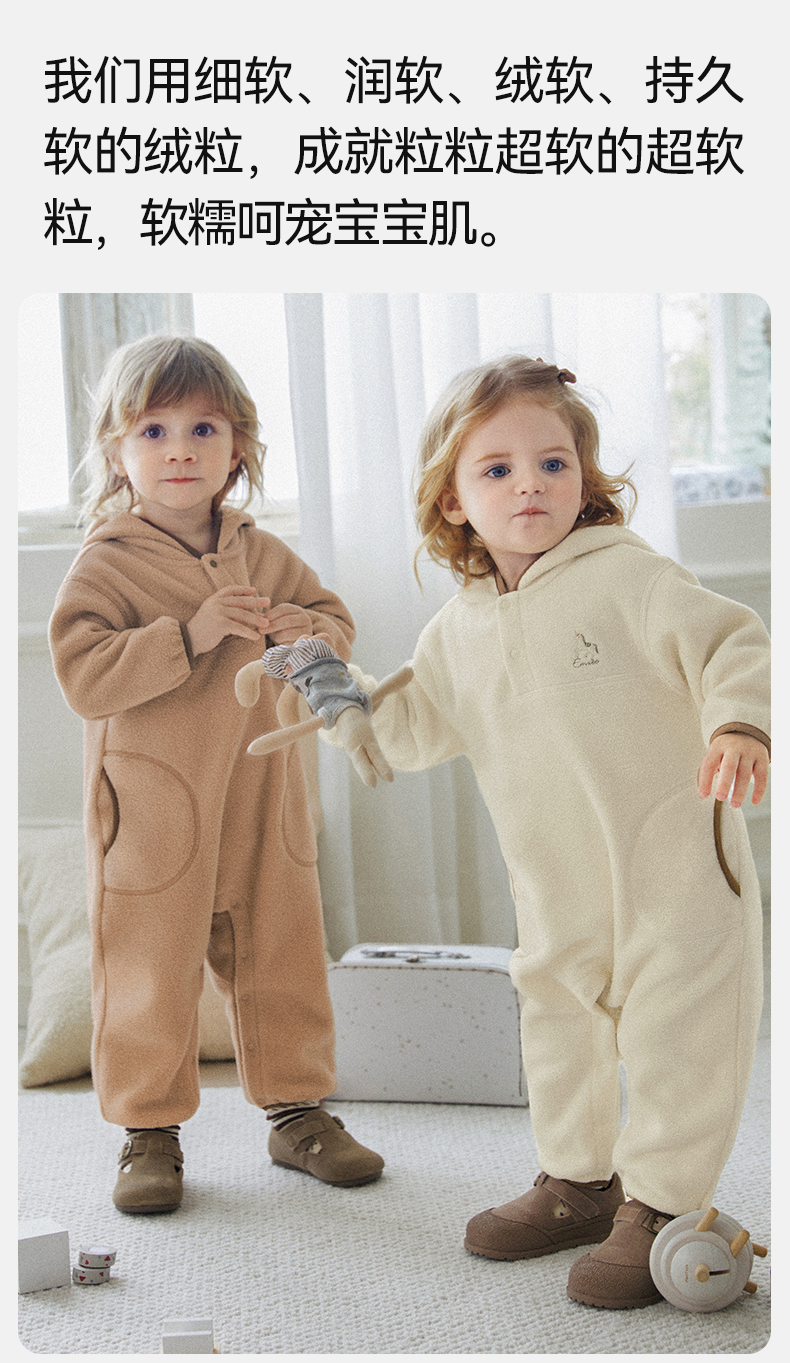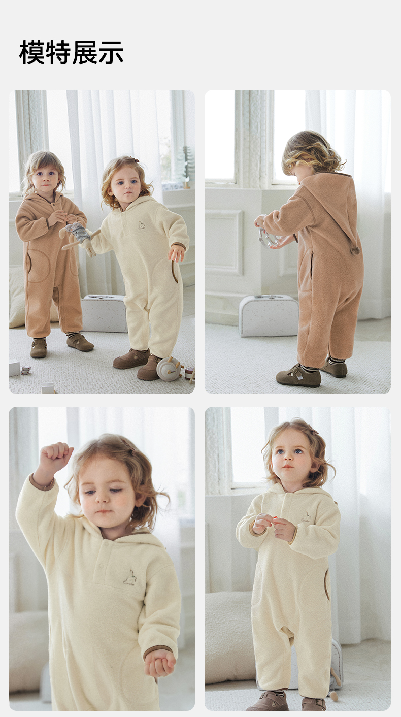 【宝宝服饰】嫚熙婴童连帽连身衣天丝轻芙暖粒绒奶茶色