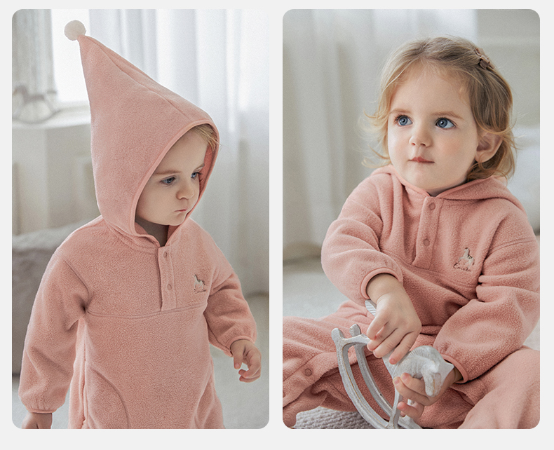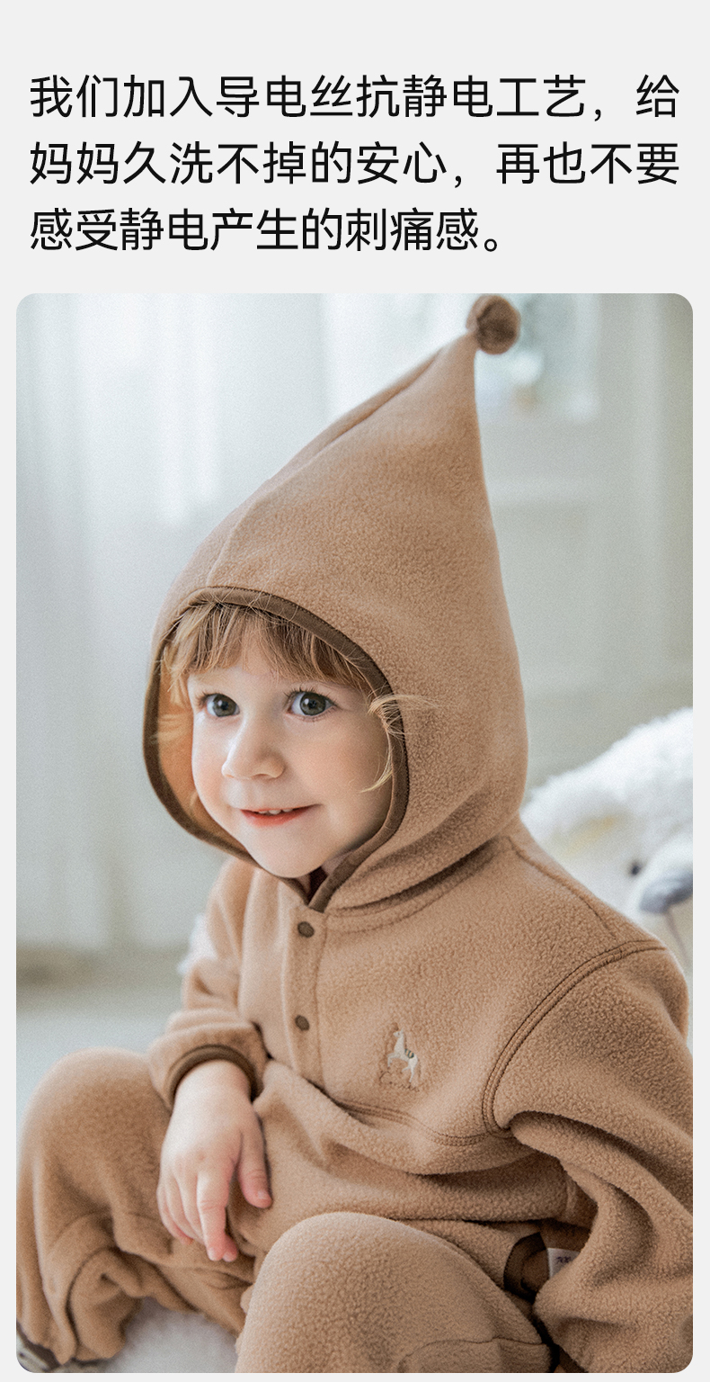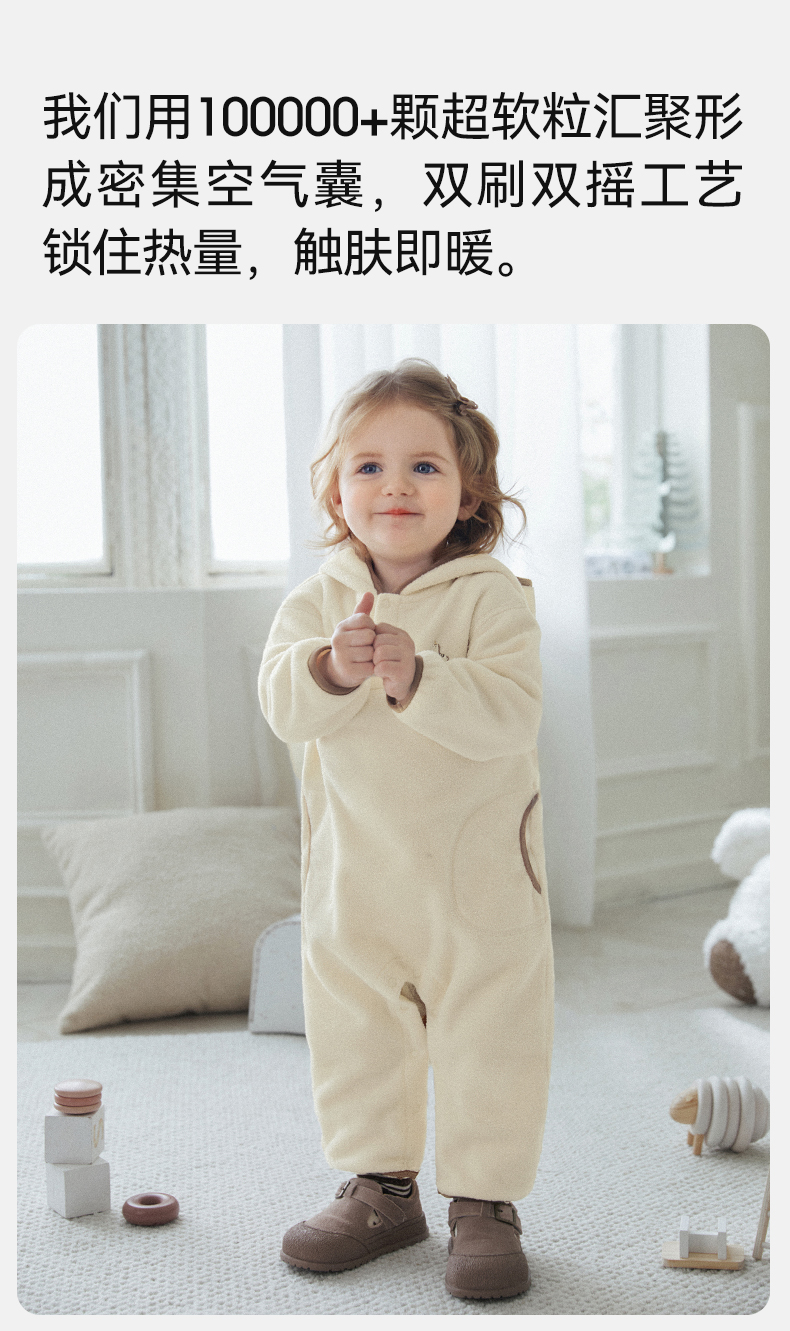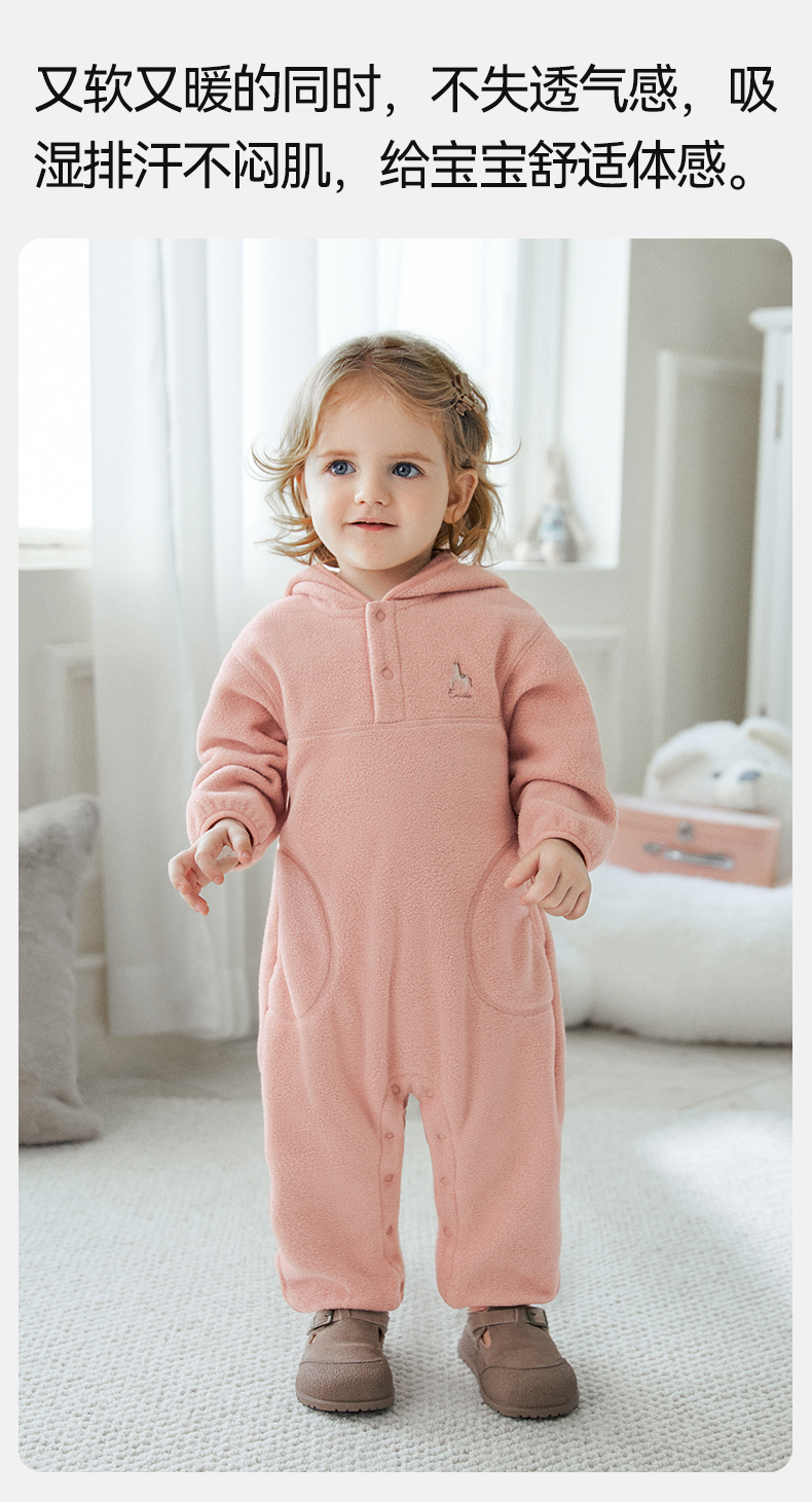 【宝宝服饰】嫚熙婴童连帽连身衣天丝轻芙暖粒绒奶茶色