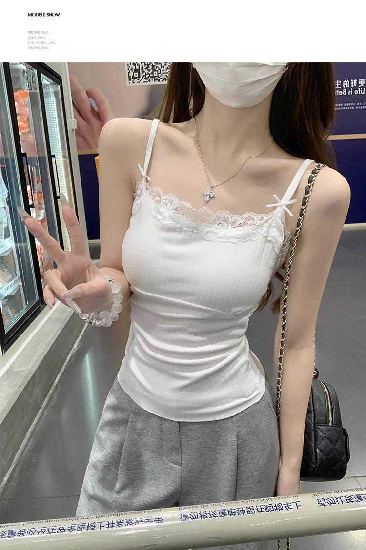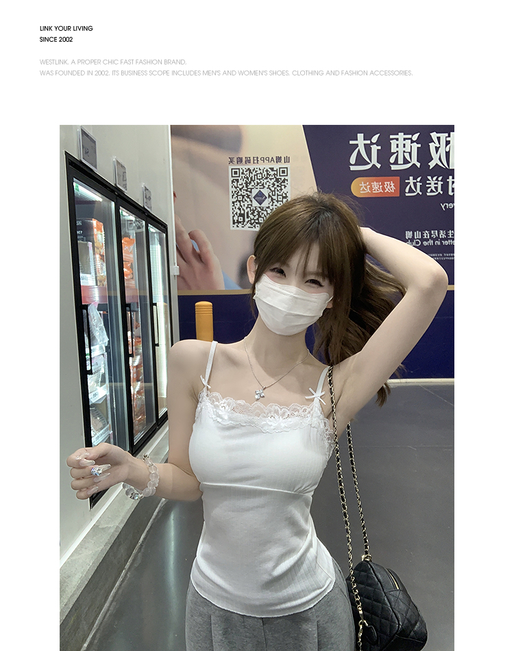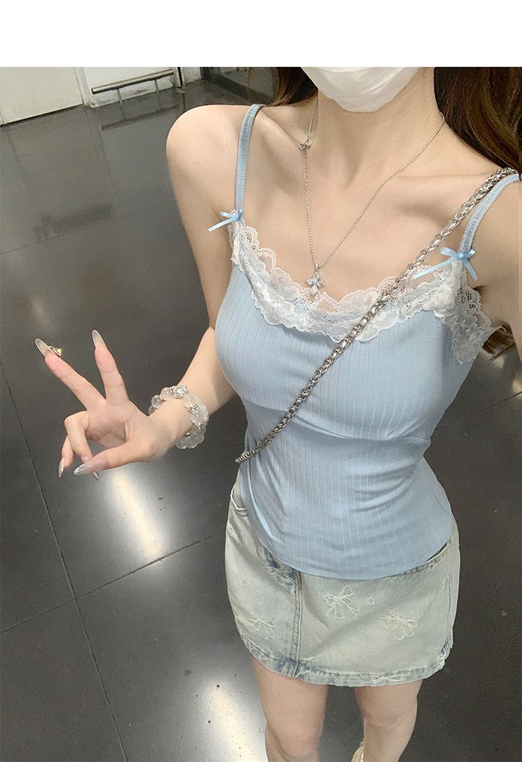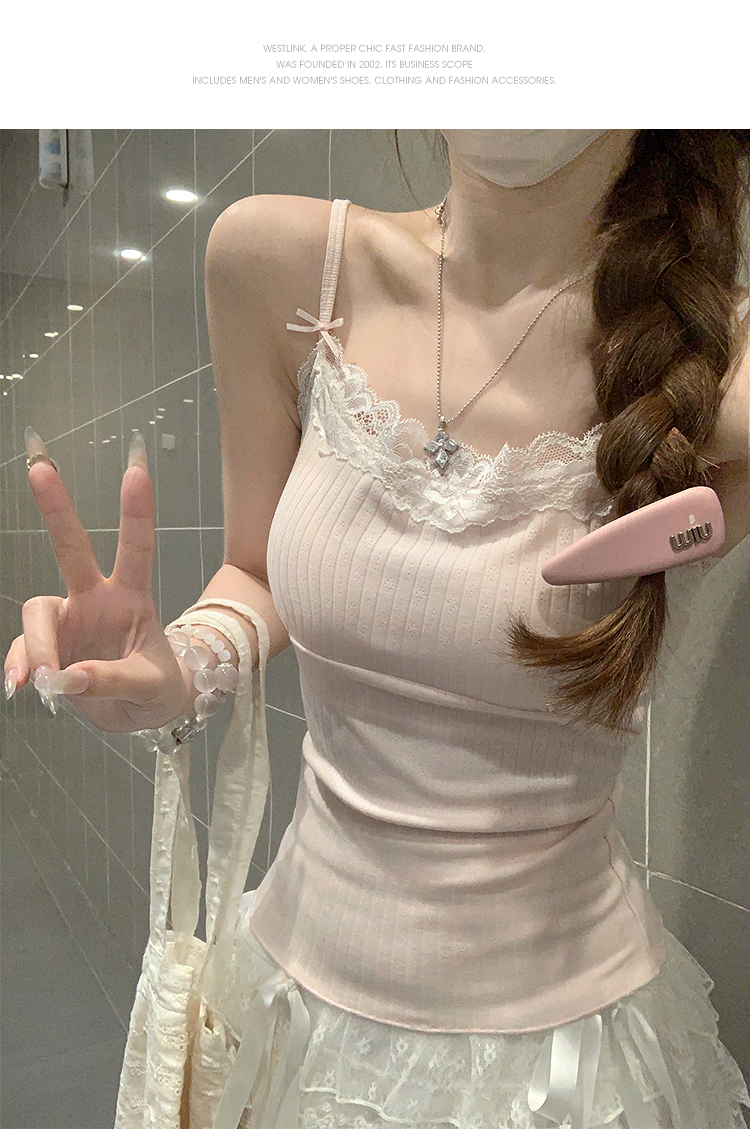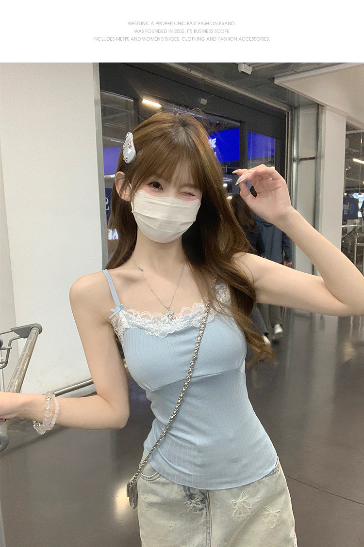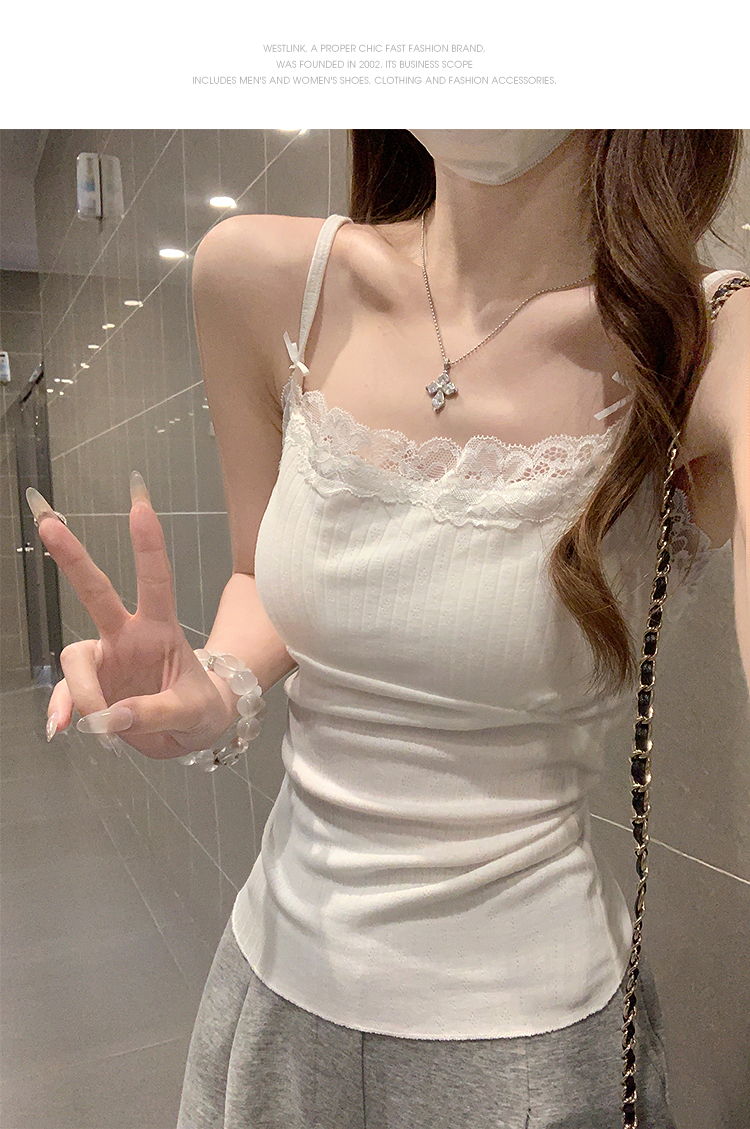 西遇针织吊带背心女夏季新款蝴蝶结蕾丝拼接修身短款上衣SS050880