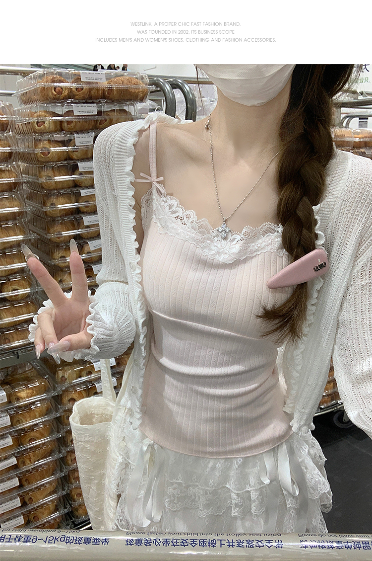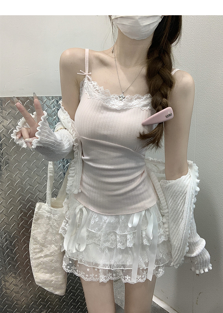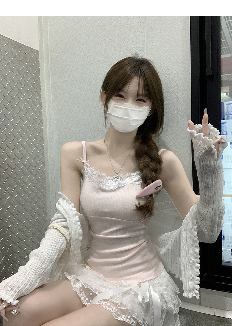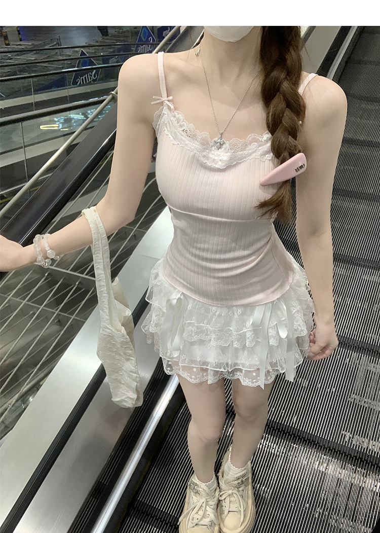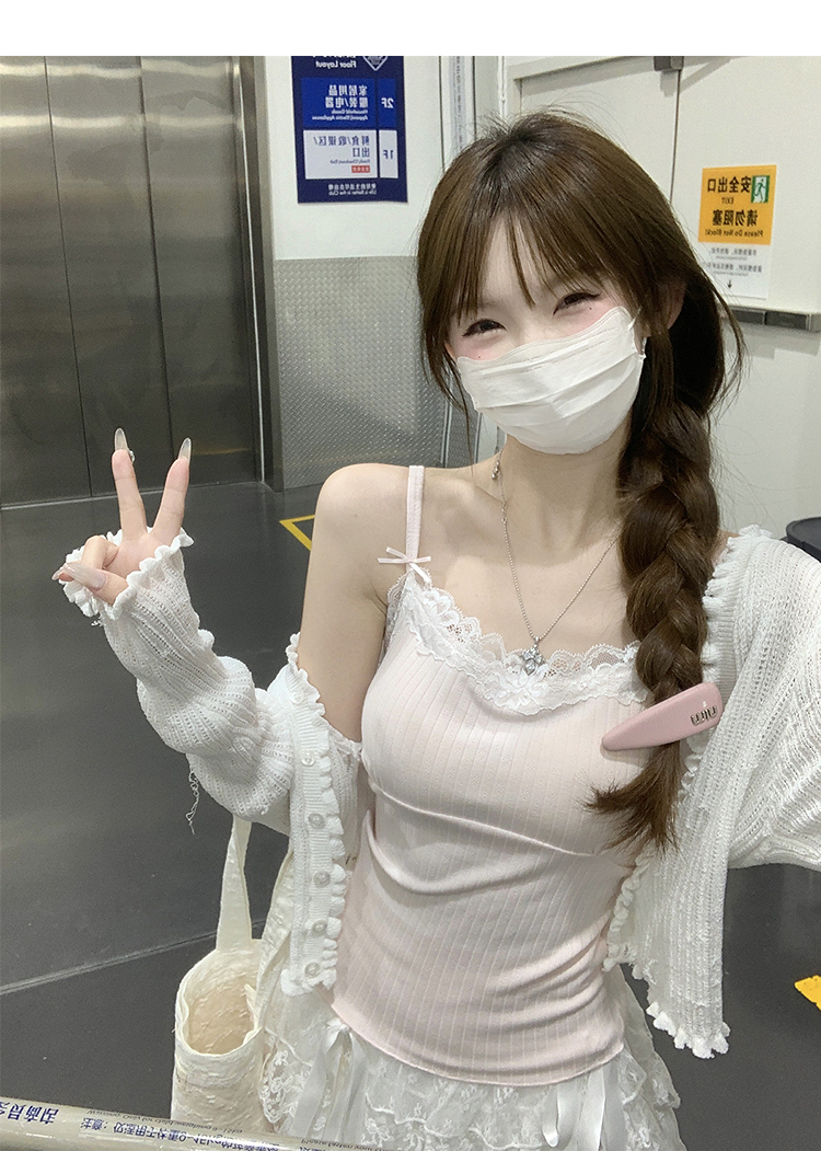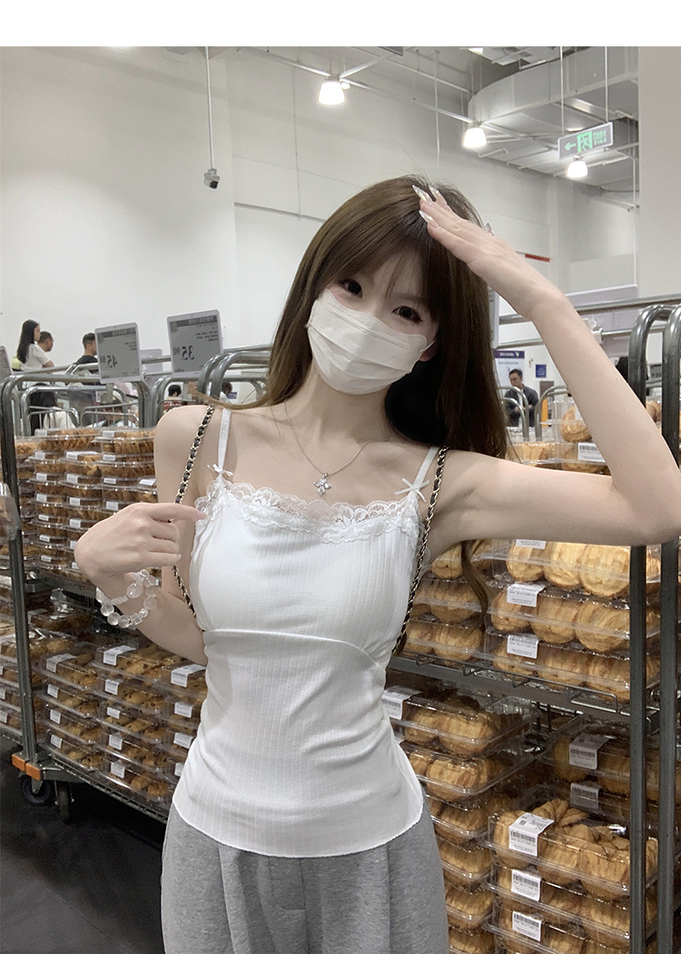 西遇针织吊带背心女夏季新款蝴蝶结蕾丝拼接修身短款上衣SS050880