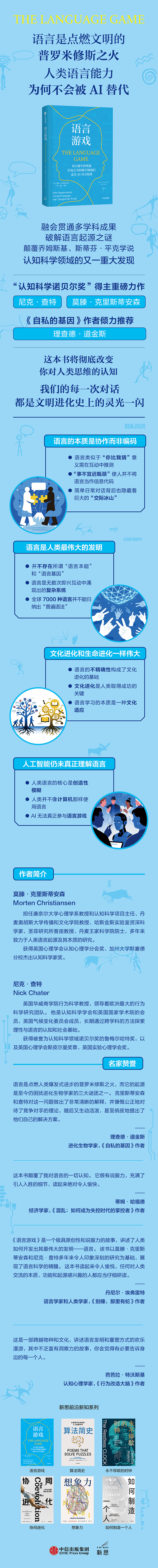 1.语言是人类伟大的发明:综合认知科学、人类学、语言学、心理学、遗传学、脑科学等多学科研究成果,证明语言并非人类固有本能,而是人类集体的发明,对乔姆斯基、史蒂芬·平克传统观点提出强劲挑战。2.意义源于协作而非编码:提出颠覆性的语言观,即语言并非我们想象中的符号与信息一一对应的机械系统,它是一场无尽的“你比我猜”游戏,是无数次即兴互动中涌现出的复杂系统。真实的人类语言与计算机语言,以及AI理解的人类语言存在本质区别。