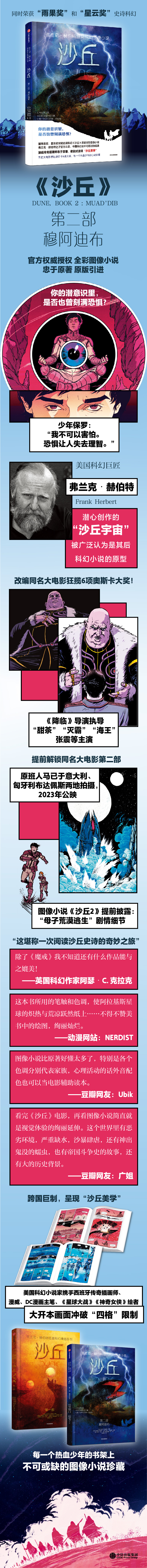 *官方授权,忠于史诗级科幻《沙丘》原著改编,全彩图像小说原版引进,被誉为“这堪称一次阅读《沙丘》史诗的奇妙之旅”。