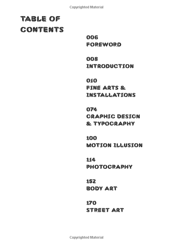 An optical illusion confuses the eye by pretending to be something it isn't. It both misleads and deceives the brain, which is trying to make sense of the information the eye is sending. This book presents a selection of brain-bending optical illusions featuring graphic art and photography by 60 artists, and includes an overview of the history of optical illusions in art."