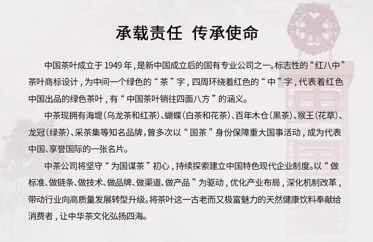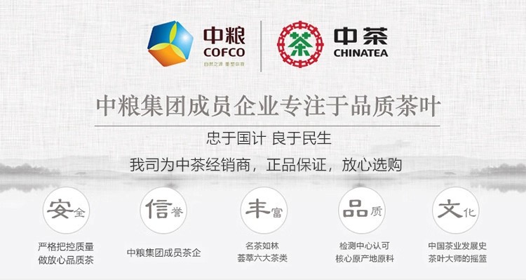 - 中茶是中粮集团十八个专业化公司之一和集团重点打造的十二条粮油食品产业链之一。中国茶叶以继承和发展中华传统茶文化为使命,秉承自然、生态、安全、健康的理念。
