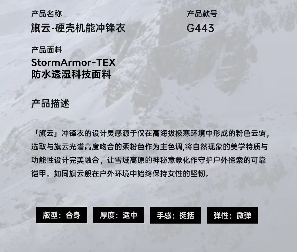 天石鹅铠甲旗云专业防水防风硬壳冲锋衣女款G443