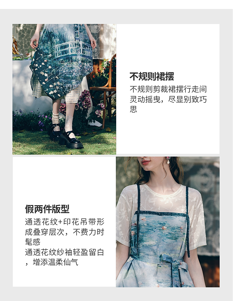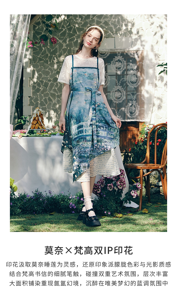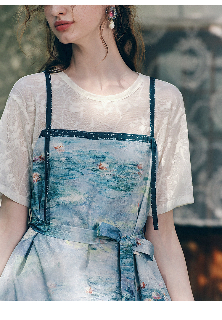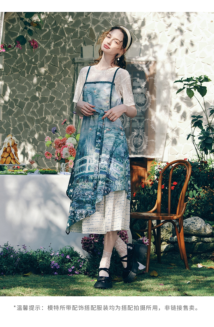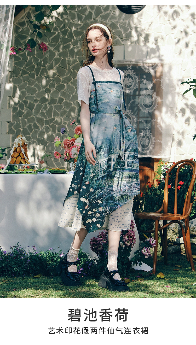 两三事梵高文艺 夏池香荷 2026春季新款针织拼接印花假两件连衣裙