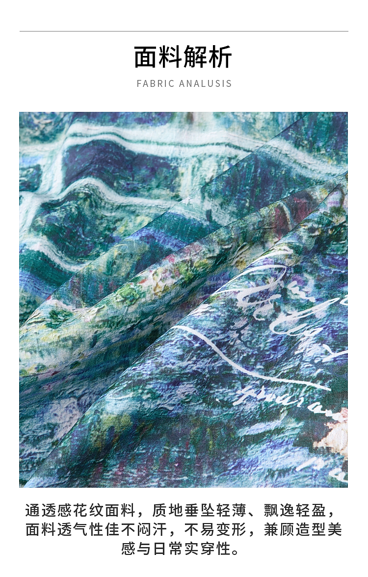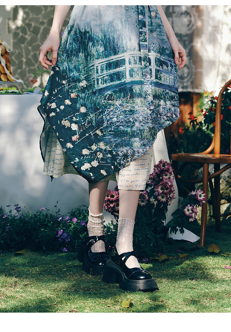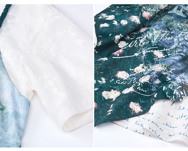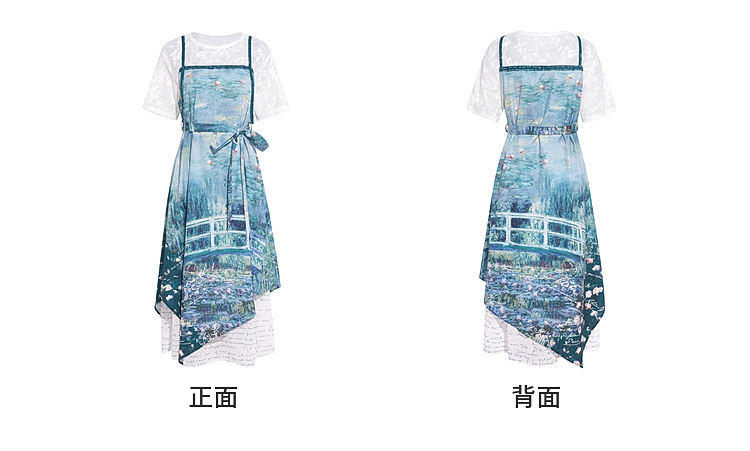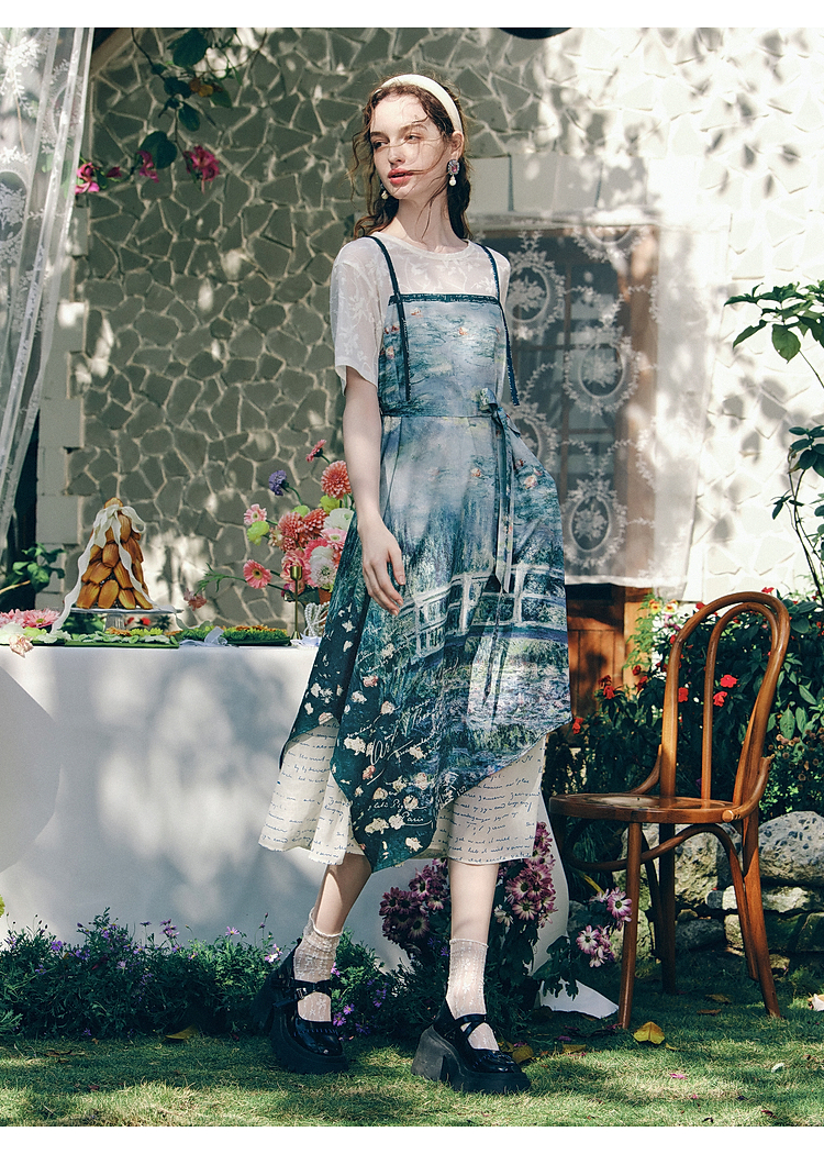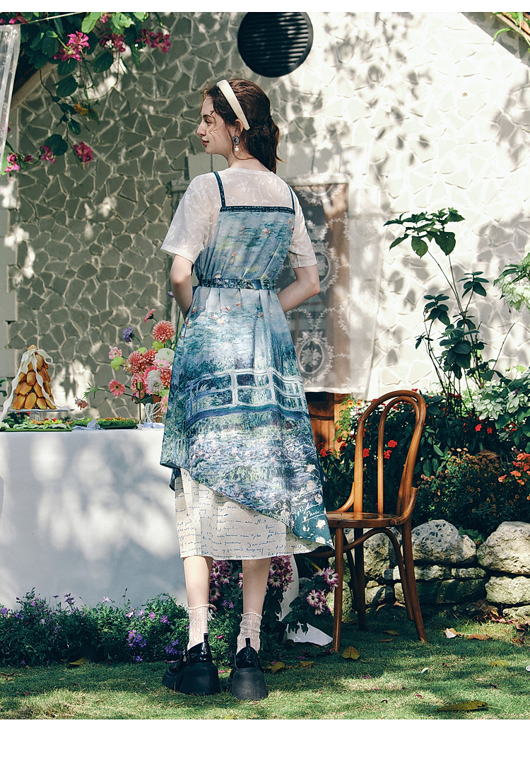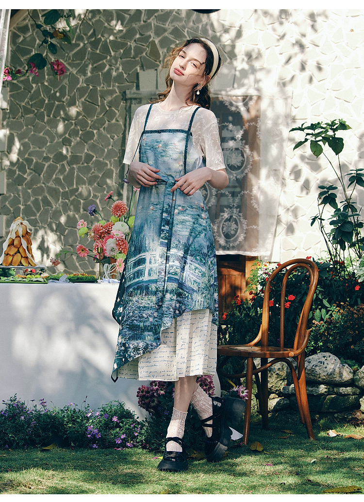 两三事梵高文艺 夏池香荷 2026春季新款针织拼接印花假两件连衣裙