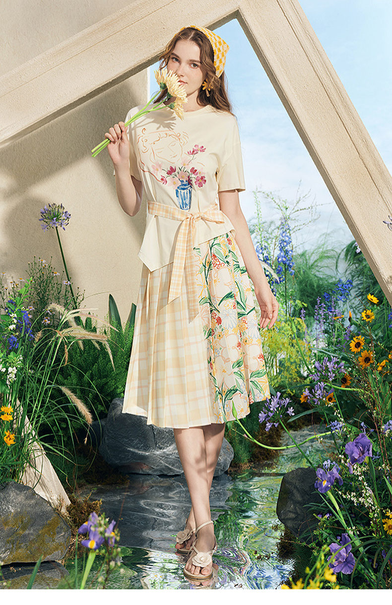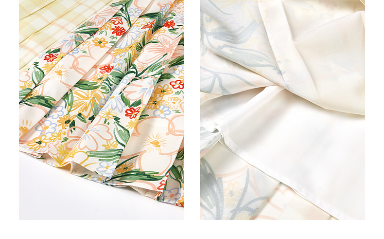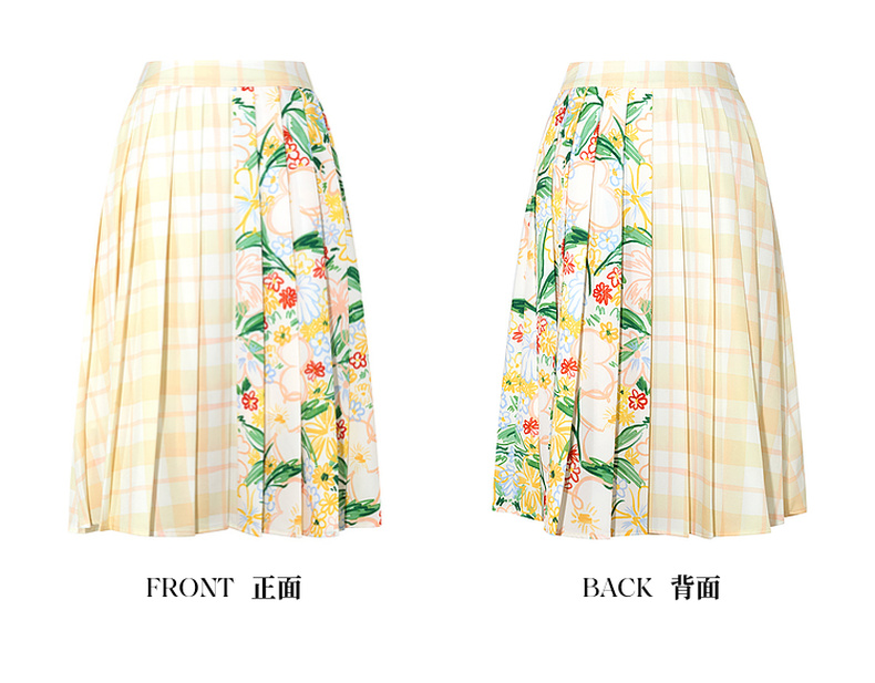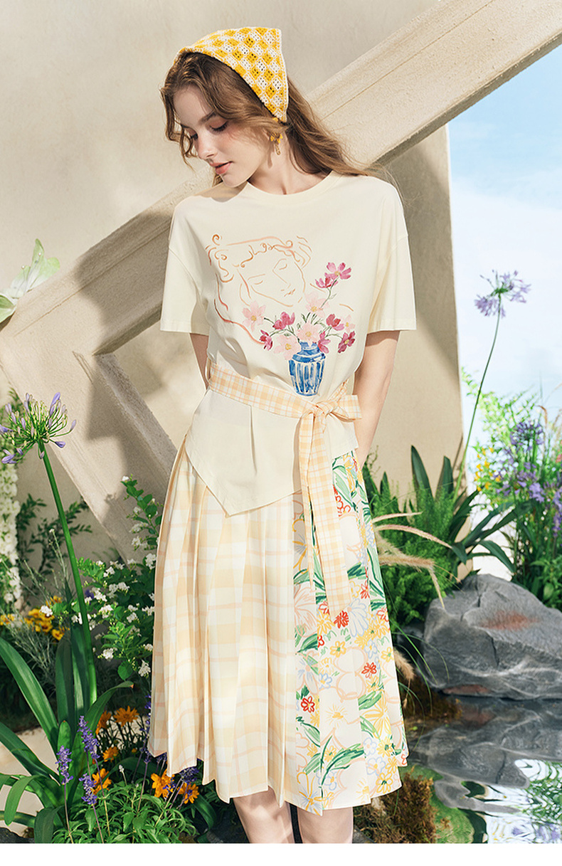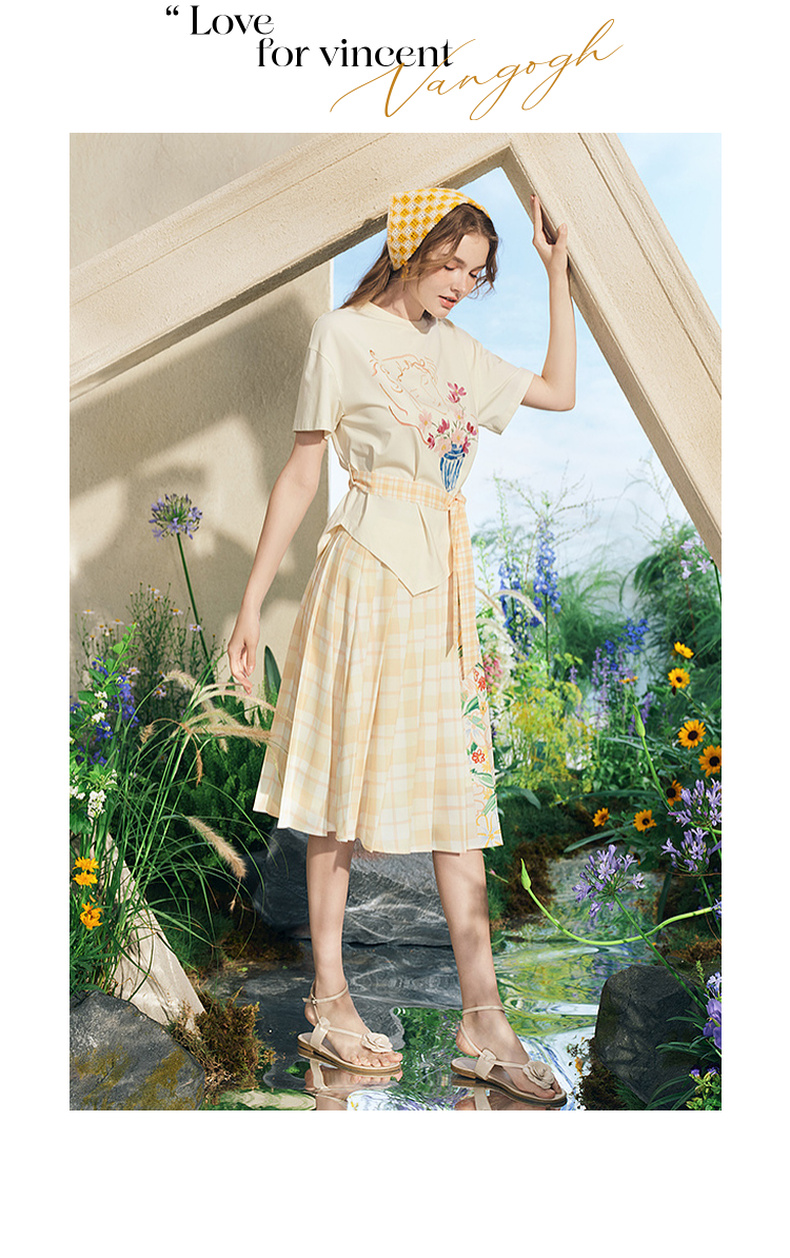 两三事梵高文艺柠光折香2025夏季新款印花格子百褶裙不对称半身裙