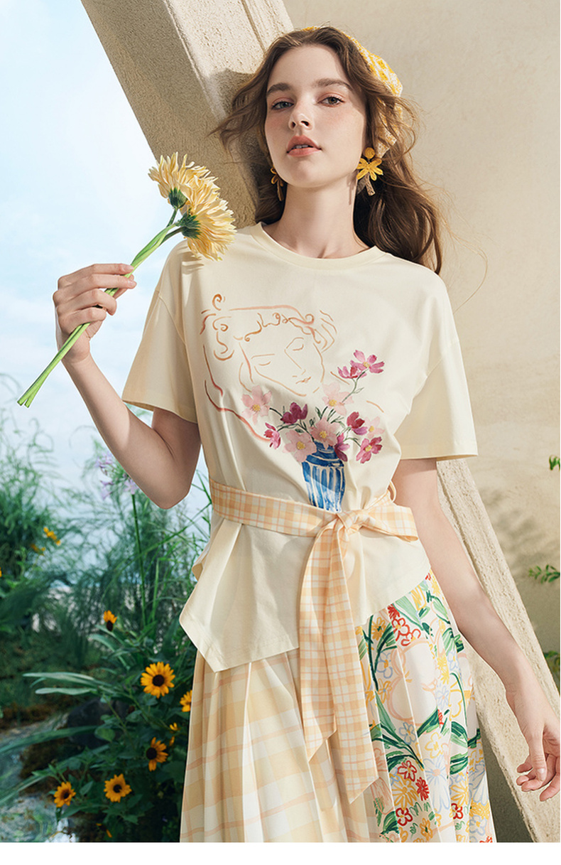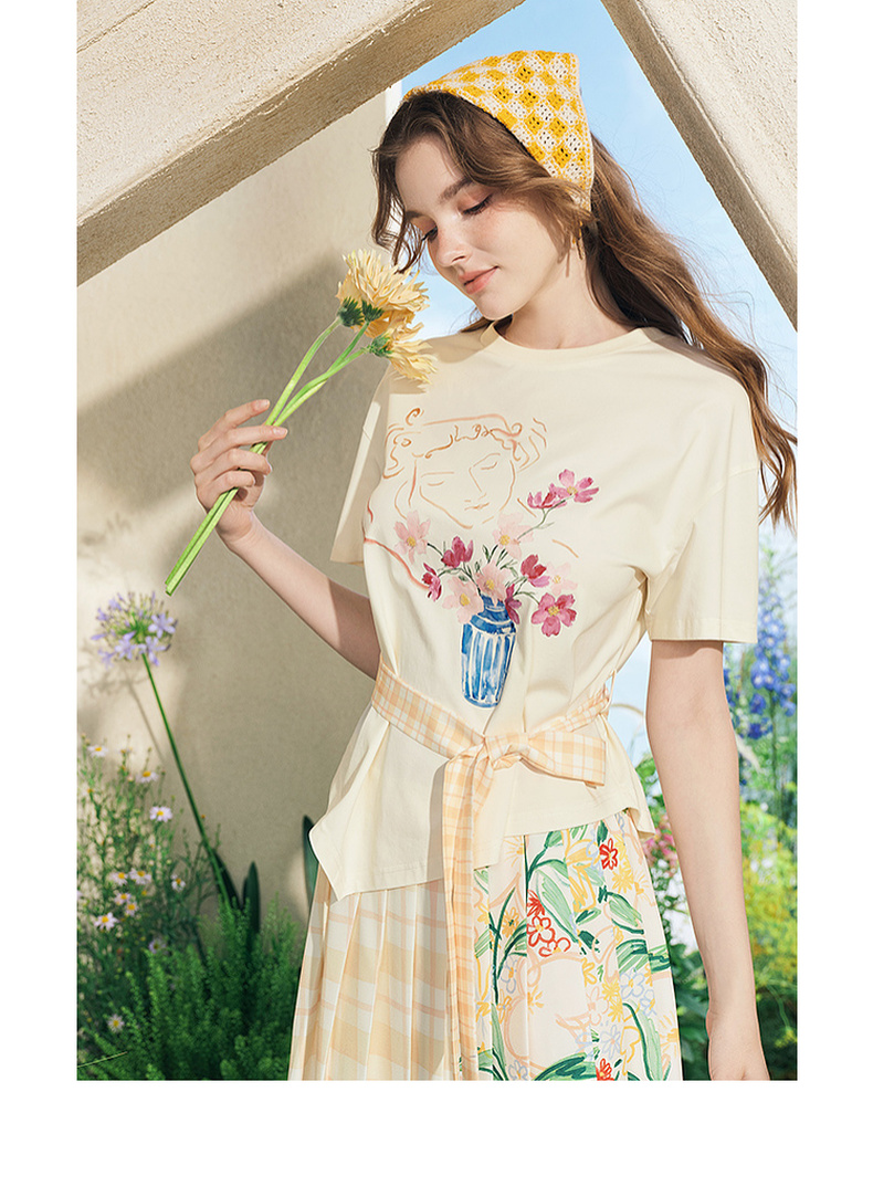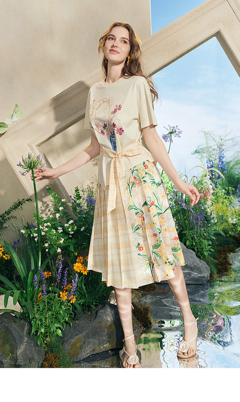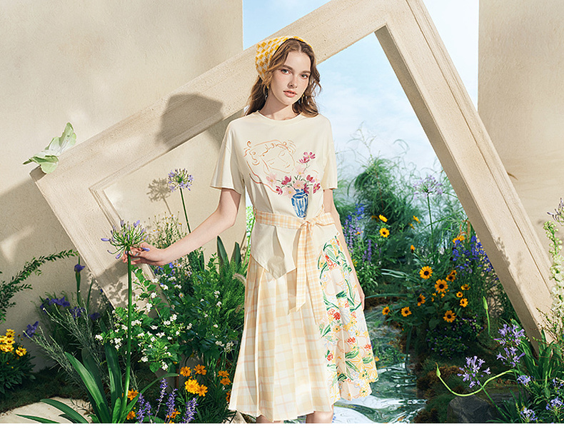 两三事梵高文艺柠光折香2025夏季新款印花格子百褶裙不对称半身裙