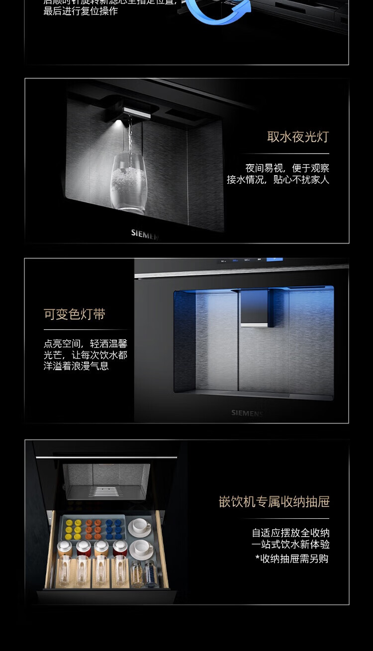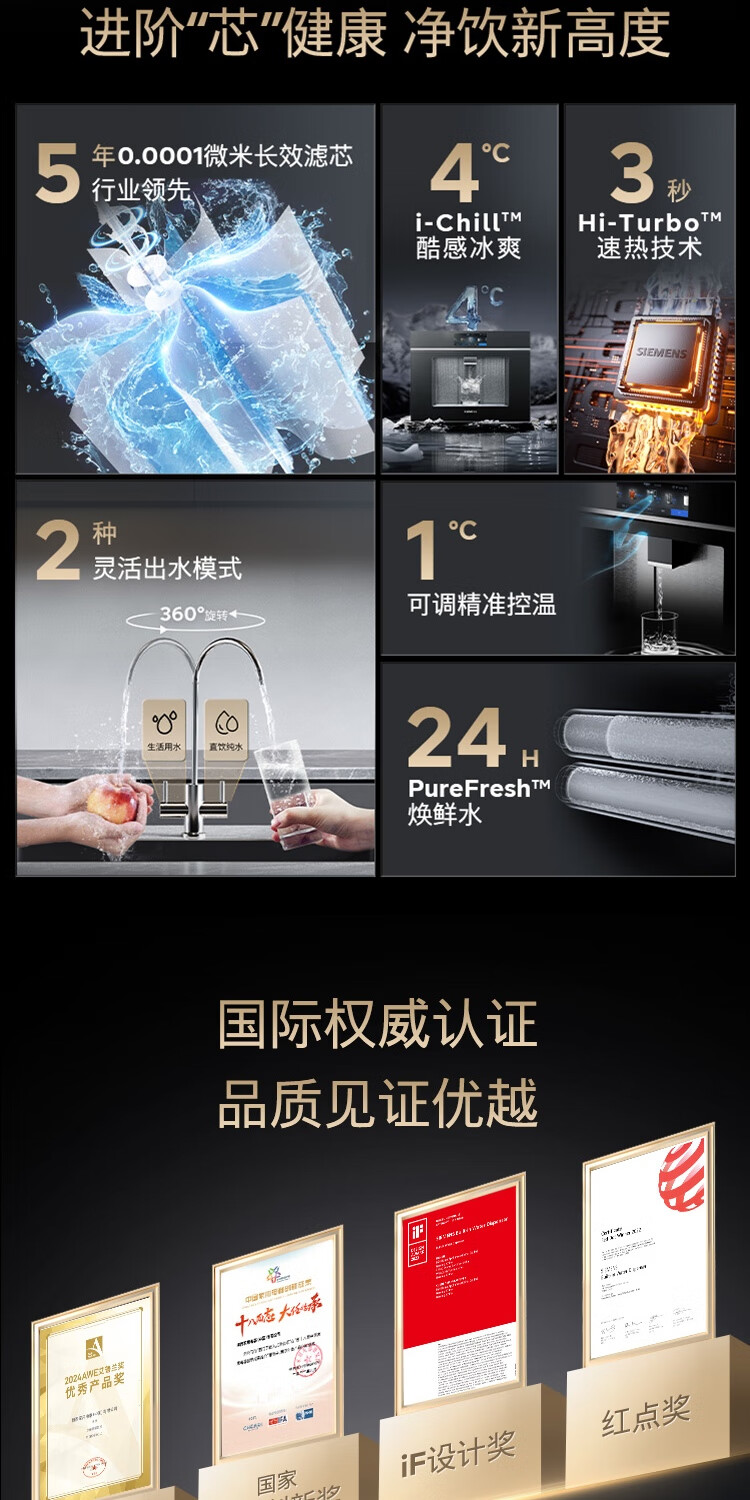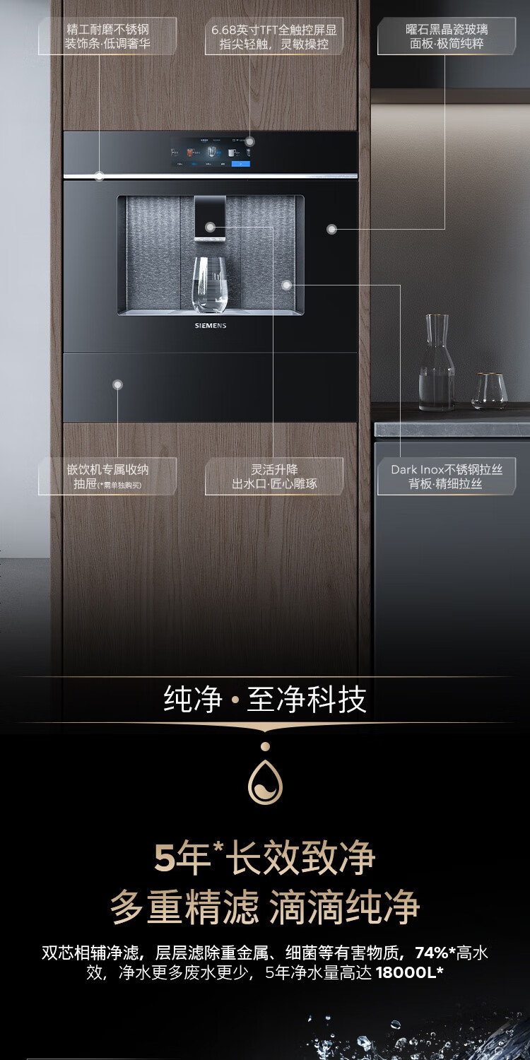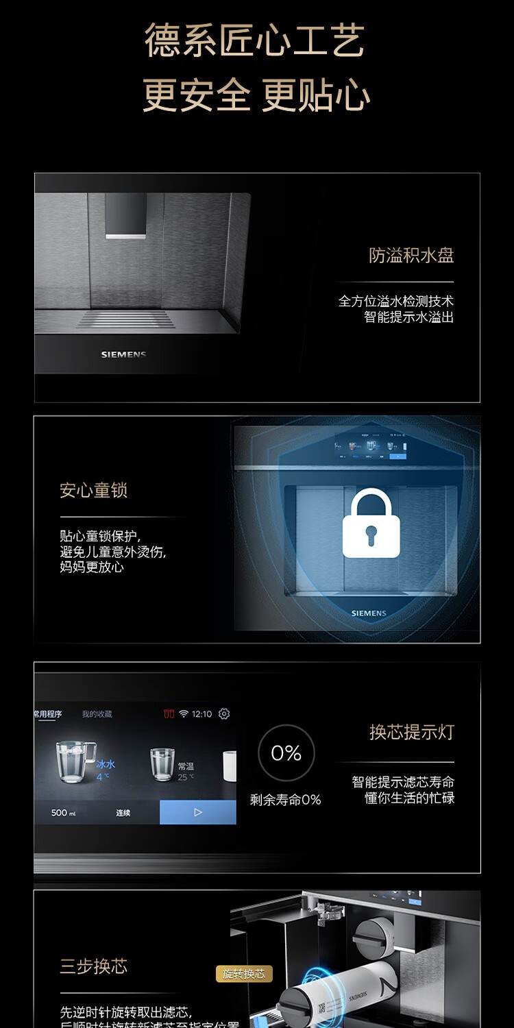西门子(SIEMENS)【水玲珑】700Pro嵌饮机冰热款 嵌入式家用直饮机RO反渗透 6.86英寸触控屏 饮水生活用水二合一 WS7060BC1C曜石黑