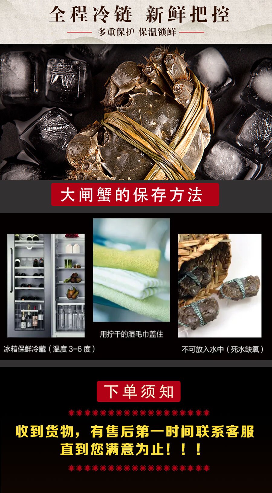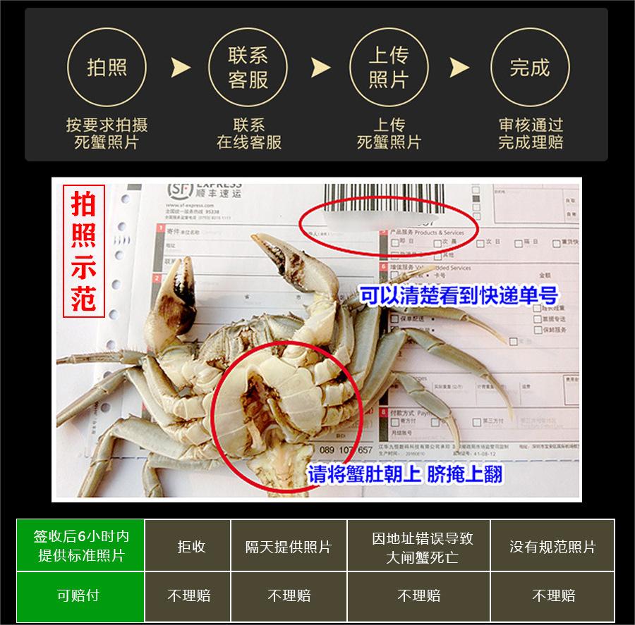 ⚠签收后第一时间验货,若有问题,请于6小时内拍照,解开绳子大闸蟹和快递单合影拍照,单号必须清晰可见