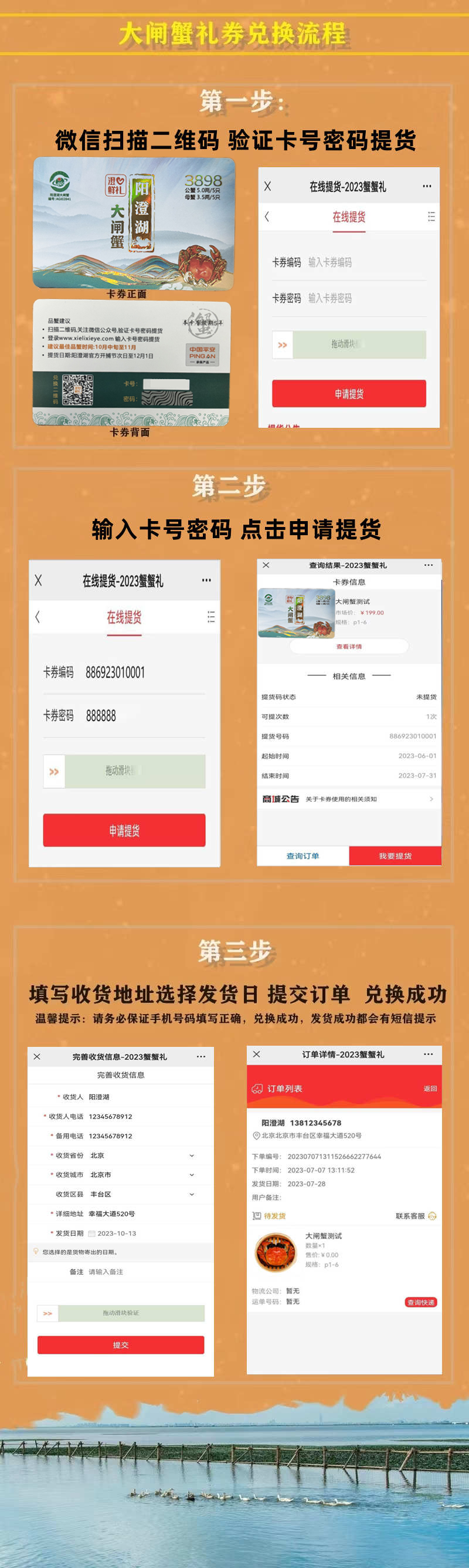 2、 蟹卡收到第一时间清点下数量,记录下规格,卡券号。注意:密码栏不要刮开。卡面要保持整洁,本券不兑现,不找零,遗失不补,请按券面约定内容,约定期限提货