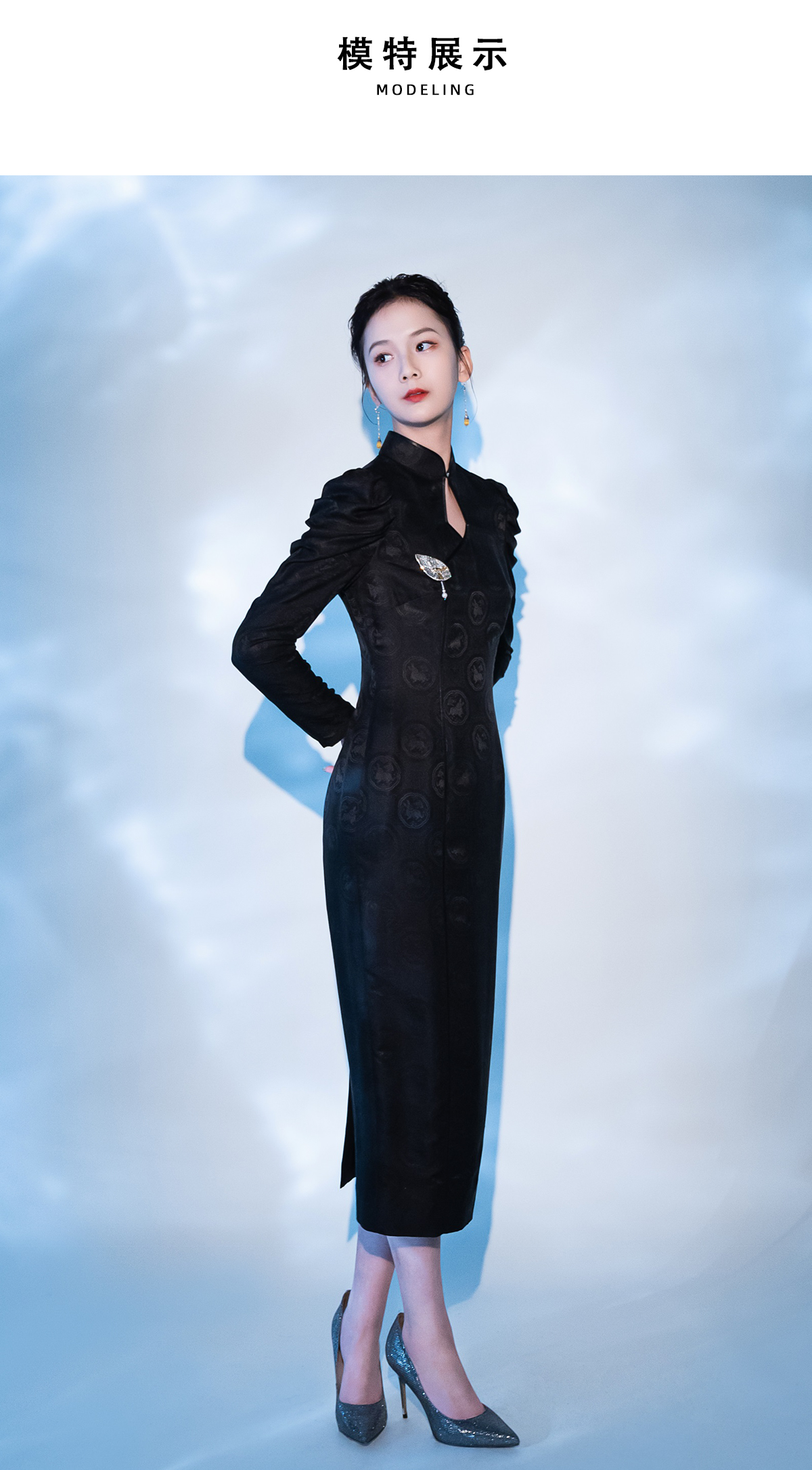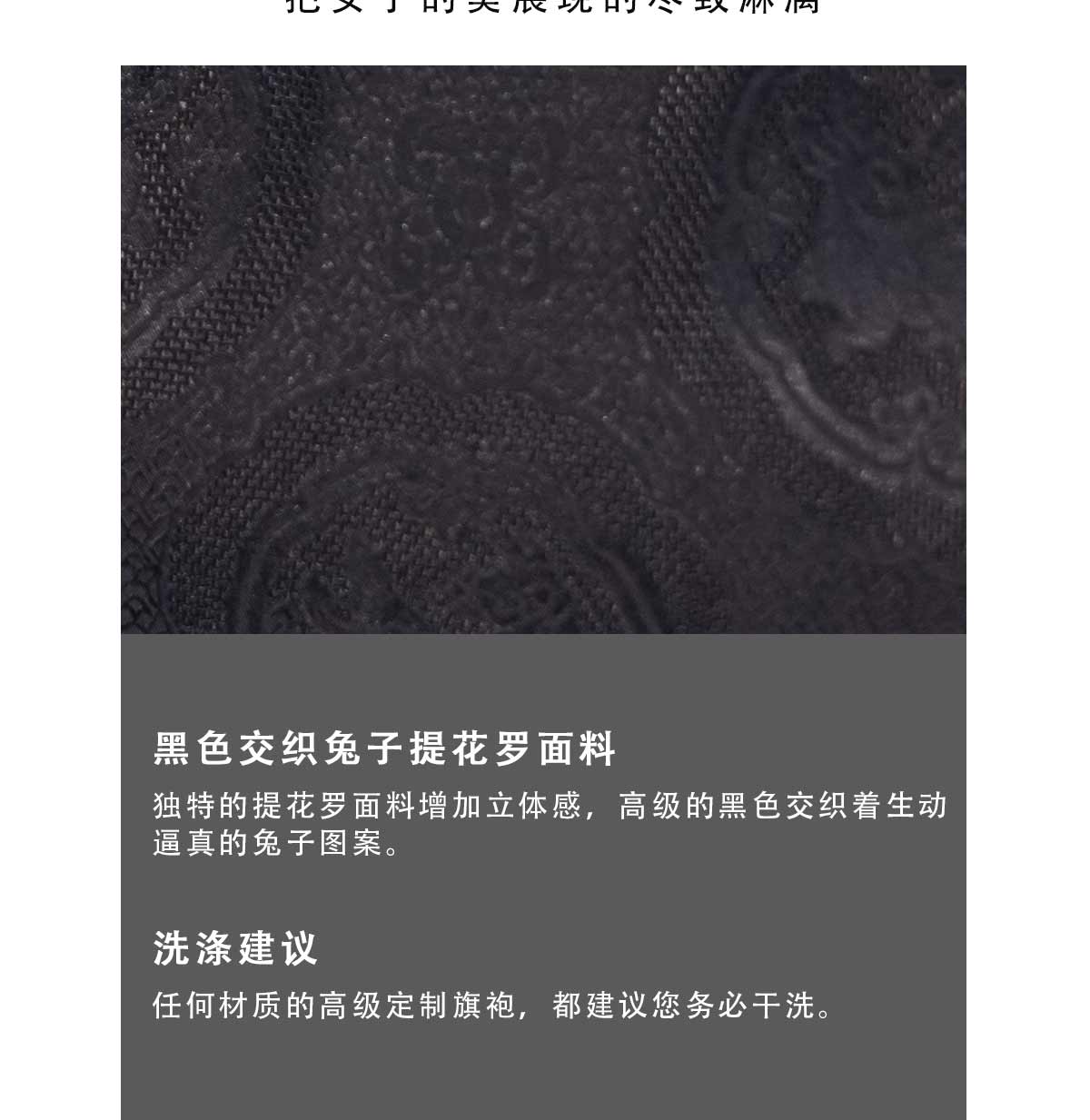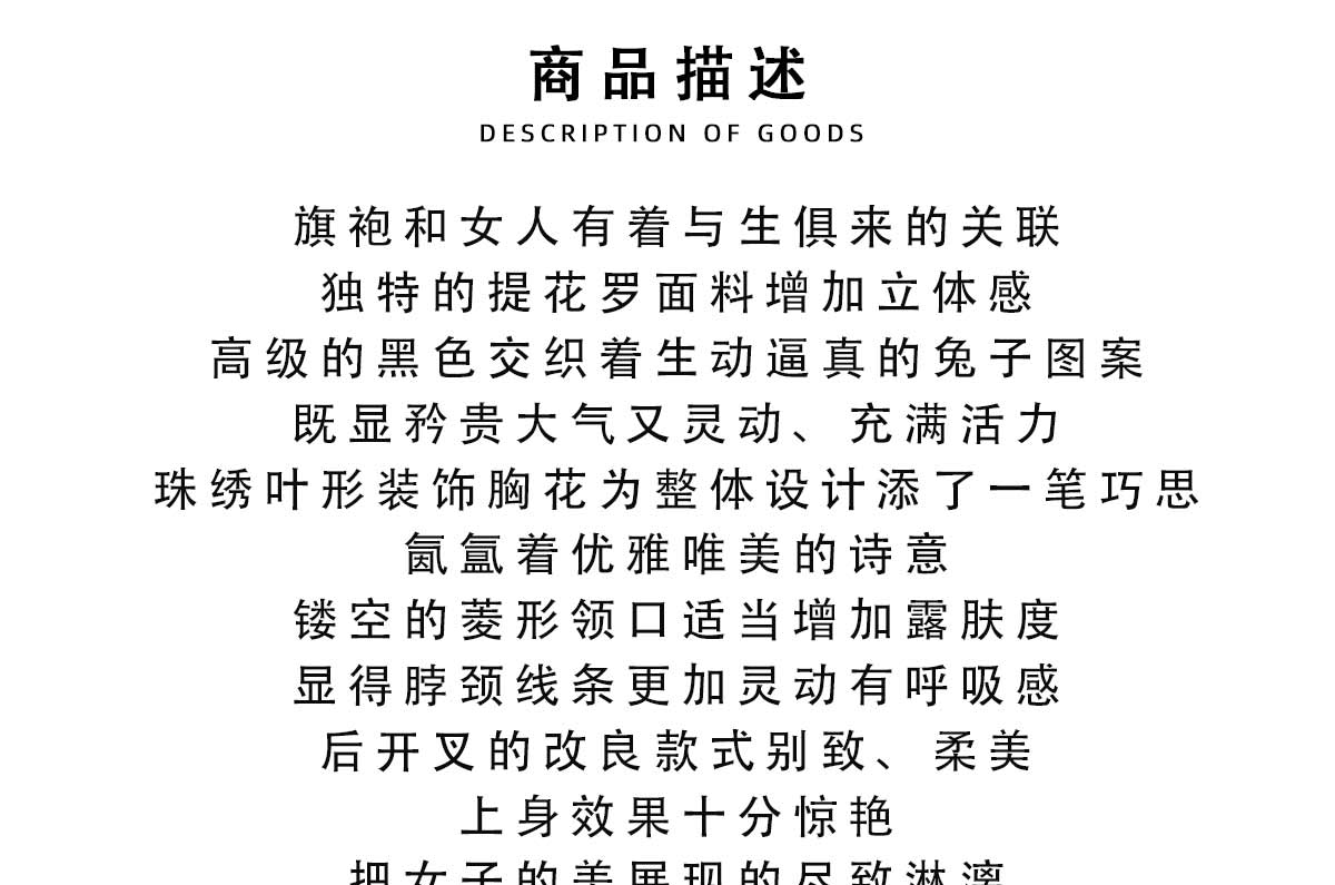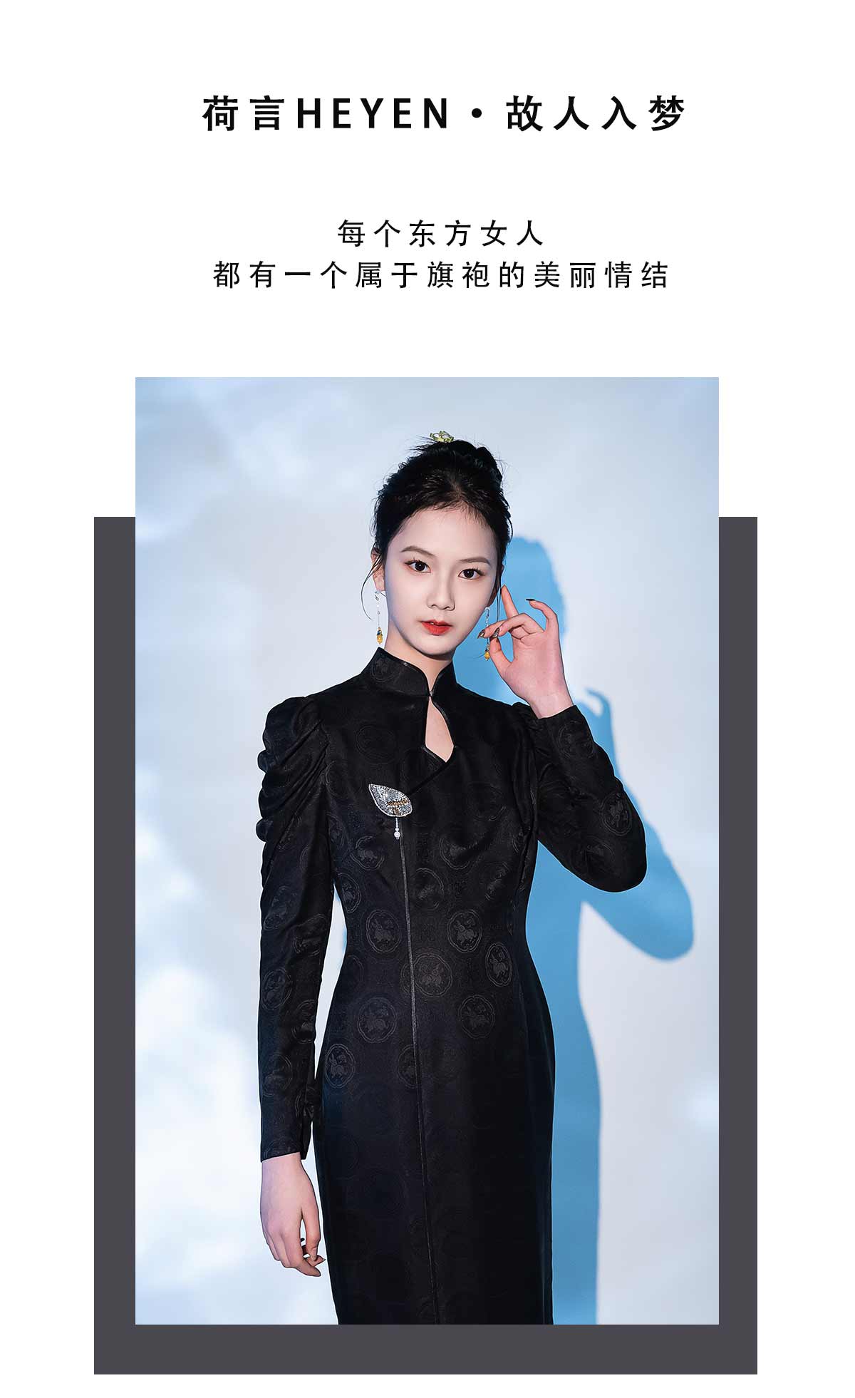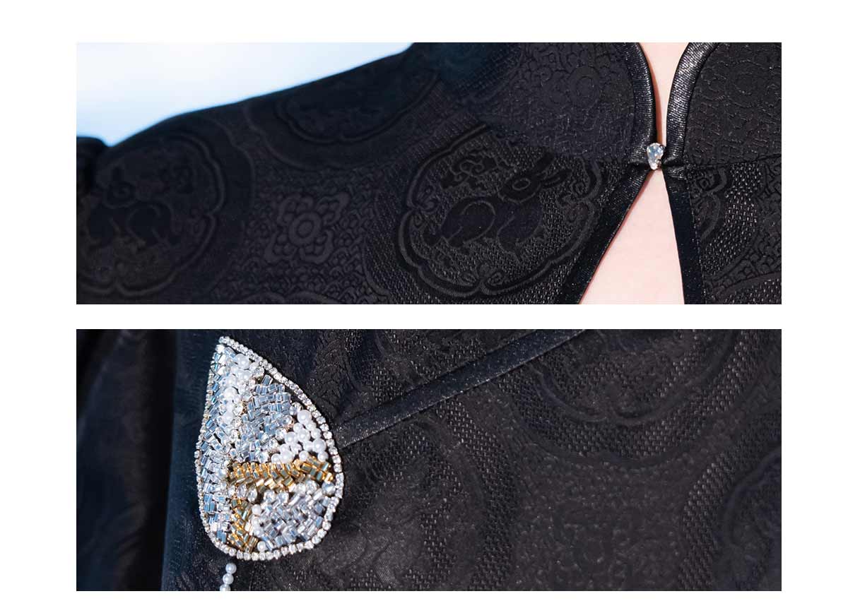 荷言HEYEN 故人入梦 黑色交织兔子提花罗面料+复古小羊腿袖+珠绣叶形装饰胸花+镂空菱形领口后开叉设计纯手定制工旗袍 定制不退换