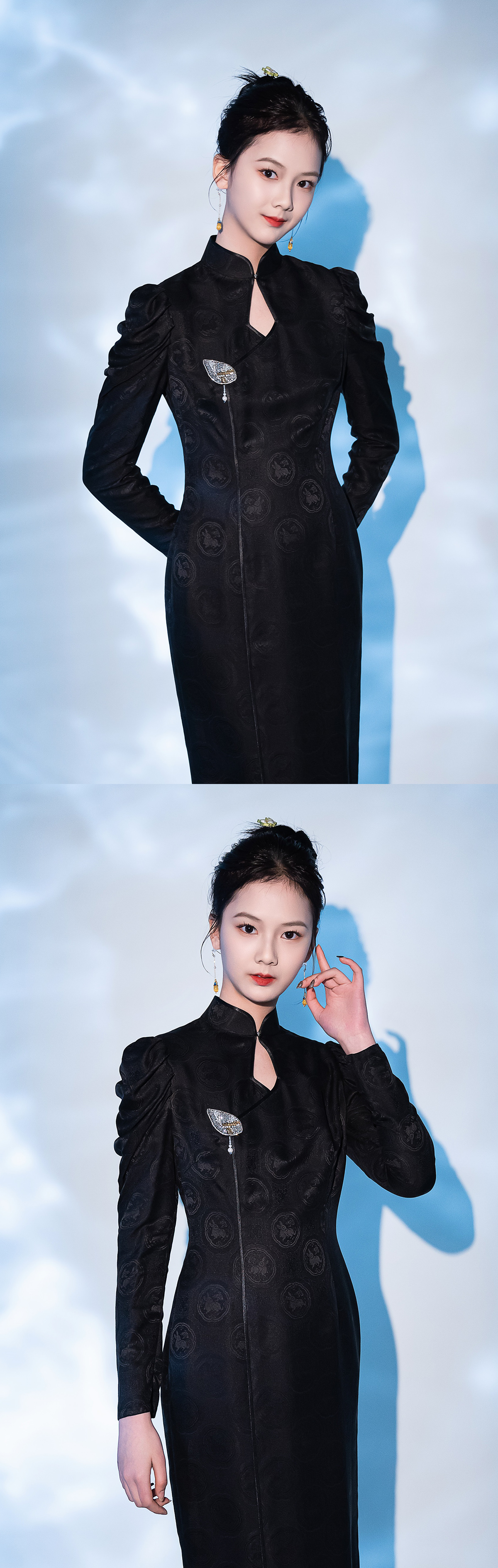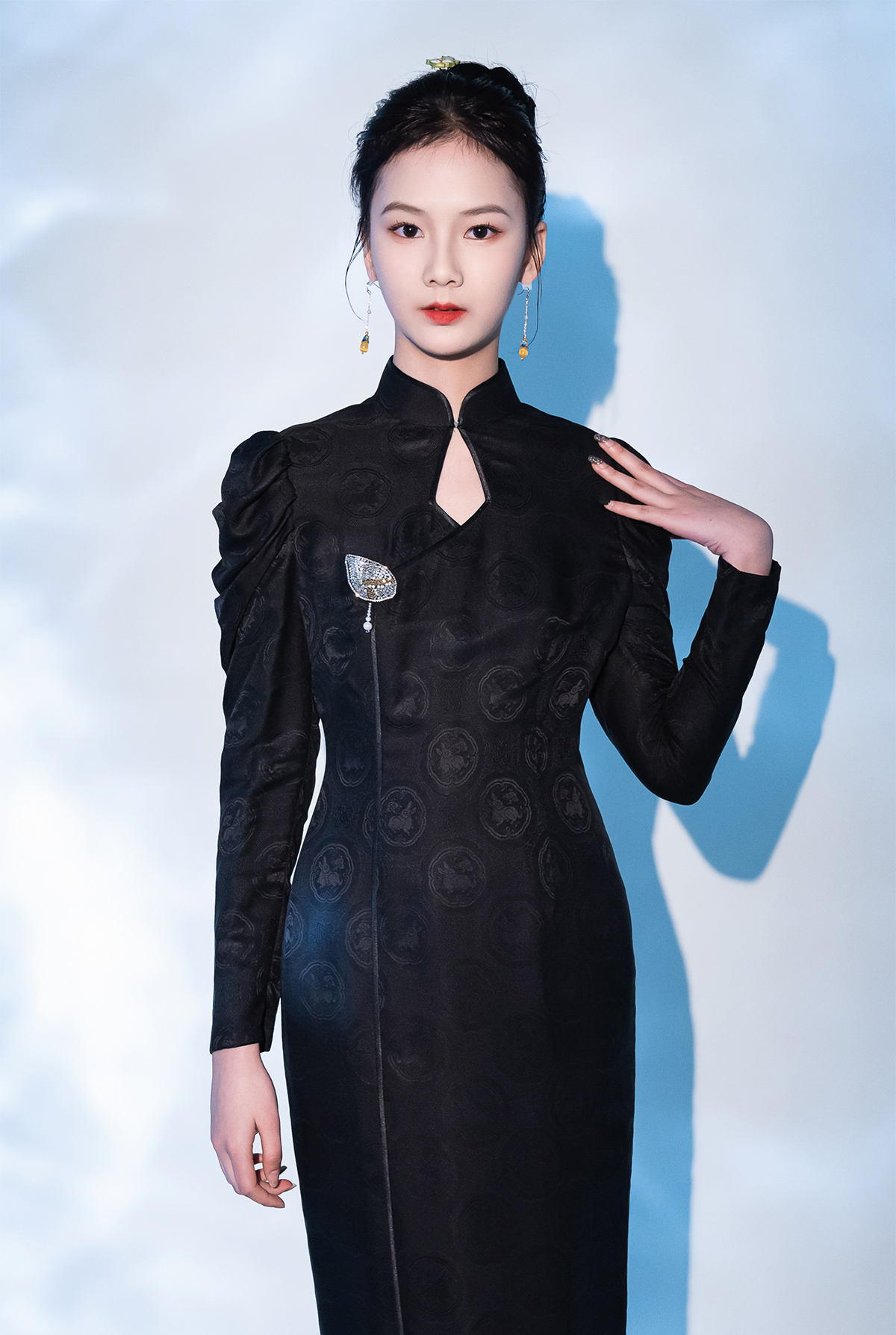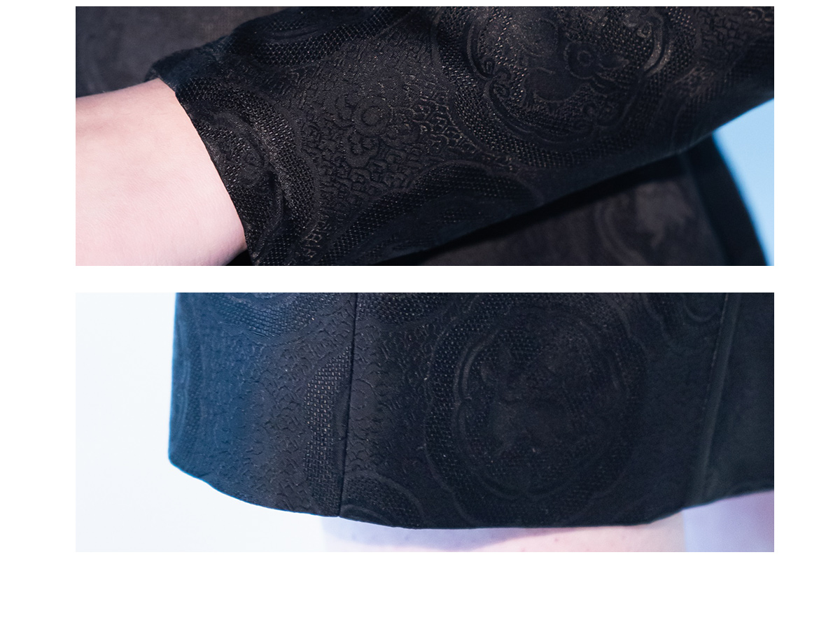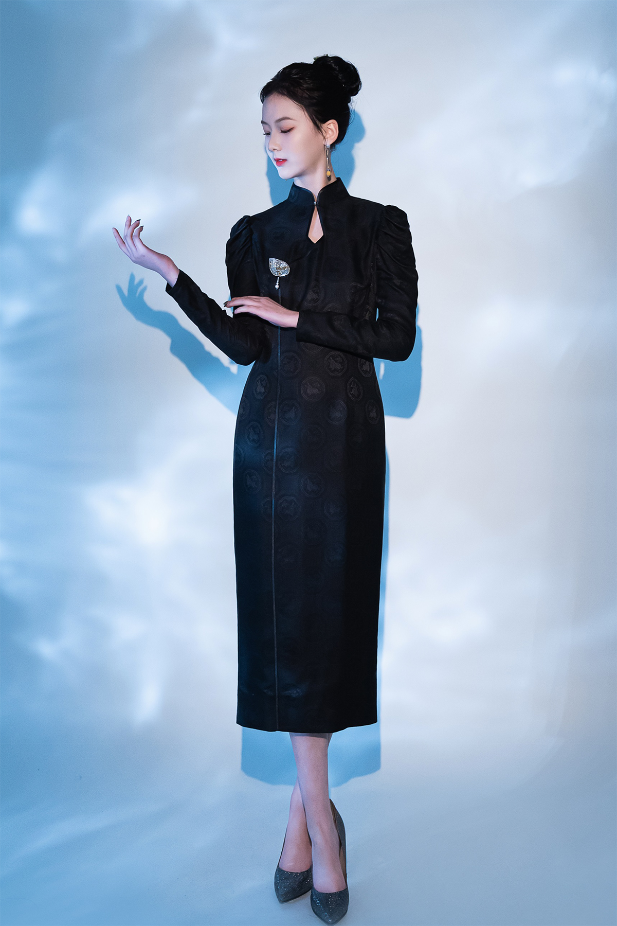 荷言HEYEN 故人入梦 黑色交织兔子提花罗面料+复古小羊腿袖+珠绣叶形装饰胸花+镂空菱形领口后开叉设计纯手定制工旗袍 定制不退换