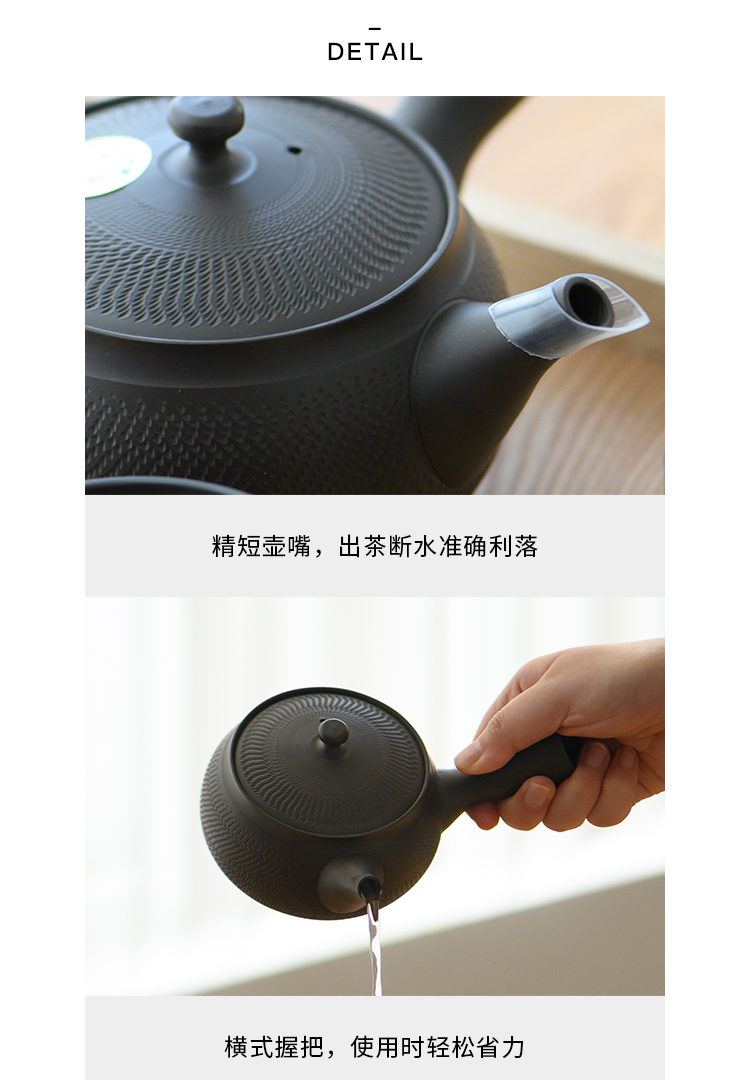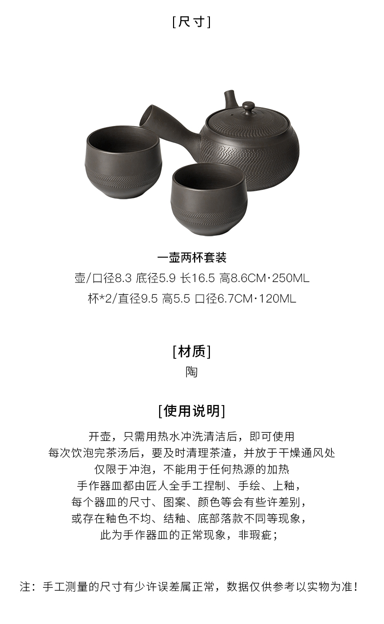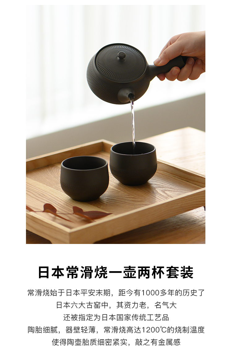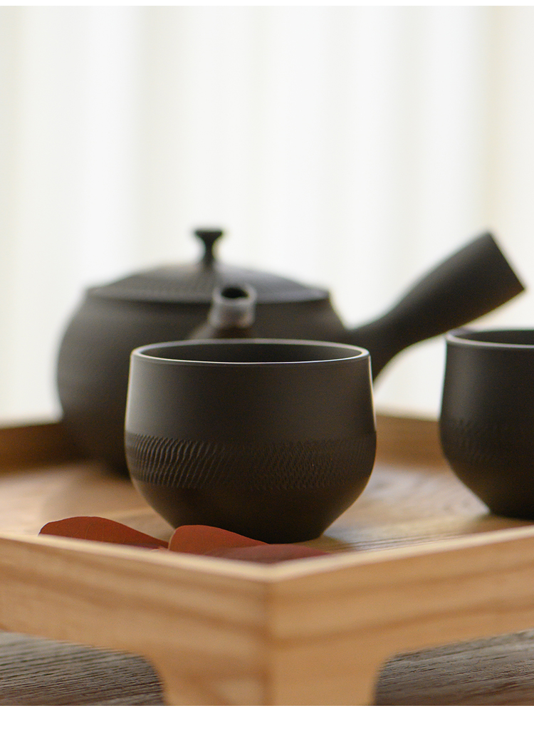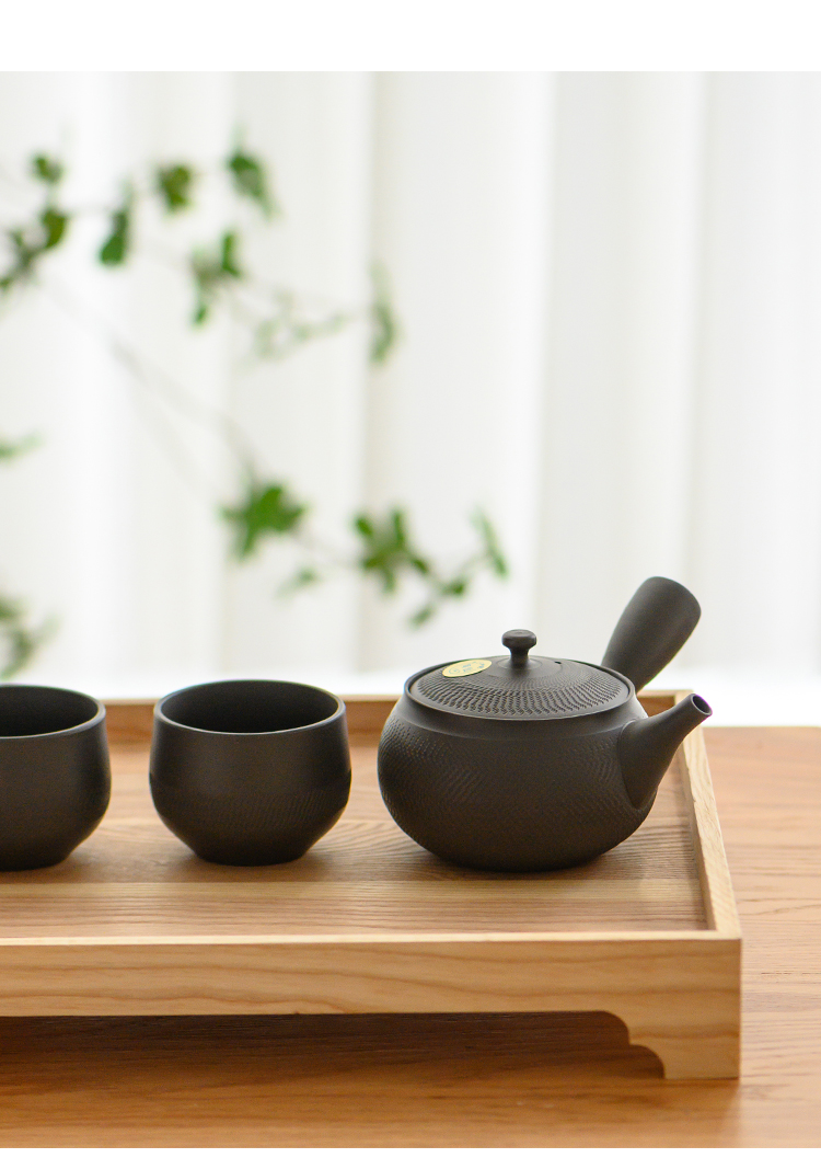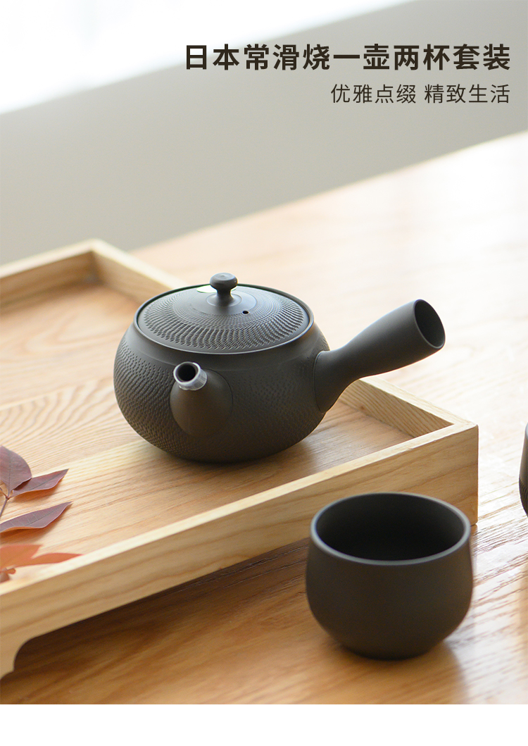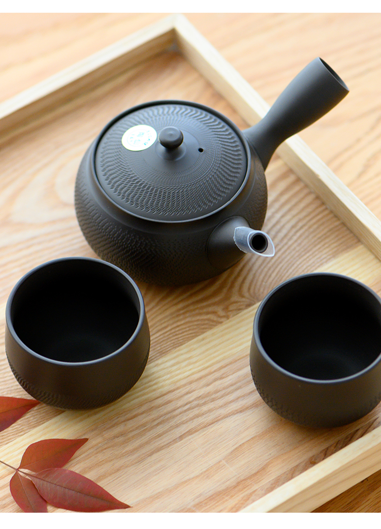 【特惠6折】日本进口常滑烧急须壶 陶仙手作黑泥雕纹一壶二杯侧把泡茶壶套装