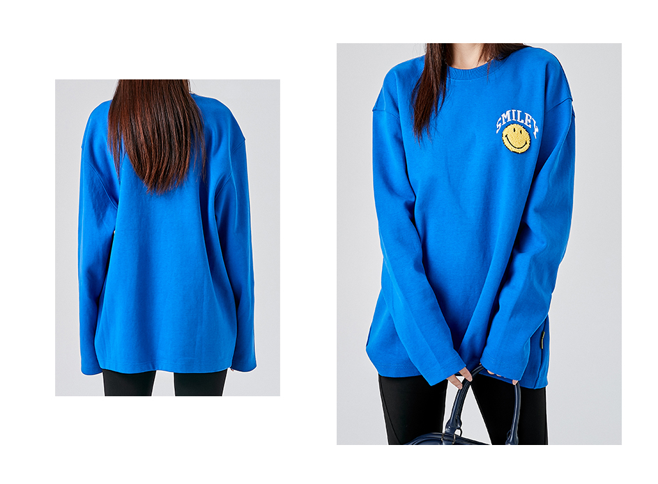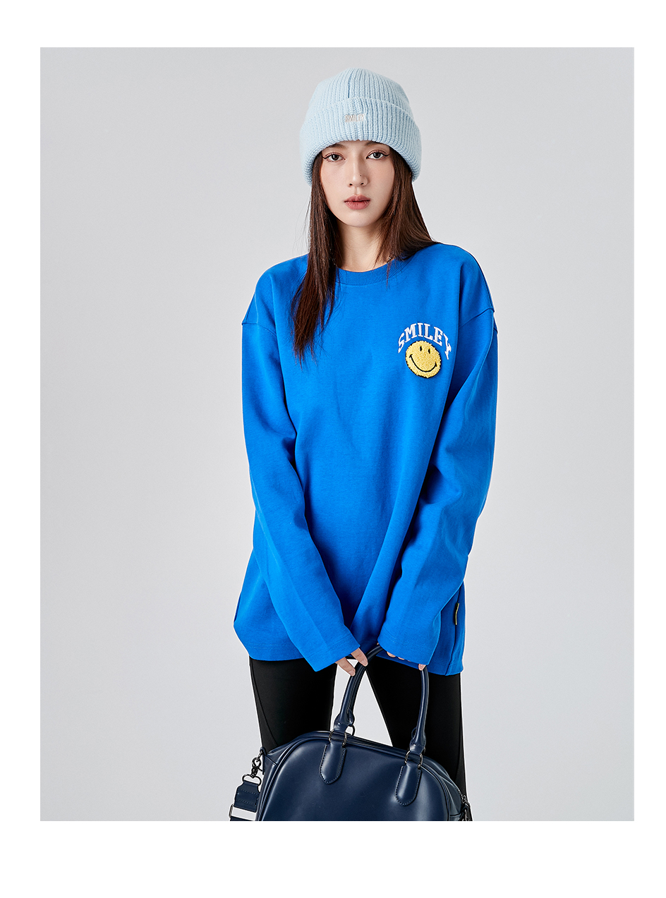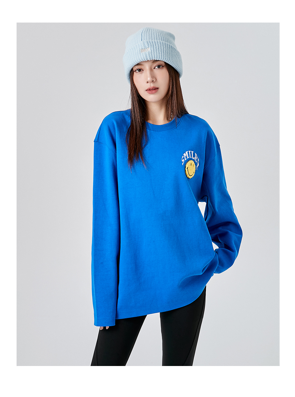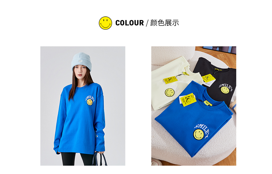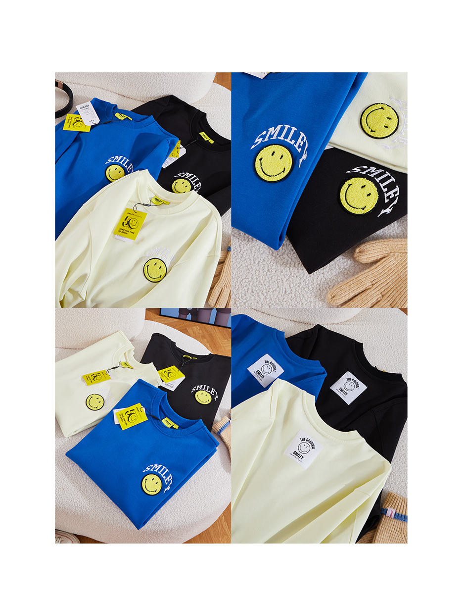 【品名】:字母刺绣笑脸贴标圆领卫衣