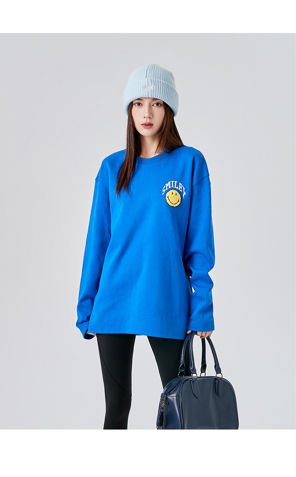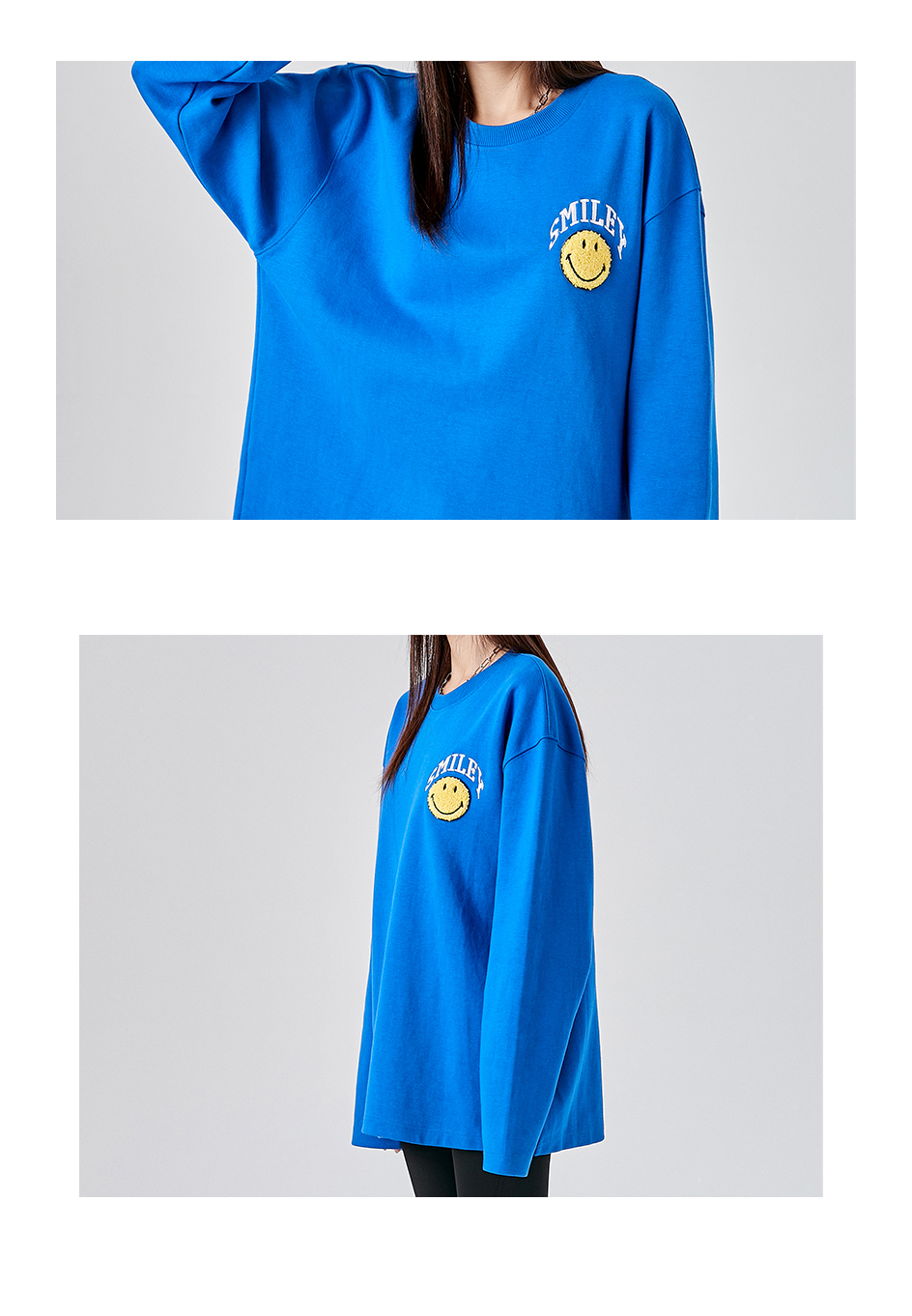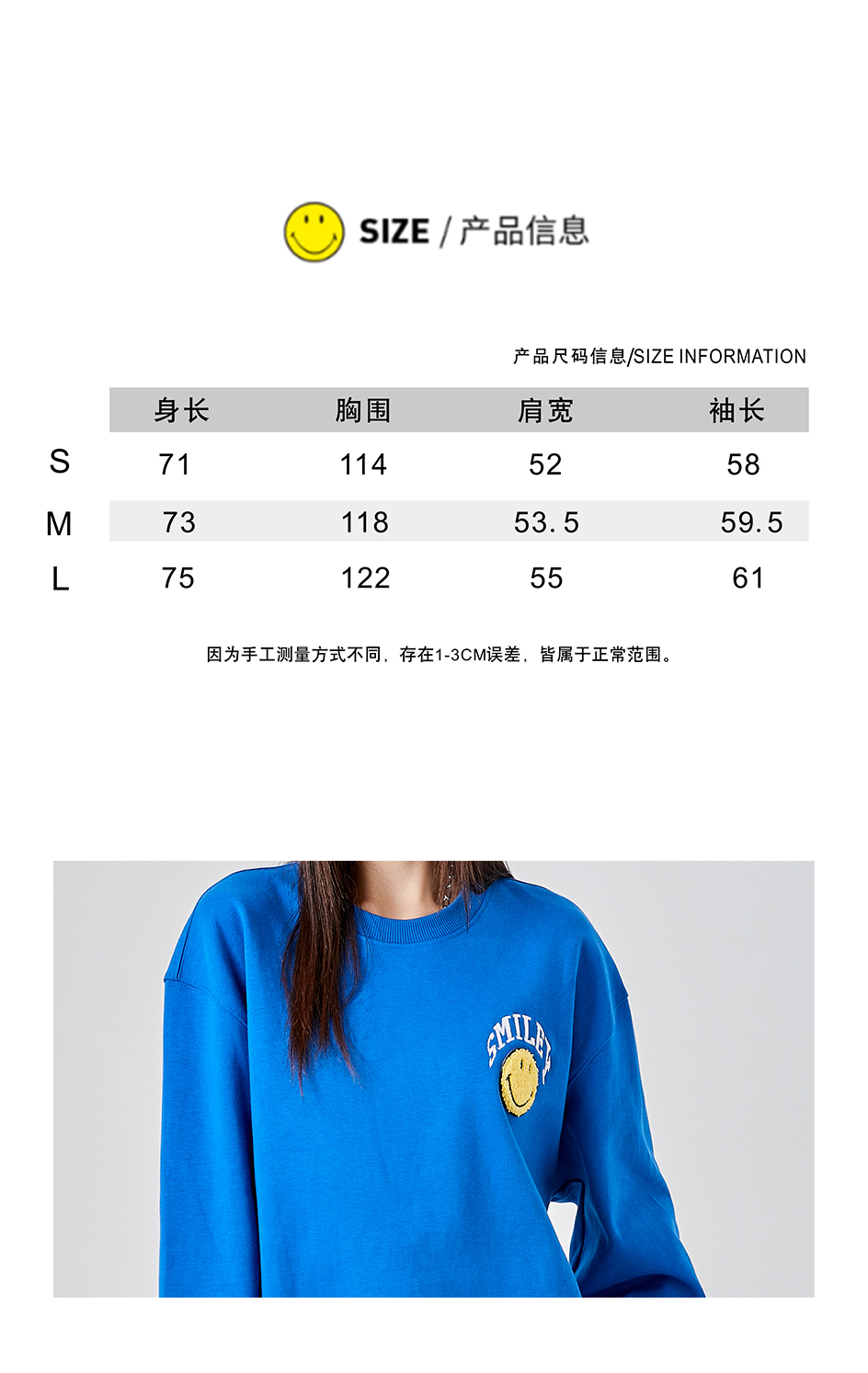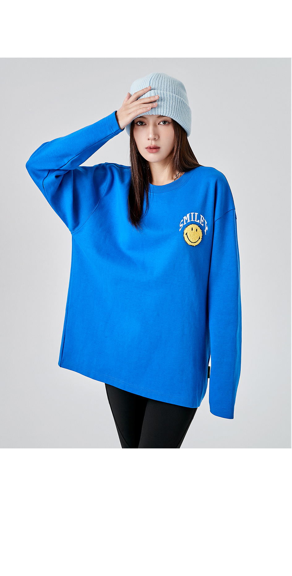 【品名】:字母刺绣笑脸贴标圆领卫衣
