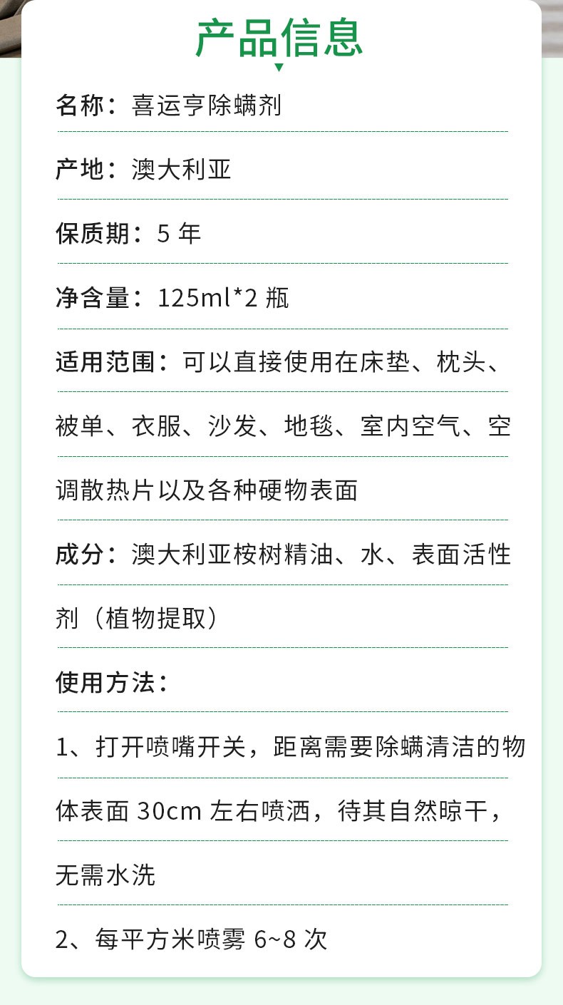喜运亨澳洲进口 除螨喷雾剂除螨剂去螨虫床上用免洗植物杀菌抑菌祛螨除螨除螨虫喷剂杀虫剂喷雾 除螨免洗喷雾【2瓶装礼盒装】
