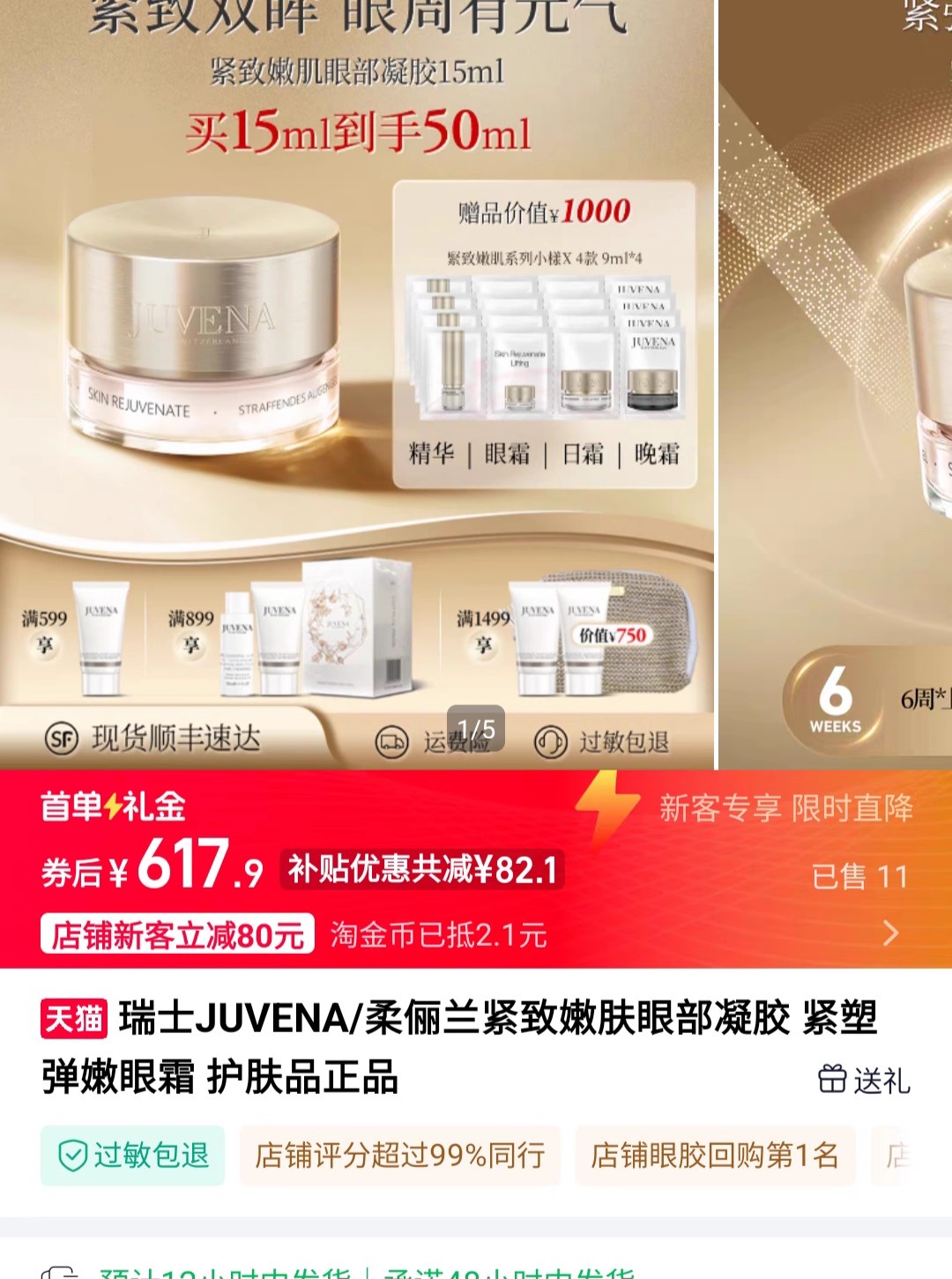 【清仓好价】瑞士JUVENA柔俪兰紧致嫩肤眼部凝胶 紧塑弹嫩眼霜15ml 有盒无封 眼霜瓶口有封口