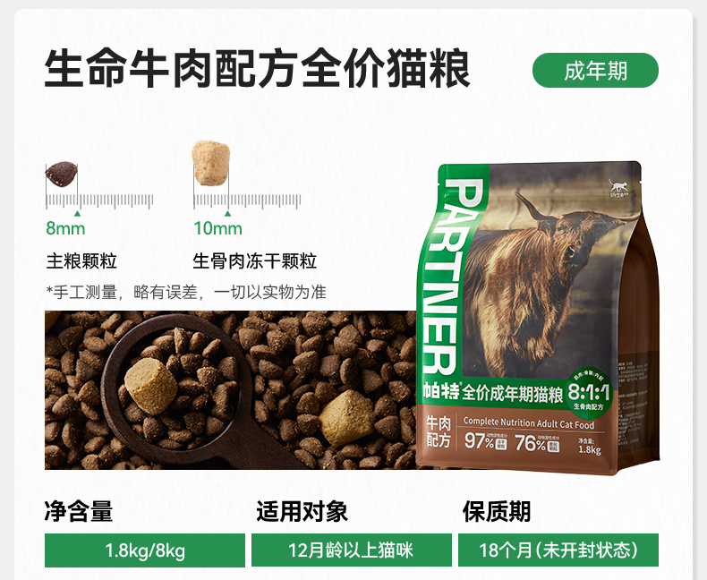 帕特全价成年期猫粮 (牛肉配方、生骨肉混合)