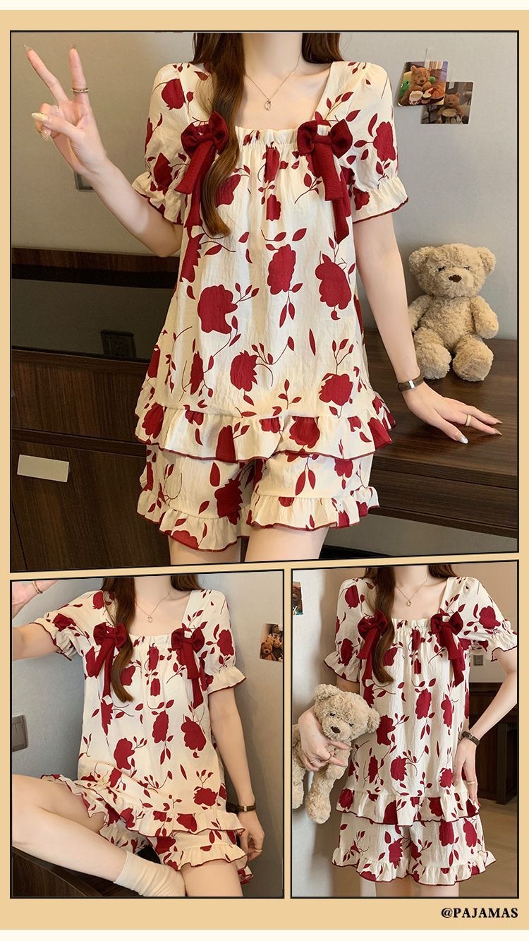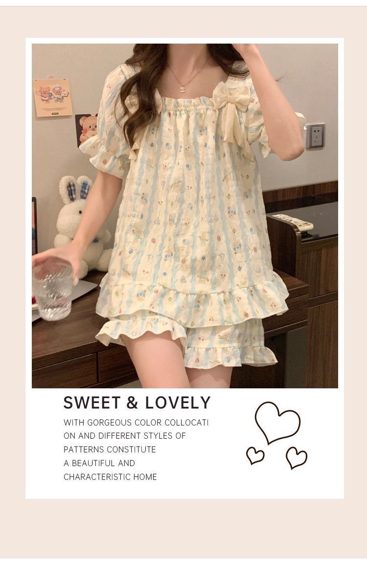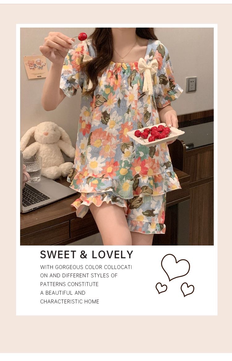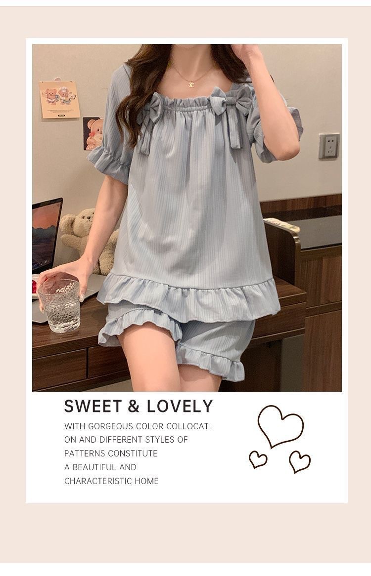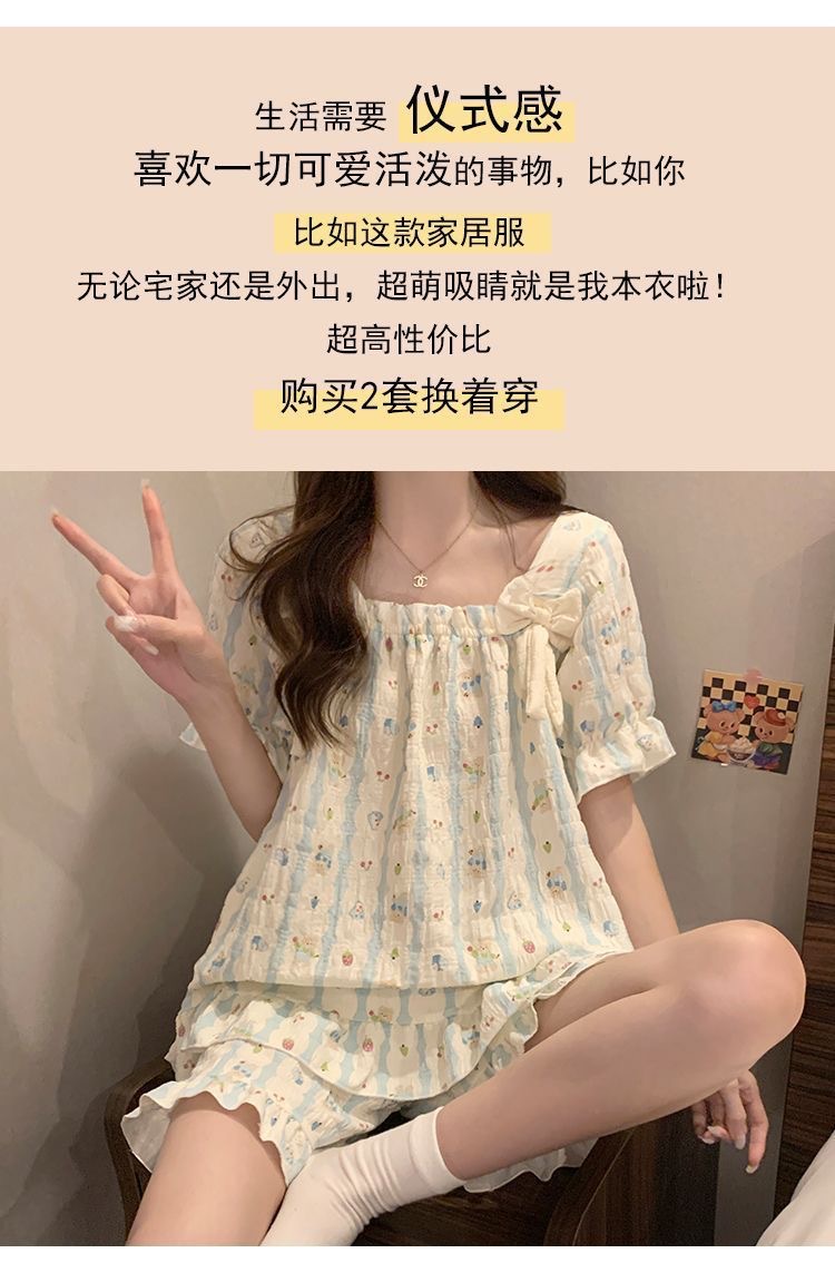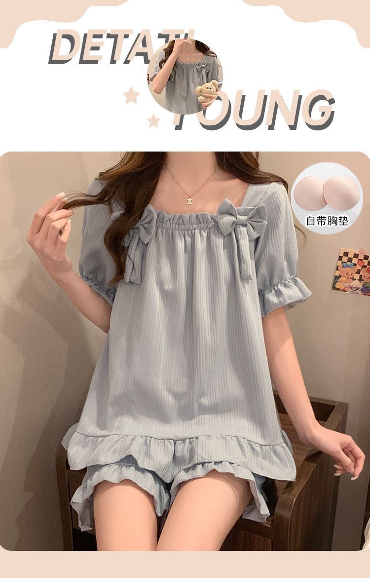 【带胸垫❗薄款短袖套装睡衣】新型亲肤面料家居服,活性印染,透气面料,柔软舒适,不起丢不掉色,薄款防凸点可爱蝴蝶结甜美夏季套装家居服QQ