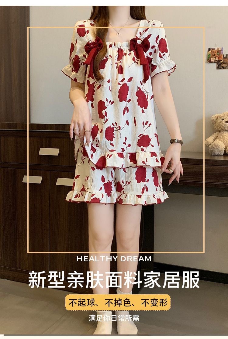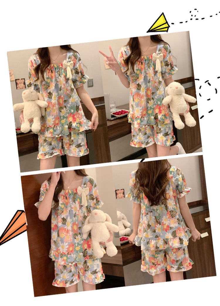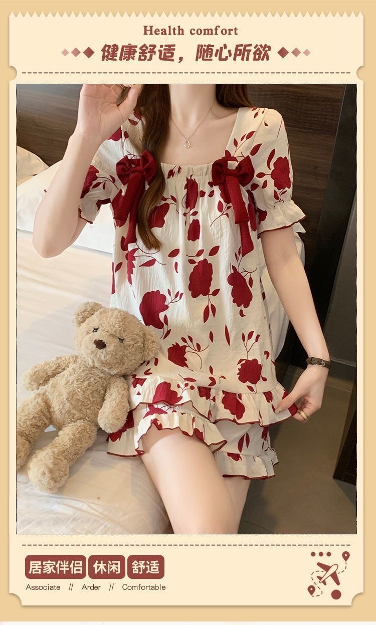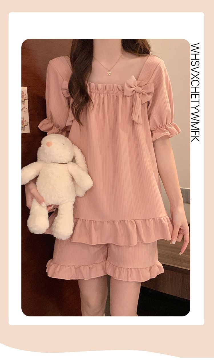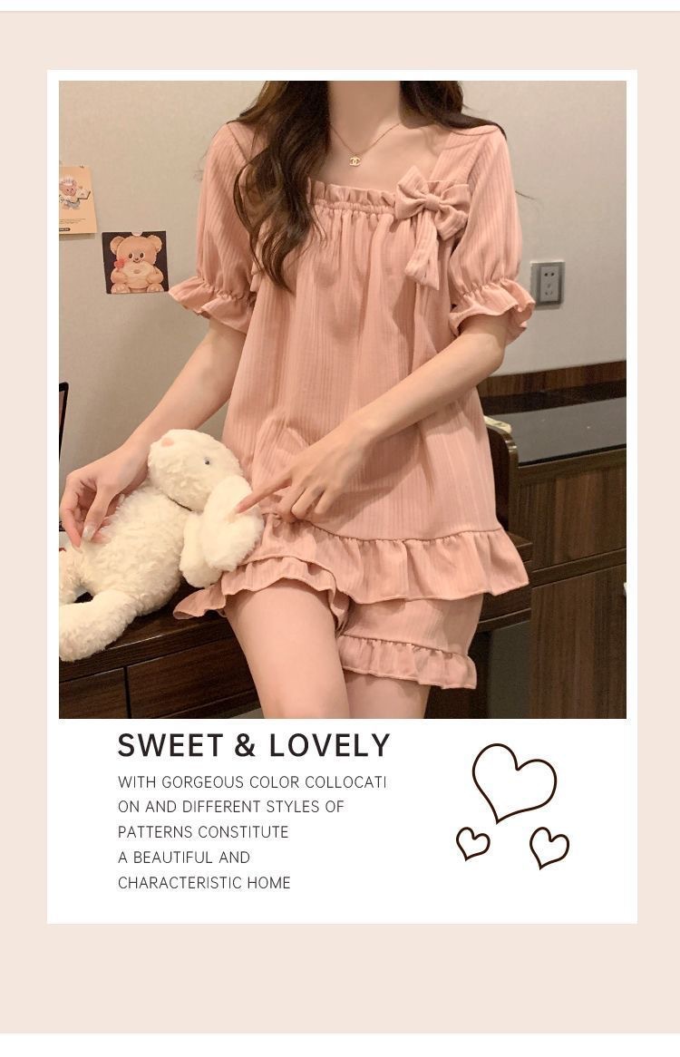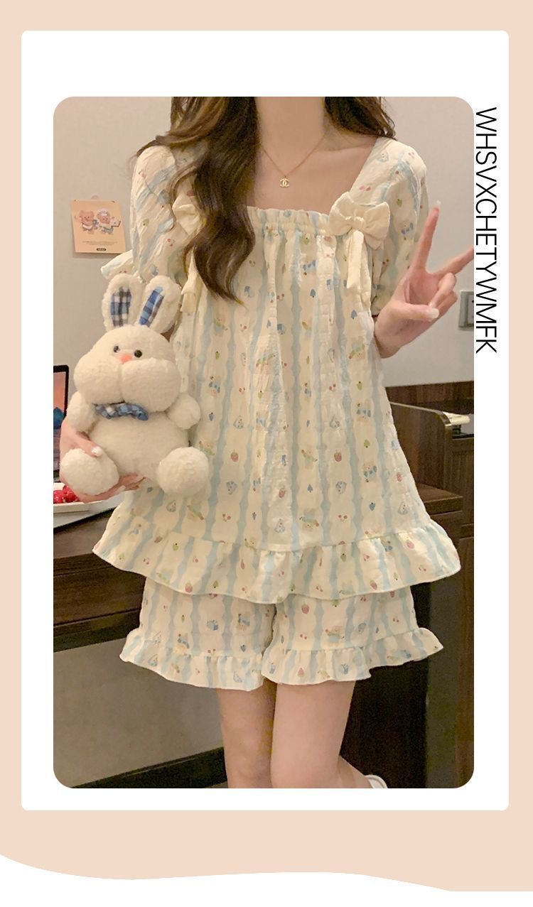 【带胸垫❗薄款短袖套装睡衣】新型亲肤面料家居服,活性印染,透气面料,柔软舒适,不起丢不掉色,薄款防凸点可爱蝴蝶结甜美夏季套装家居服QQ