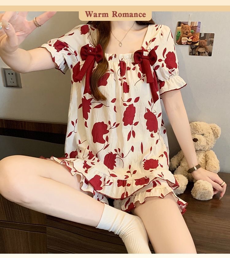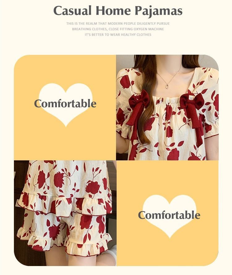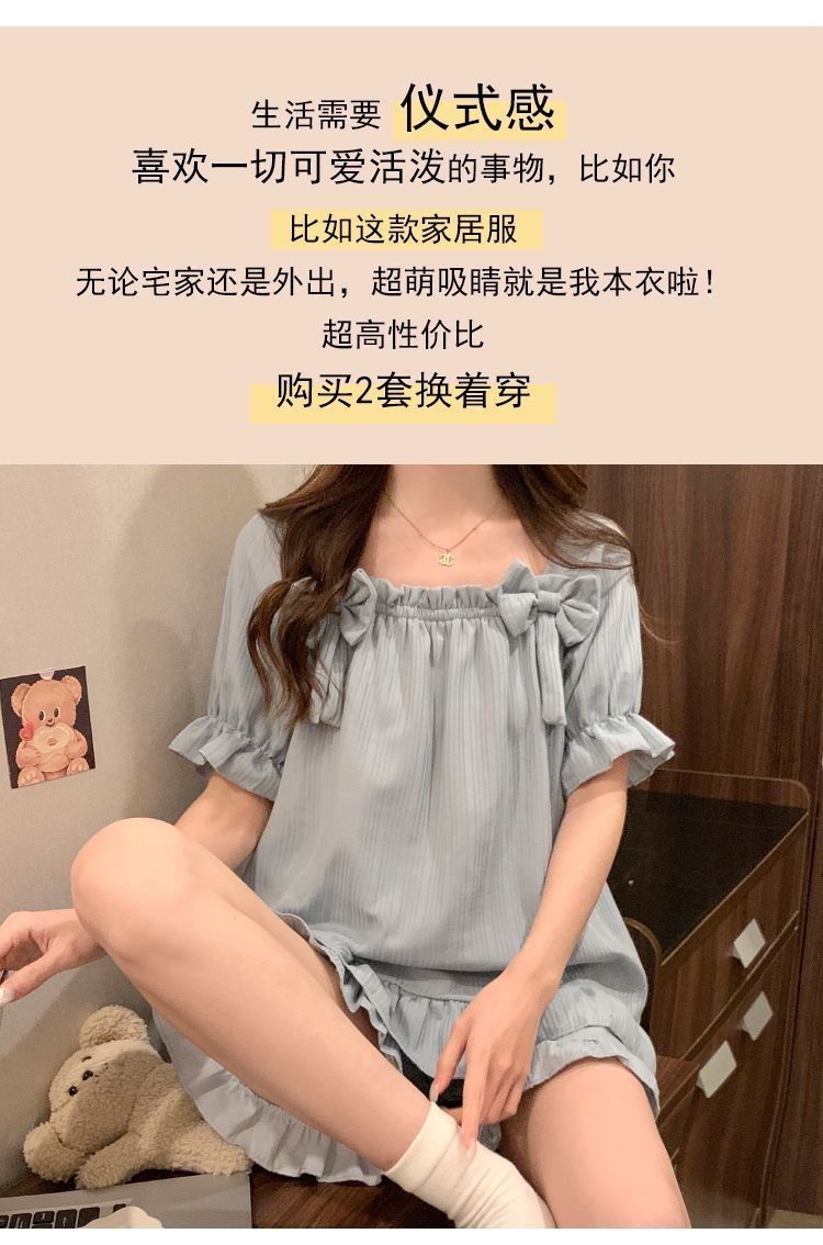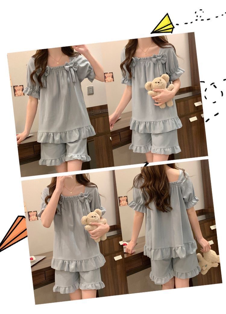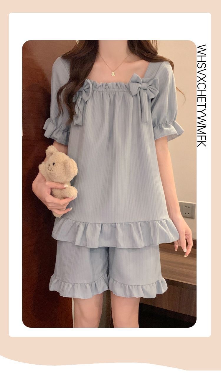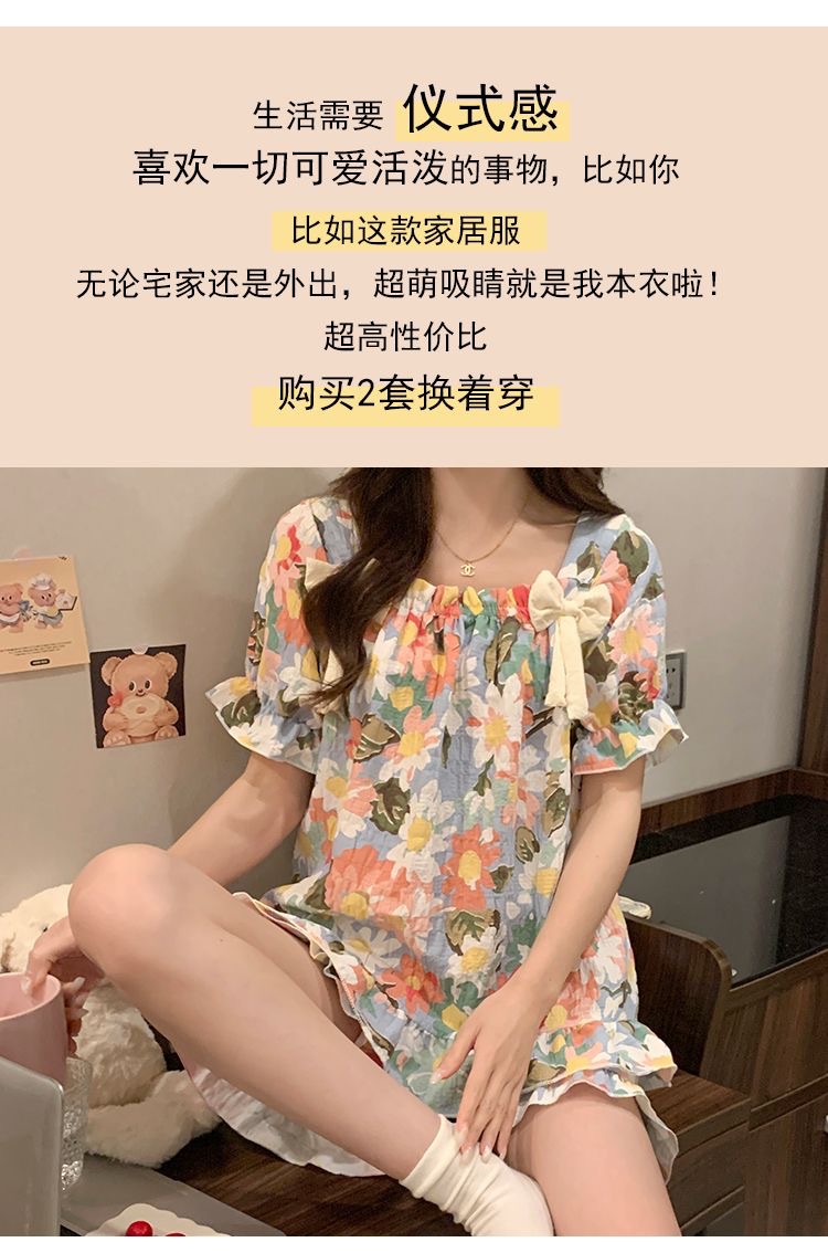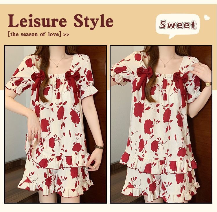 【带胸垫❗薄款短袖套装睡衣】新型亲肤面料家居服,活性印染,透气面料,柔软舒适,不起丢不掉色,薄款防凸点可爱蝴蝶结甜美夏季套装家居服QQ