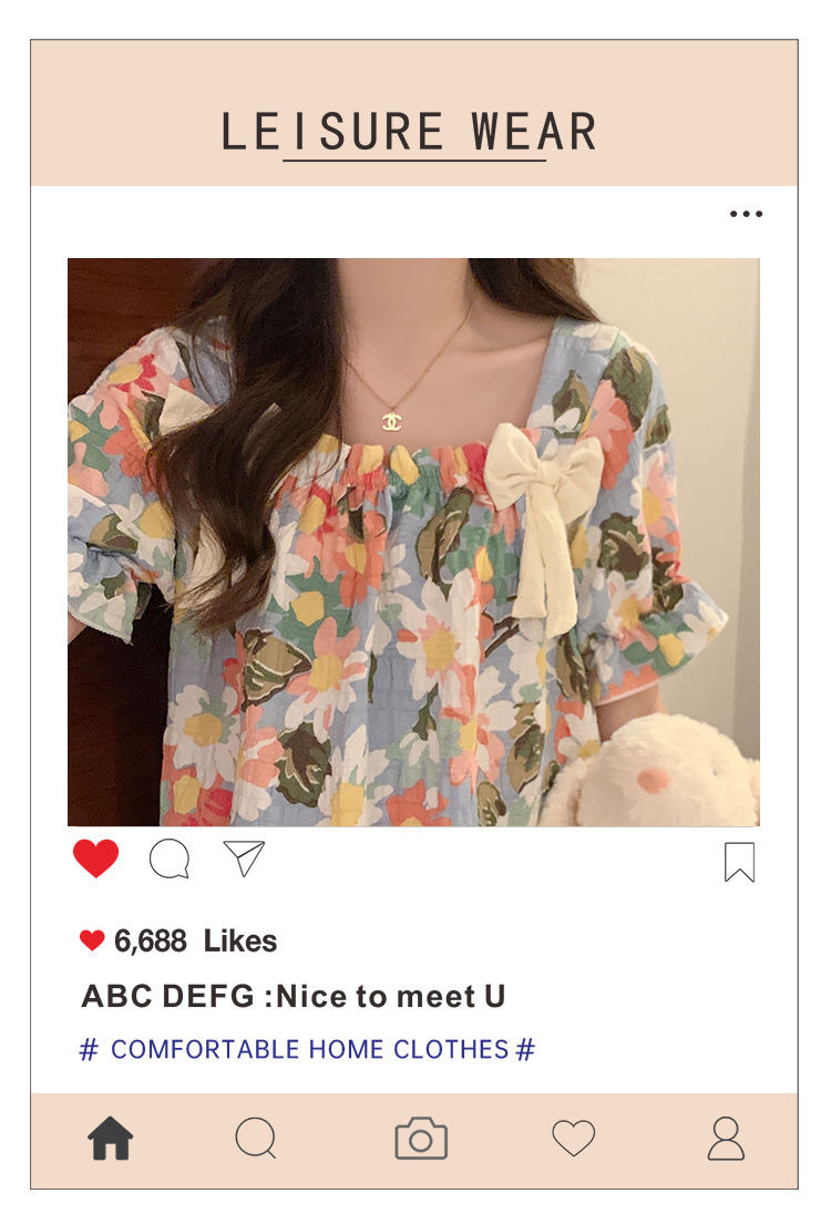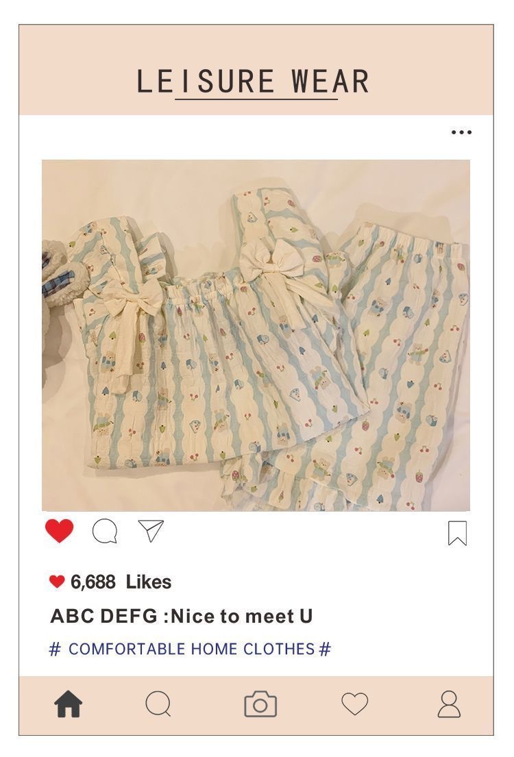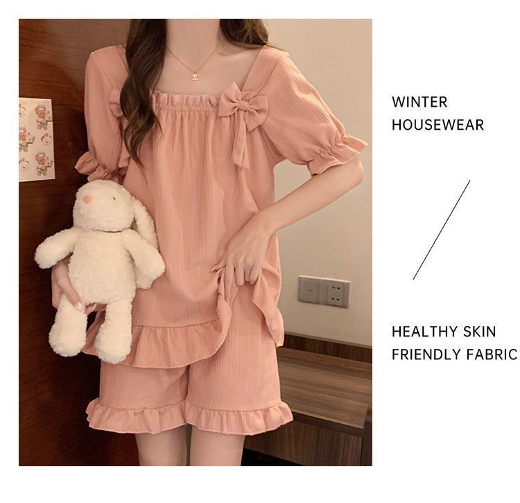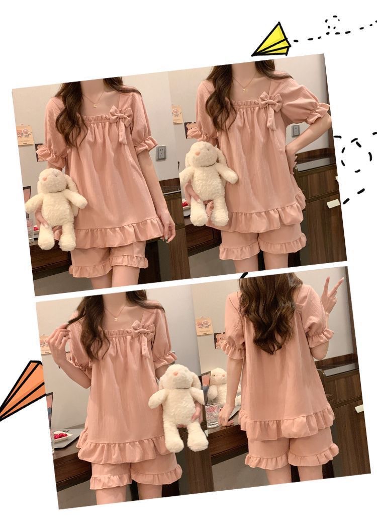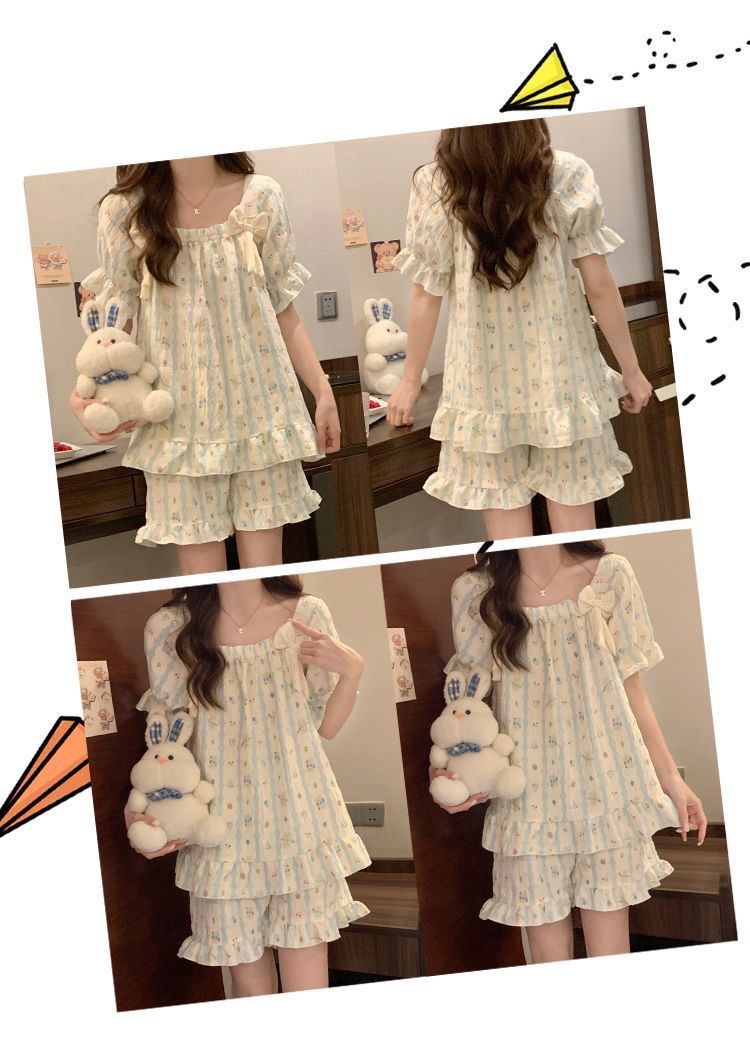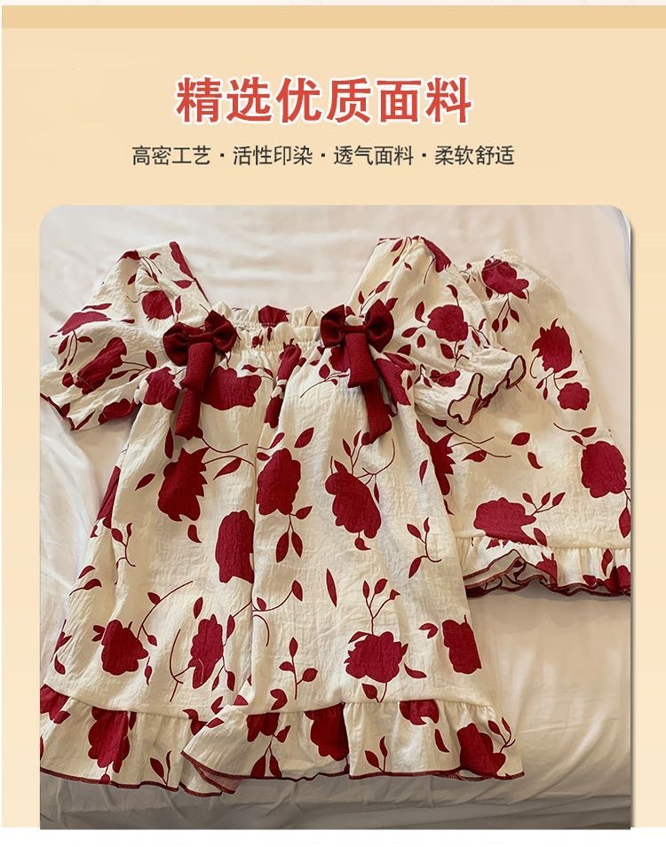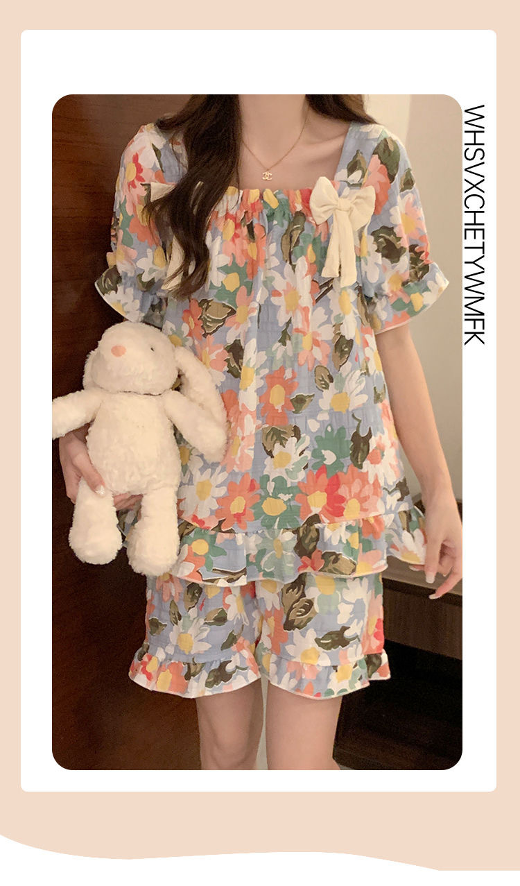 【带胸垫❗薄款短袖套装睡衣】新型亲肤面料家居服,活性印染,透气面料,柔软舒适,不起丢不掉色,薄款防凸点可爱蝴蝶结甜美夏季套装家居服QQ