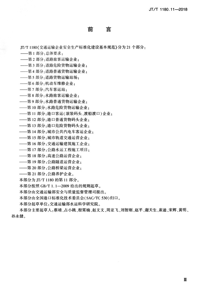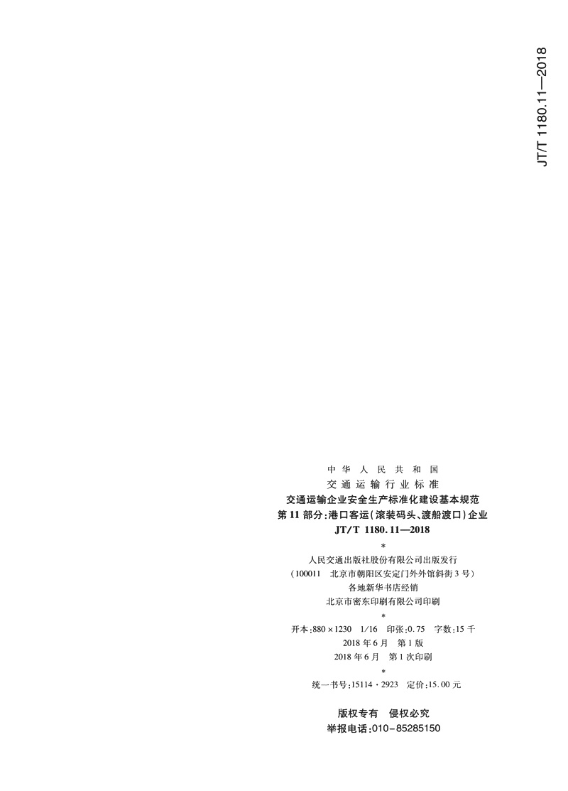书名:交通运输企业安全生产标准化建设基本规范 第11部分:港口客运(滚装码头、渡船渡口)企业(JT/T 1180.11—2018)