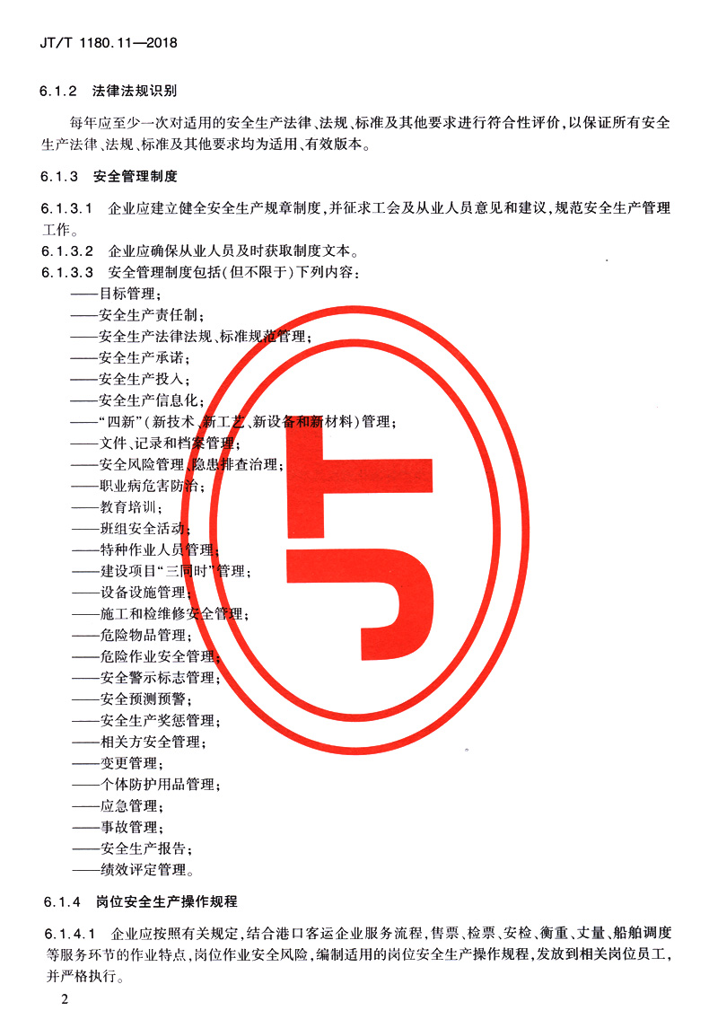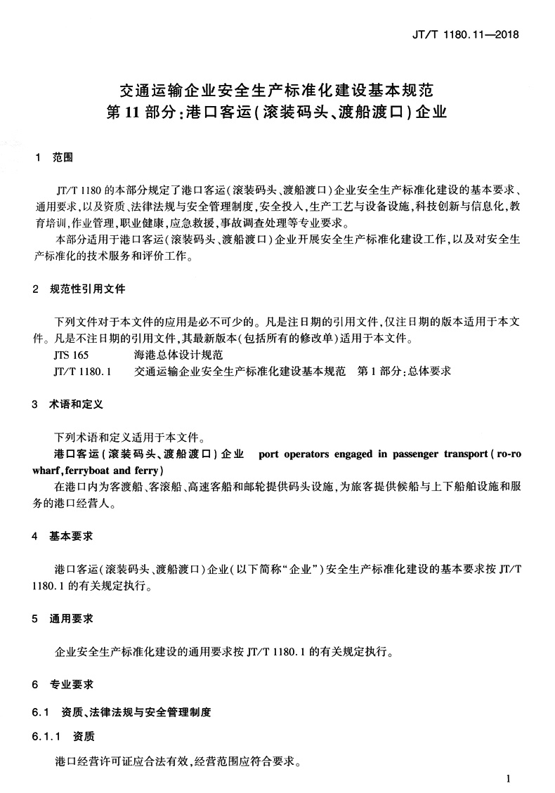 | 交通运输企业安全生产标准化建设基本规范 第11部分:港口客运(滚装码头、渡船渡口)企业(JT/T 1180.11—2018) | ||