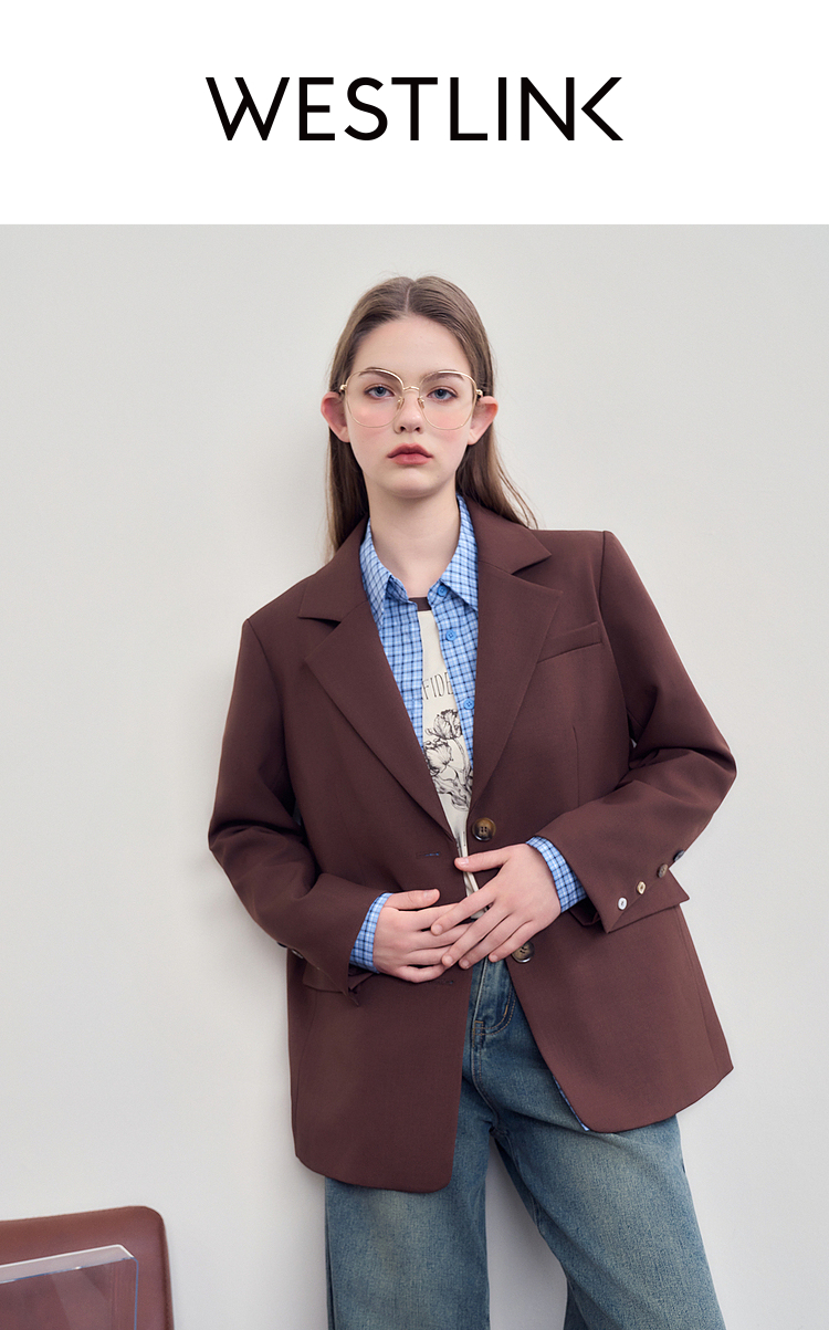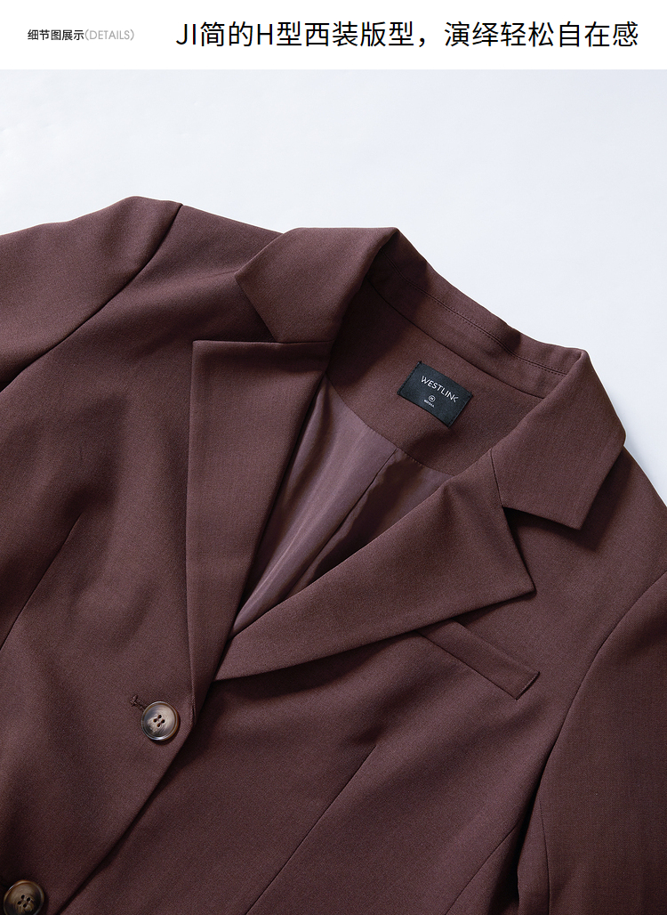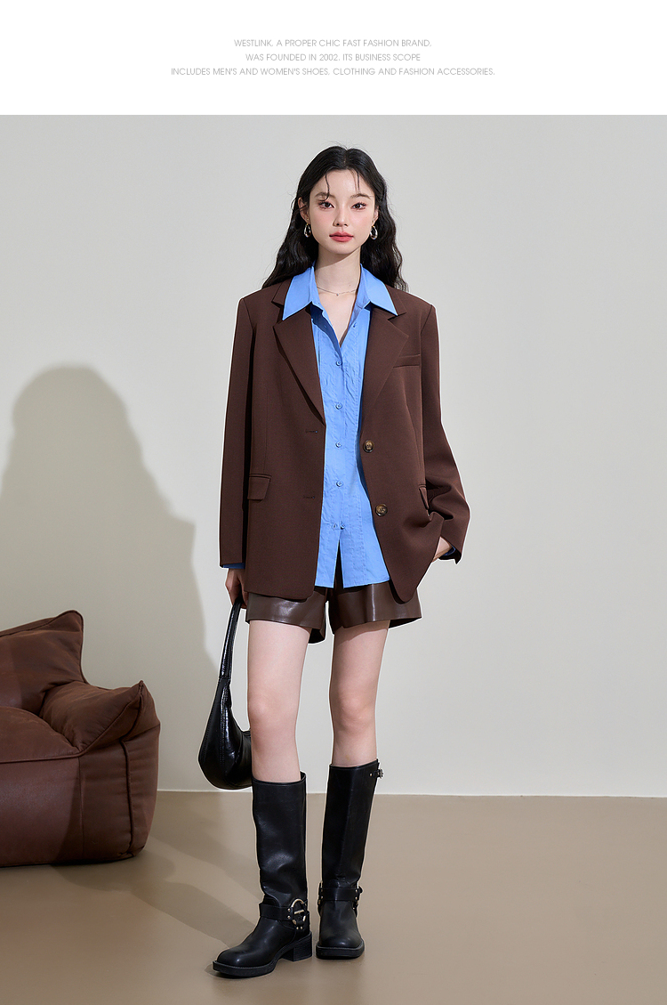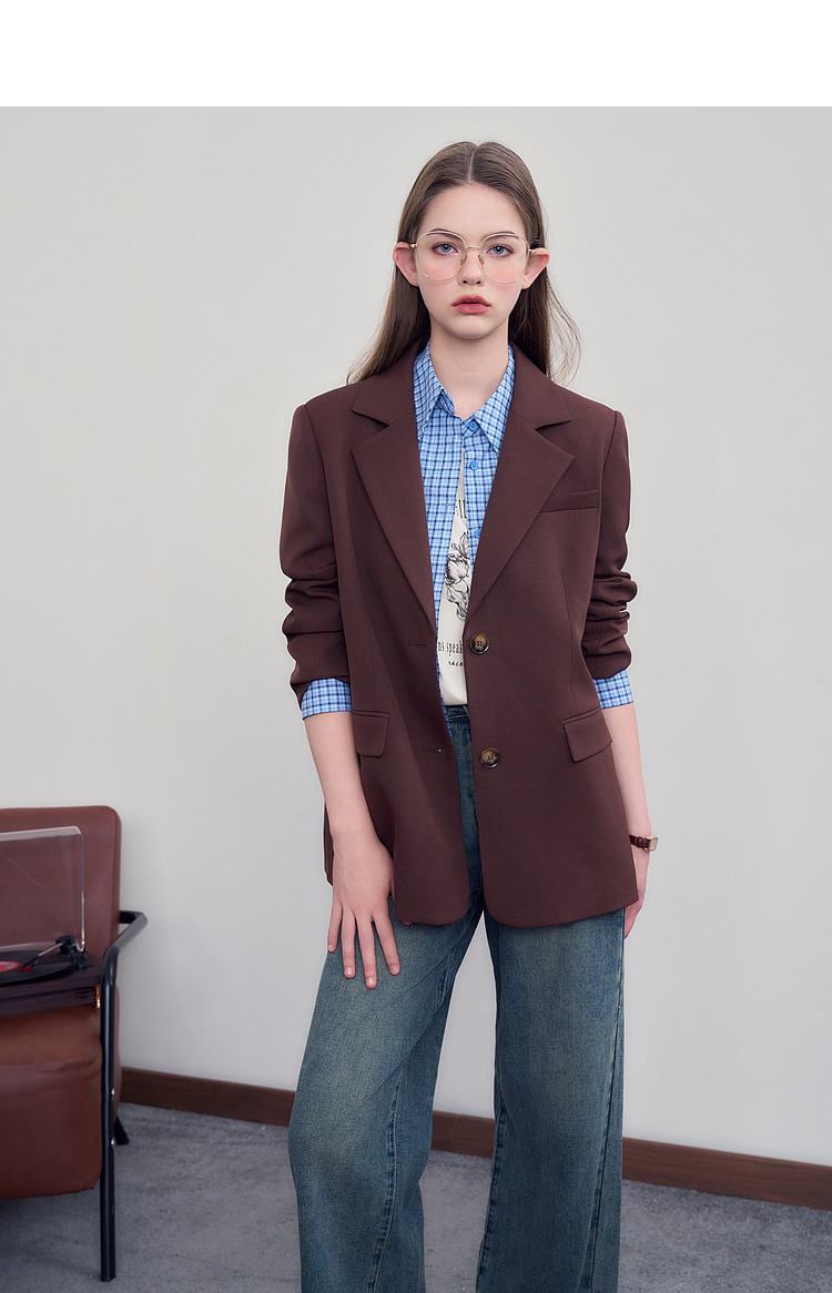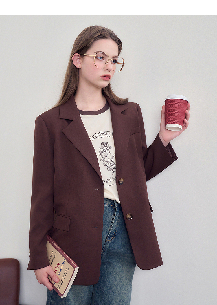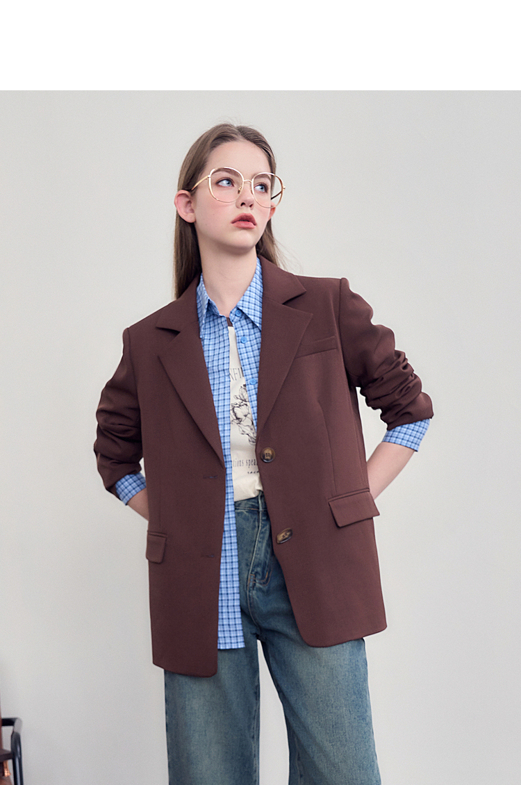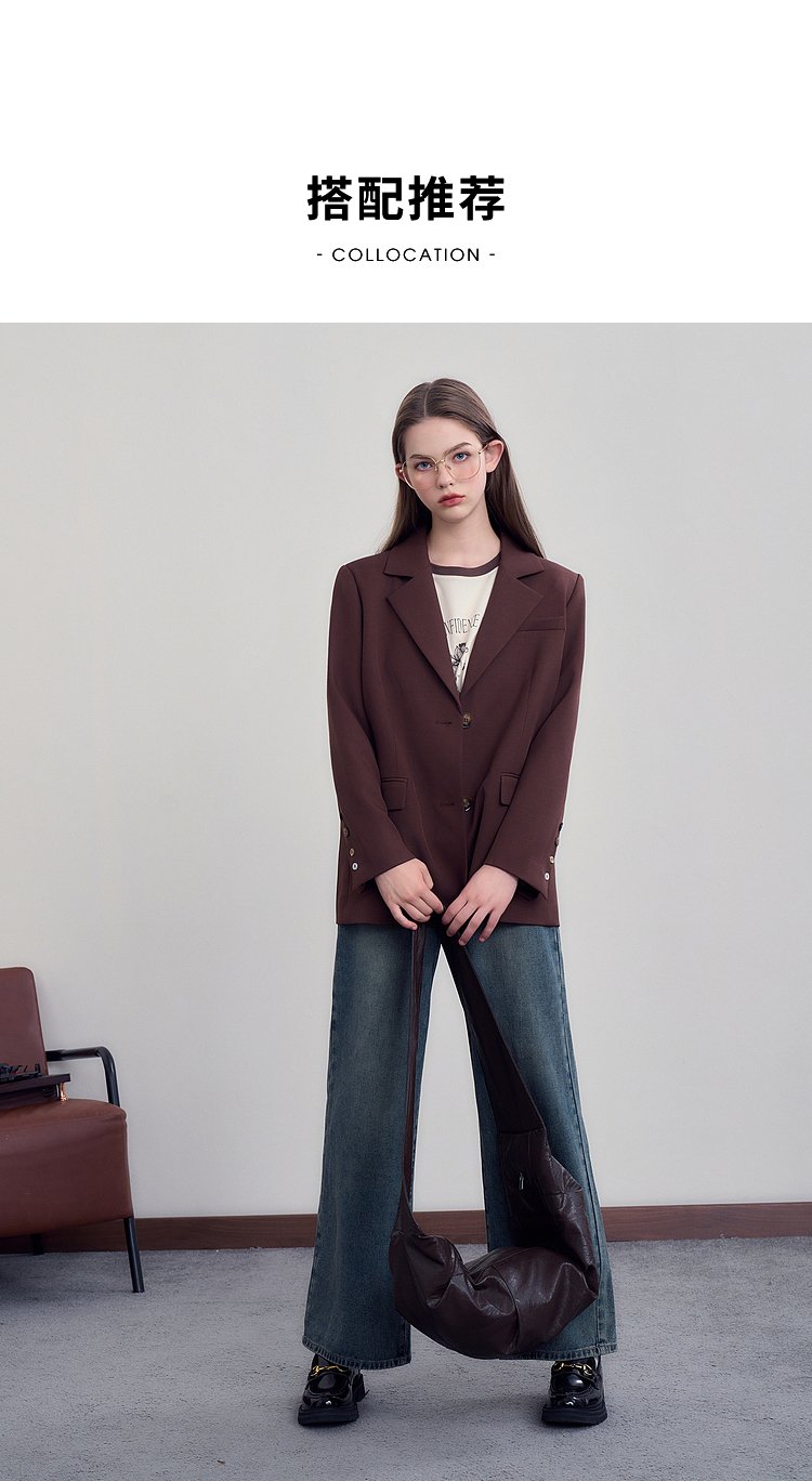 西遇咖色西装外套女新款宽松翻领垫肩正装休闲西服D3342232