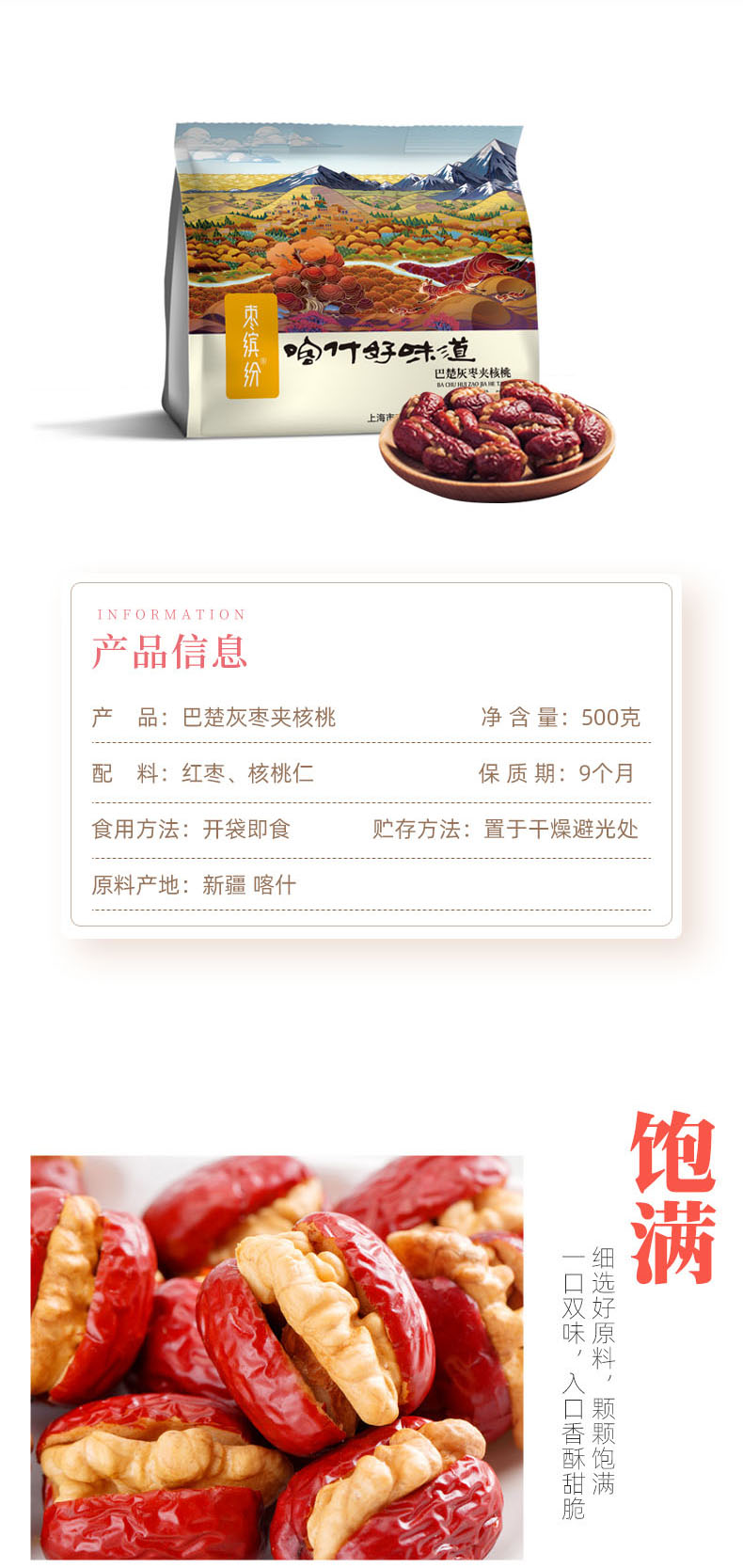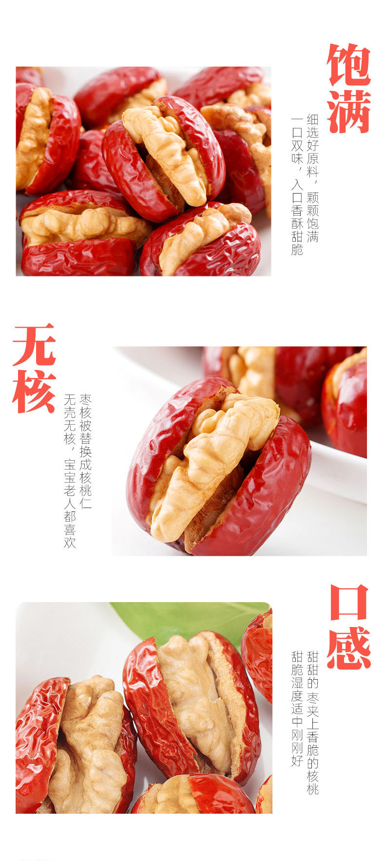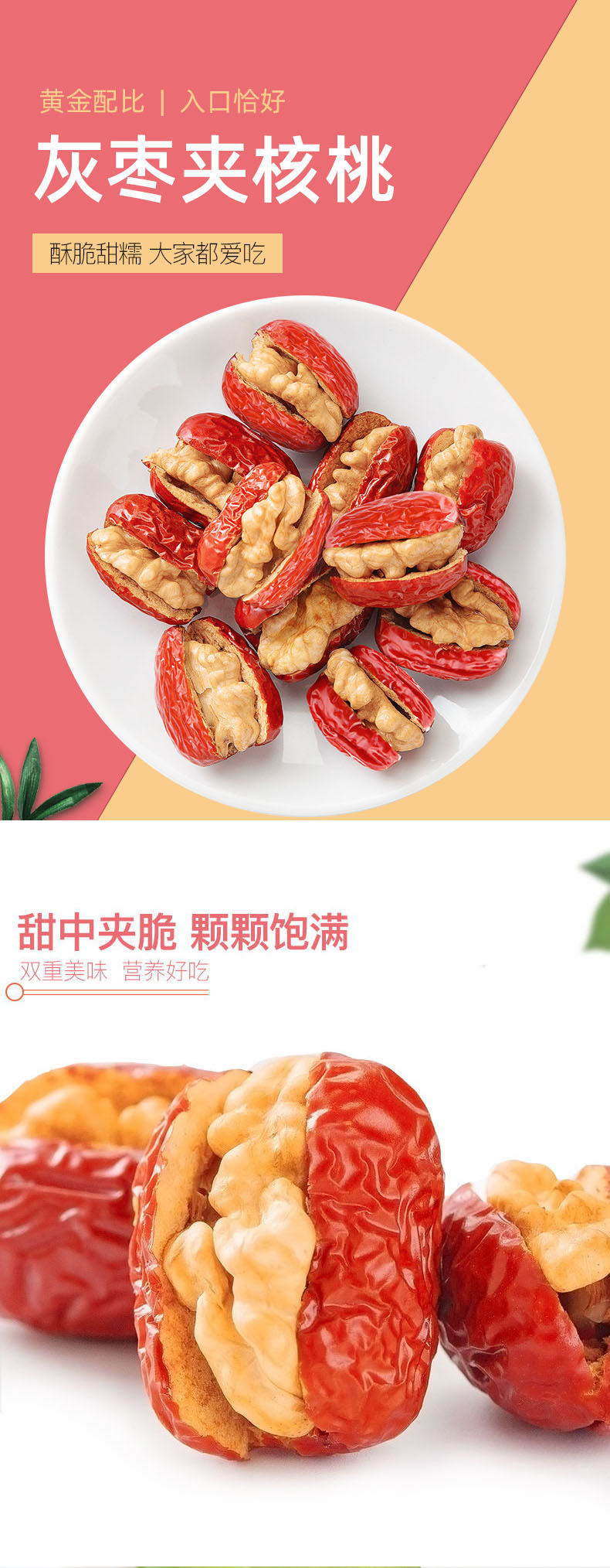双重美味,营养好吃,口感甜中夹脆,灰枣颗颗饱满,入口香酥甜脆,枣味浓厚,营养丰富,核桃精选薄皮核桃,果仁饱满,口感酥脆甜糯,小包随身携带,不用吐核剥壳,大人小孩都爱吃