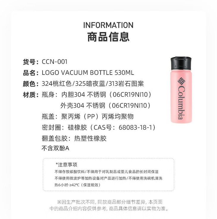 哥伦比亚530毫升不锈钢真空水壶CCN-001