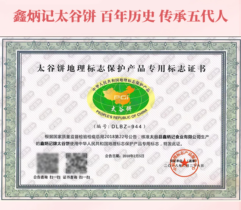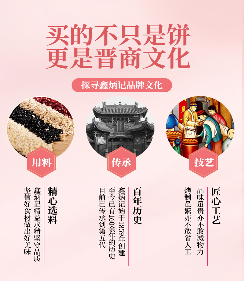 鑫炳记始于1859年,历经五代传承,传承百年工艺,从选取原料到烘烤出炉,都严格遵守祖传古方,让百年太谷饼焕发新的魅力。
