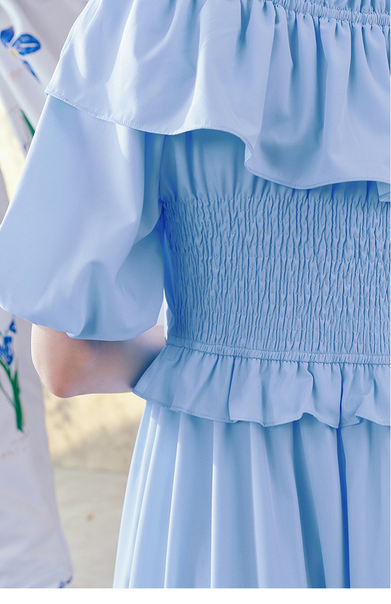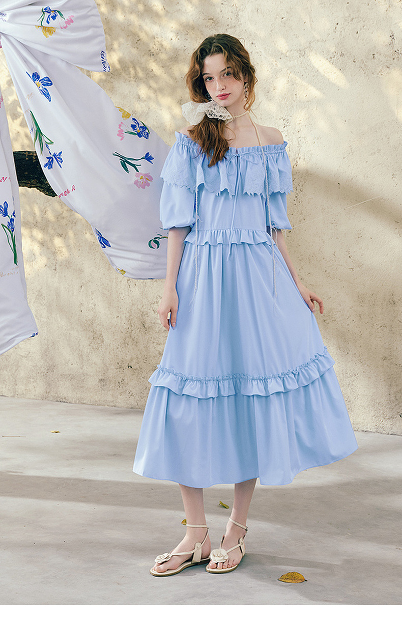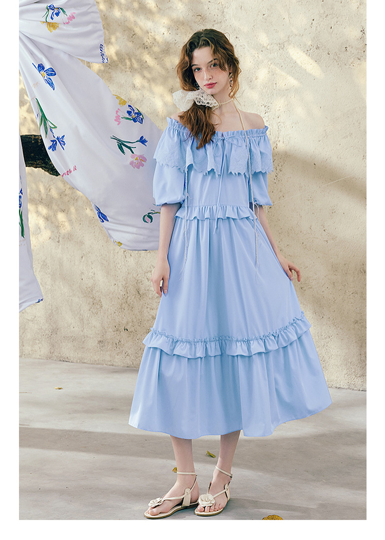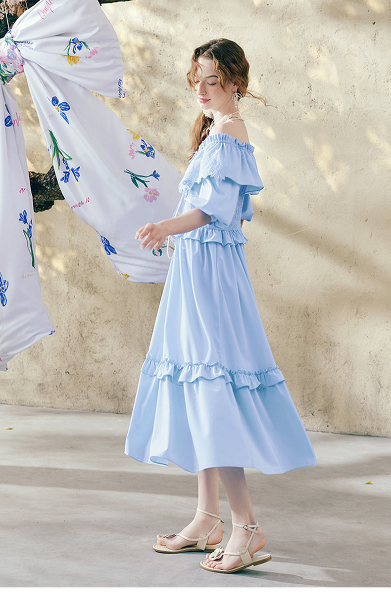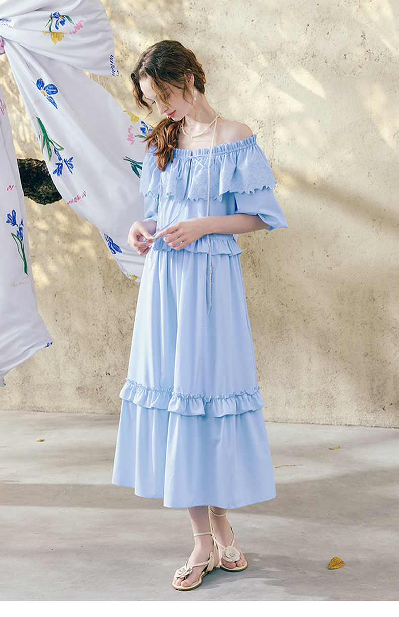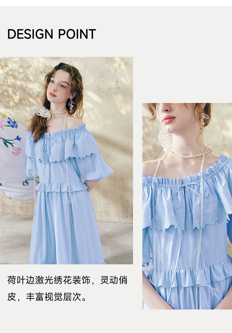 两三事珐琅涟漪2025夏季新款甜美荷叶边一字肩绑带连衣裙气质长裙