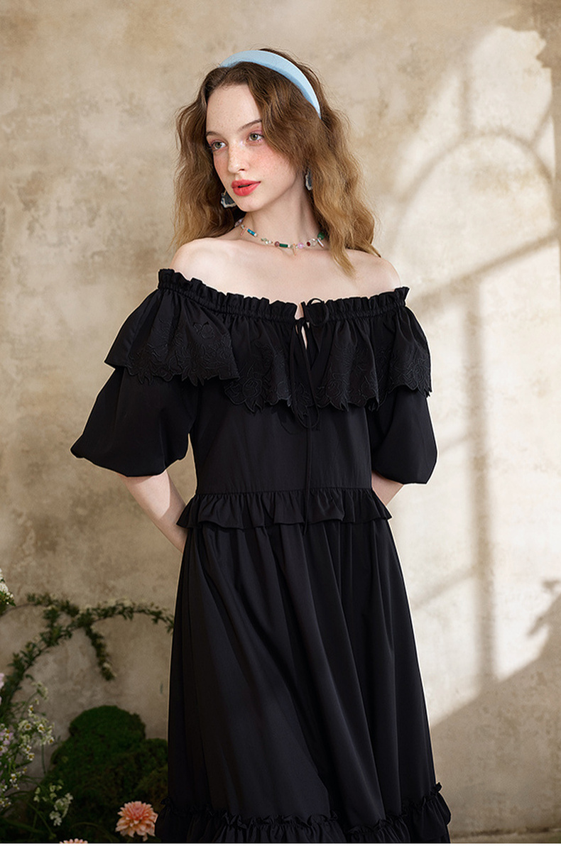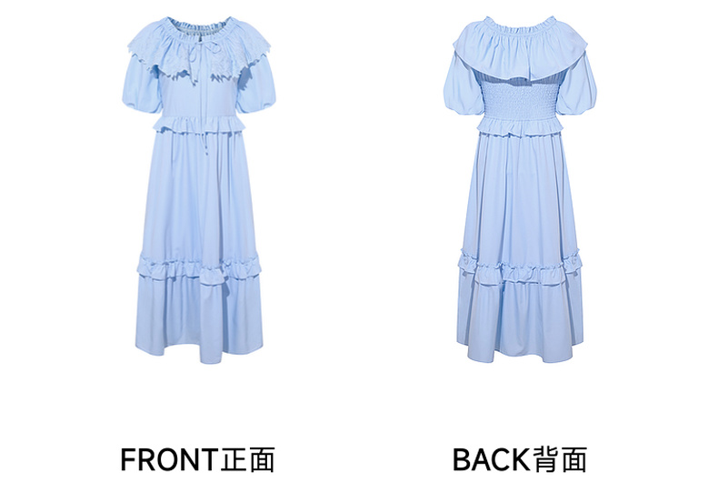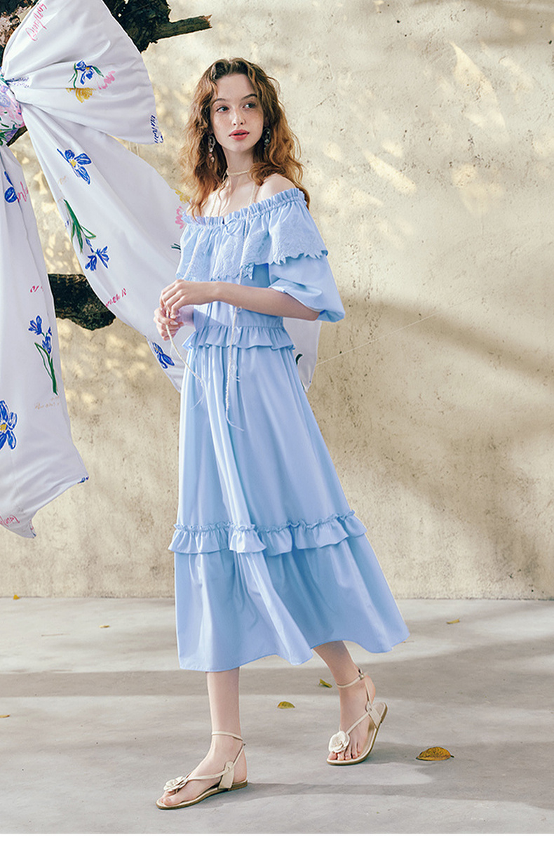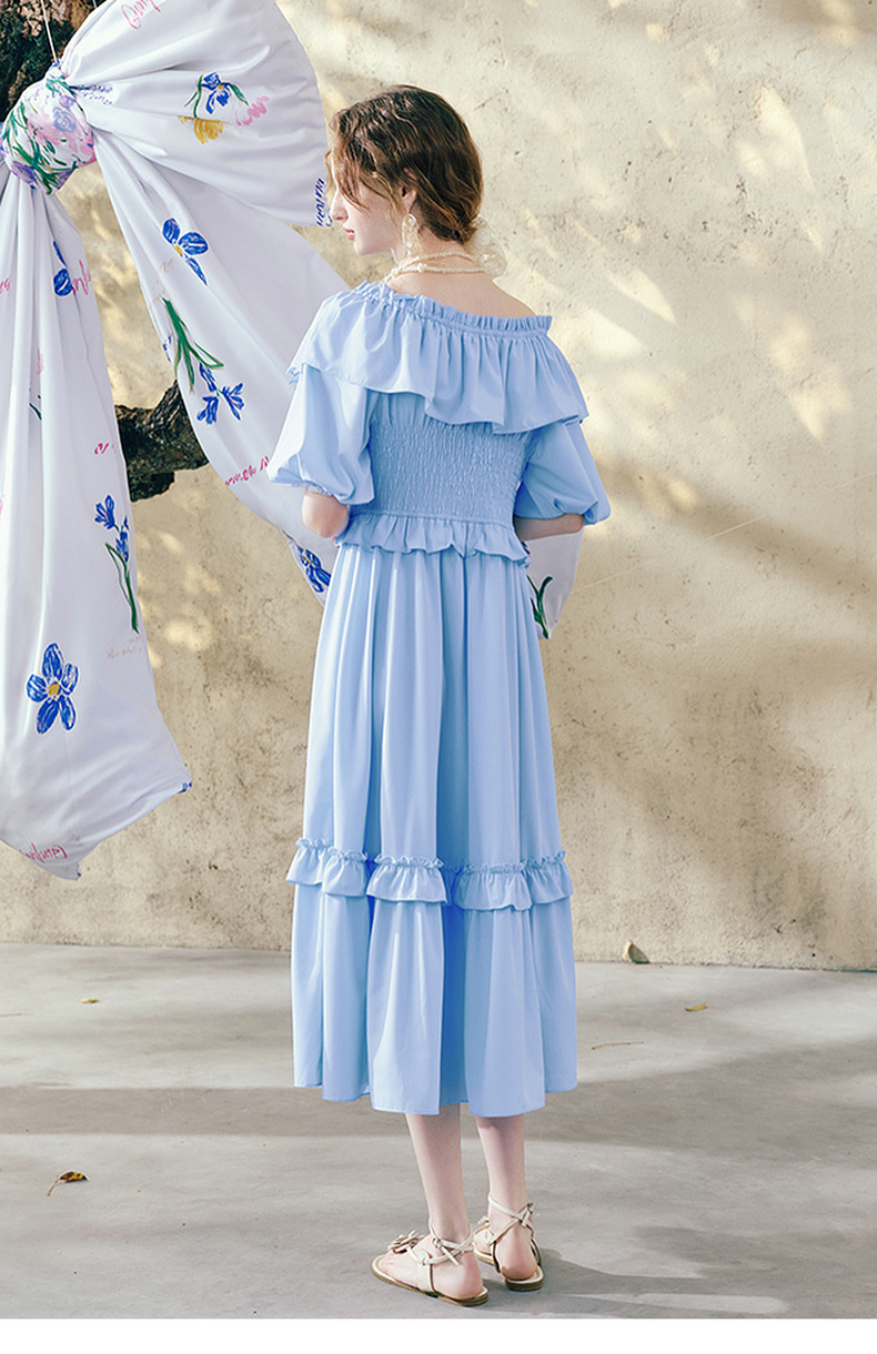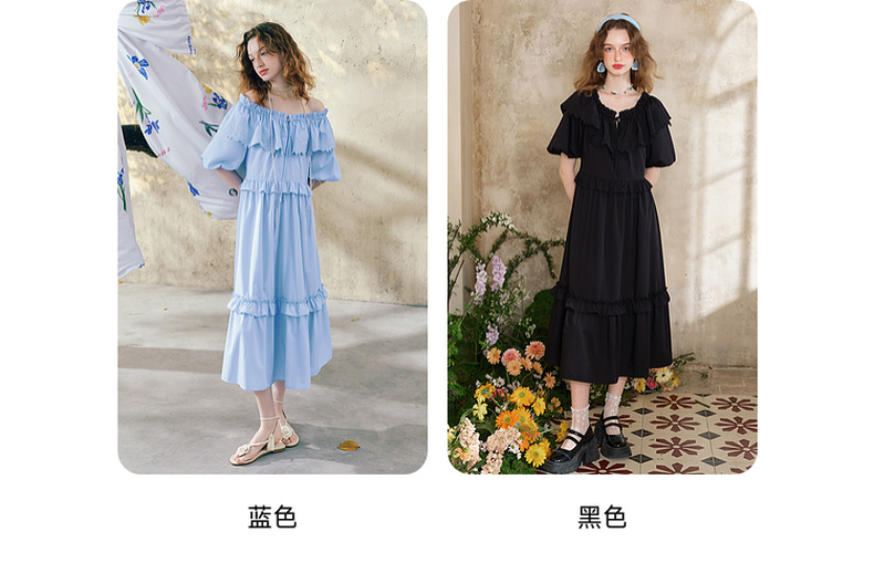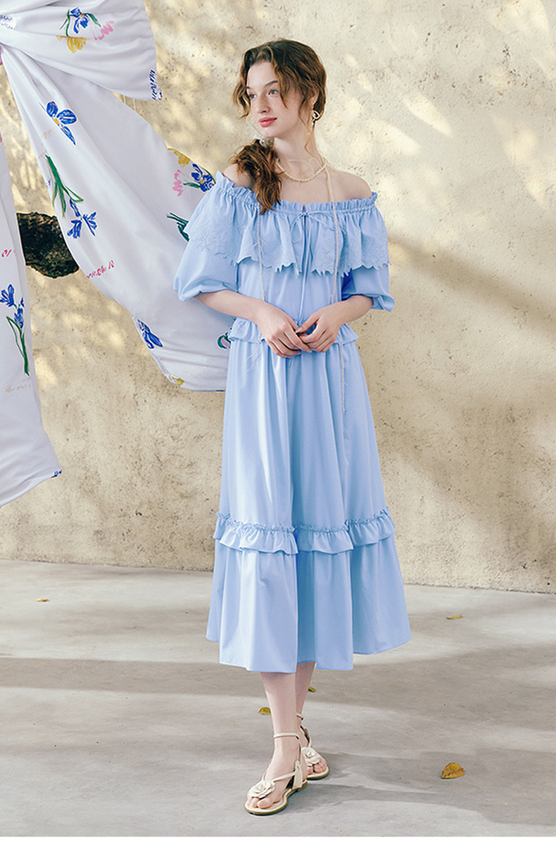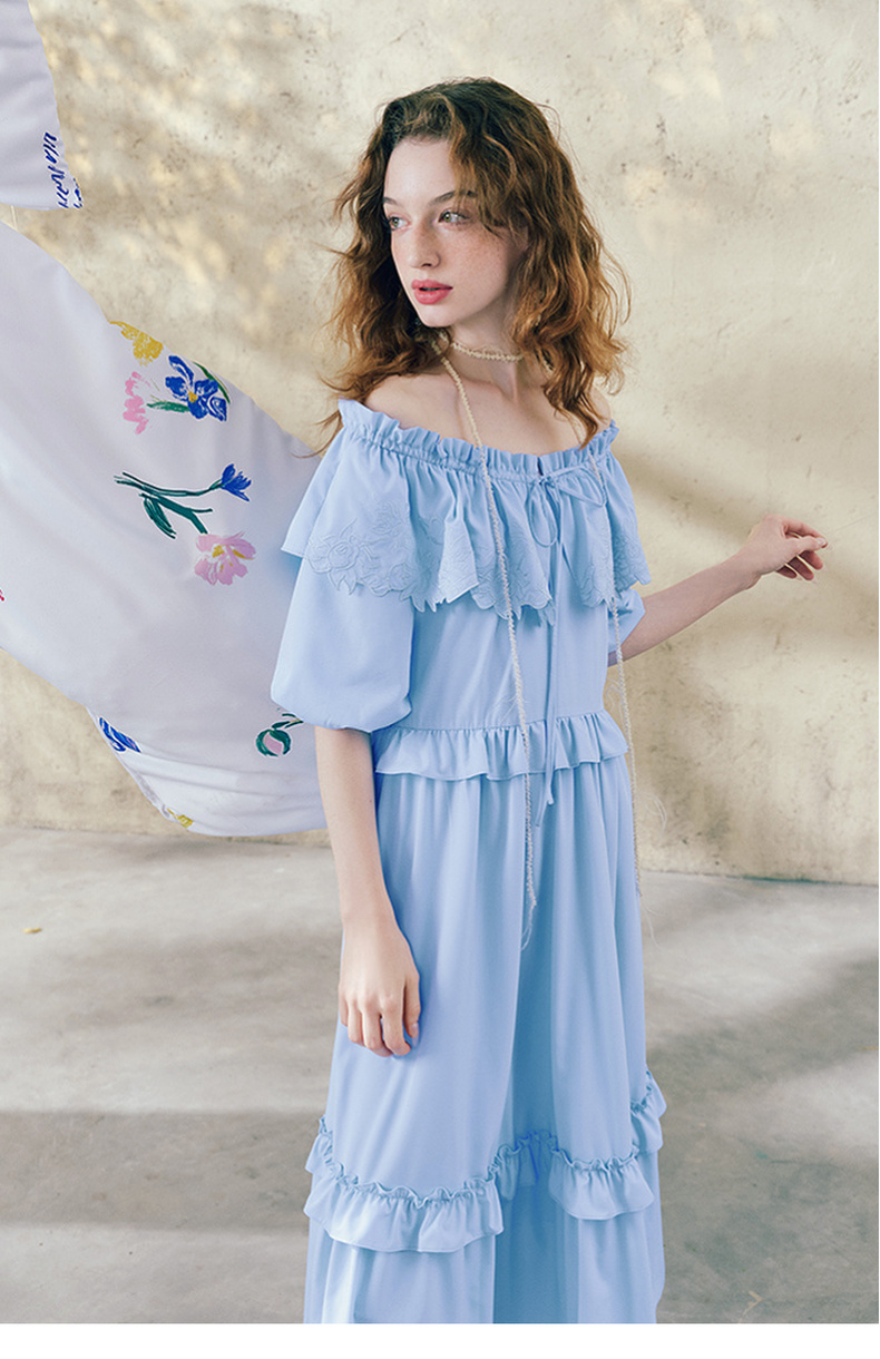 两三事珐琅涟漪2025夏季新款甜美荷叶边一字肩绑带连衣裙气质长裙