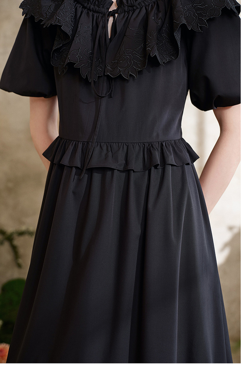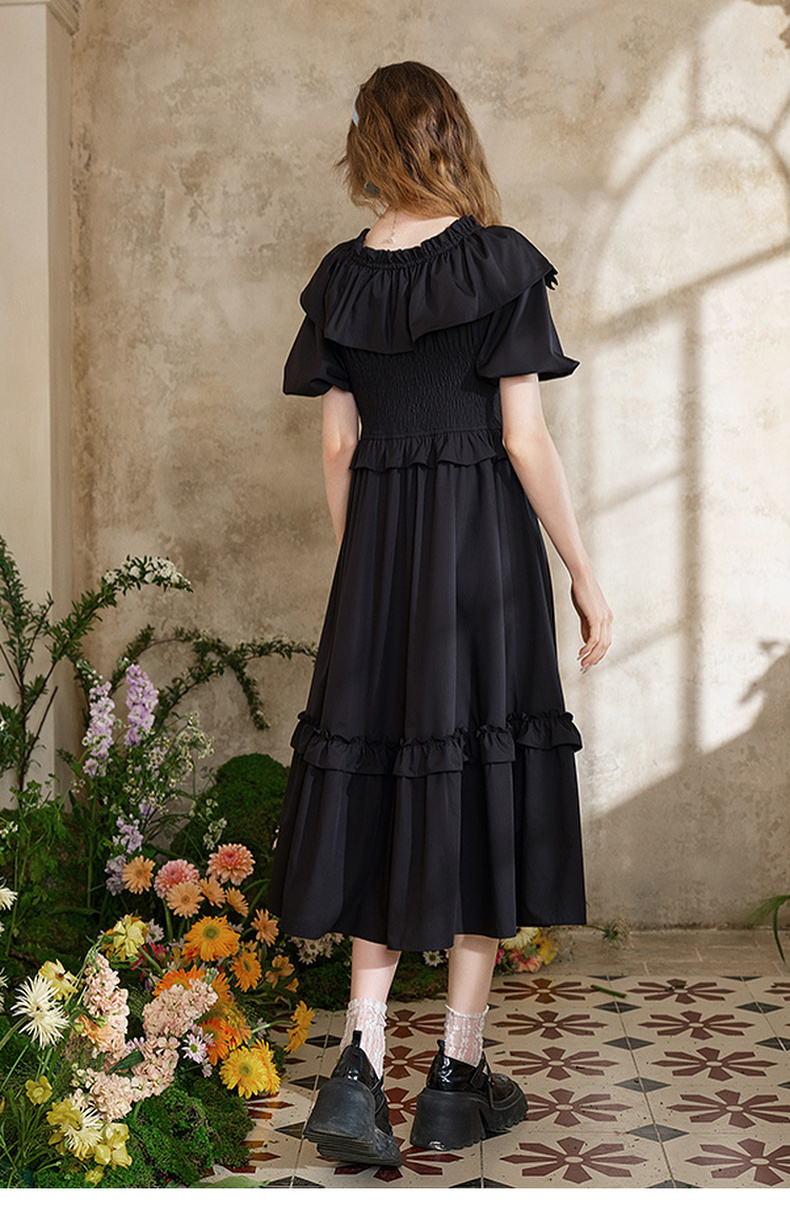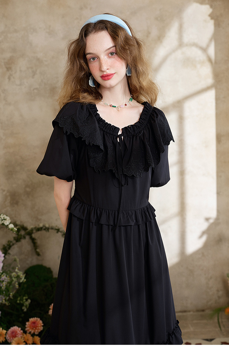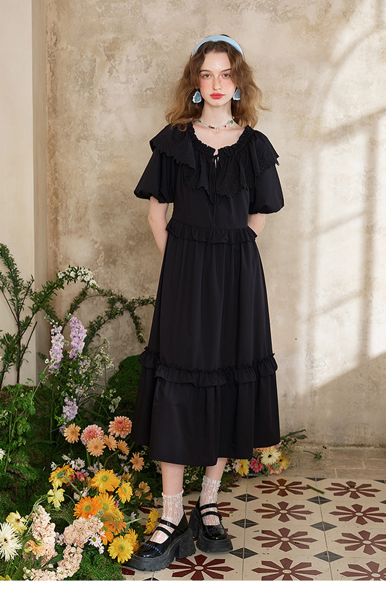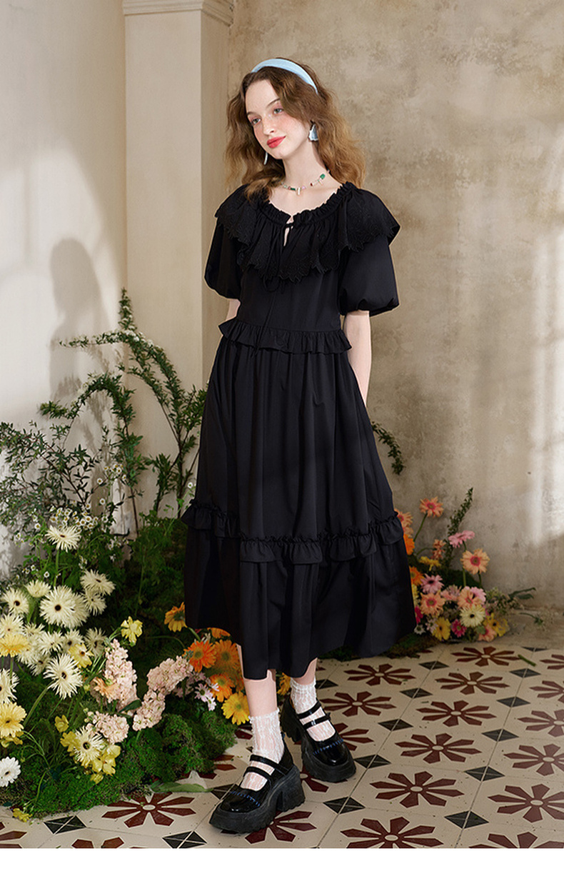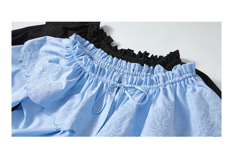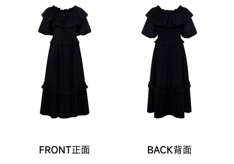 两三事珐琅涟漪2025夏季新款甜美荷叶边一字肩绑带连衣裙气质长裙