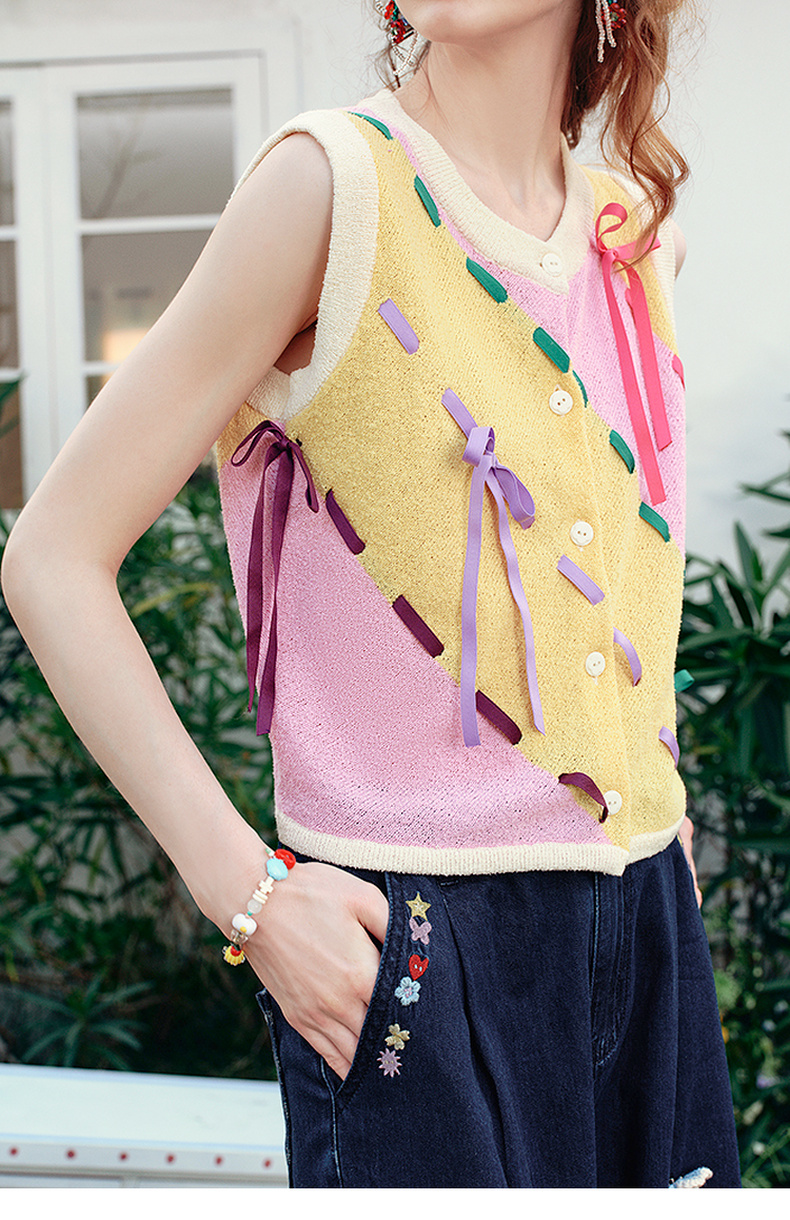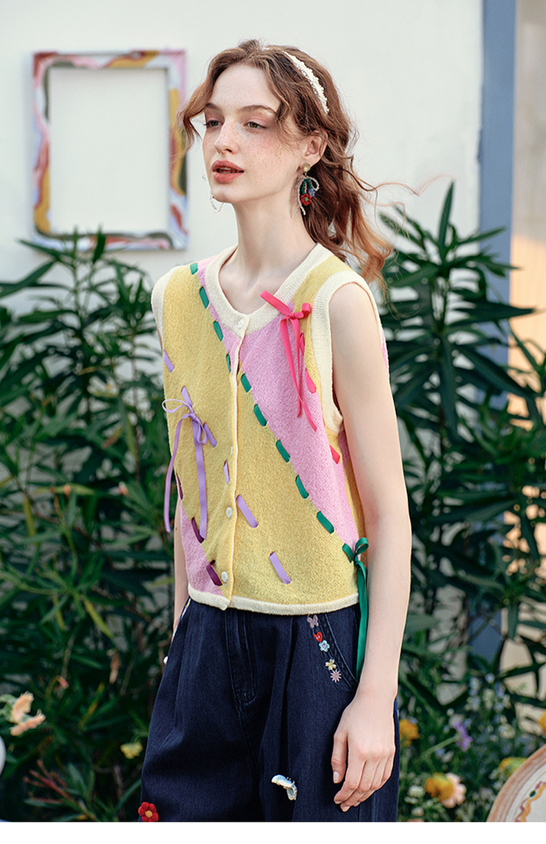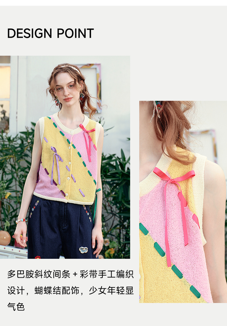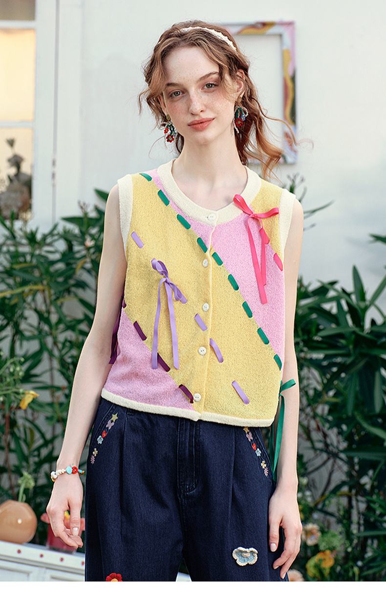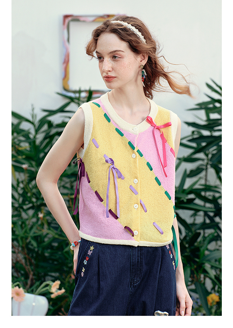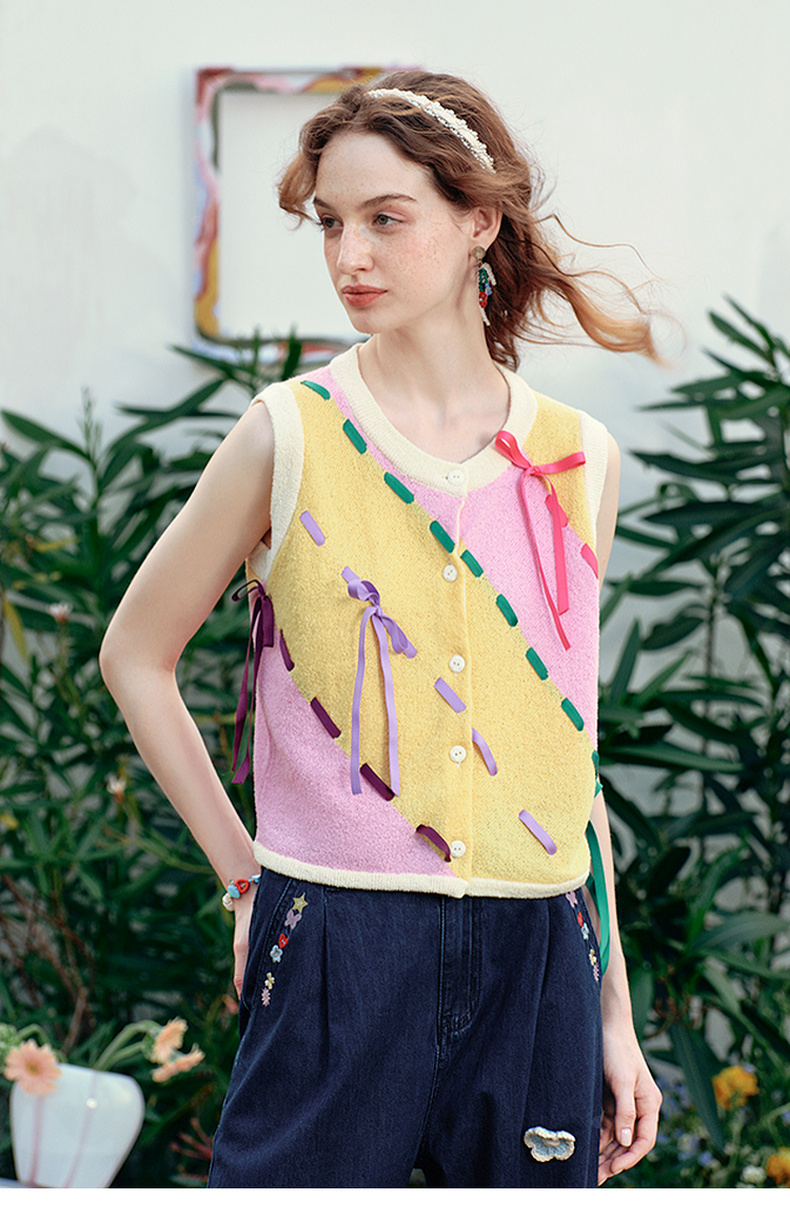 两三事 蝶翼梦境 2025夏季新款抽绳绑带拼色无袖针织开衫女宽松