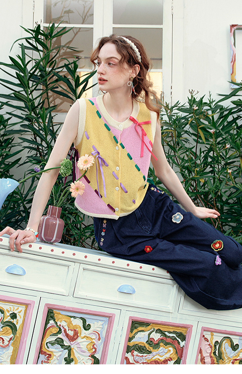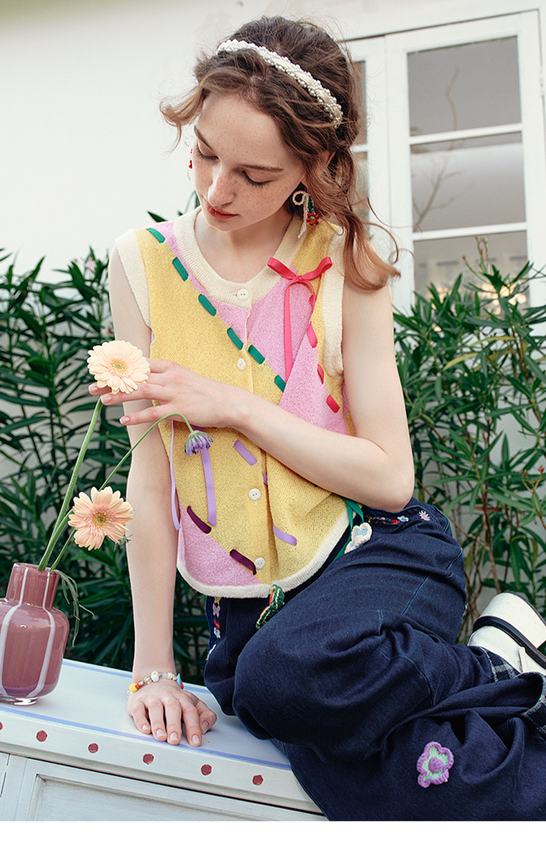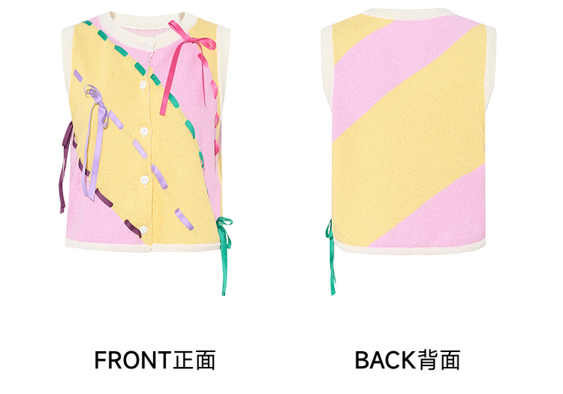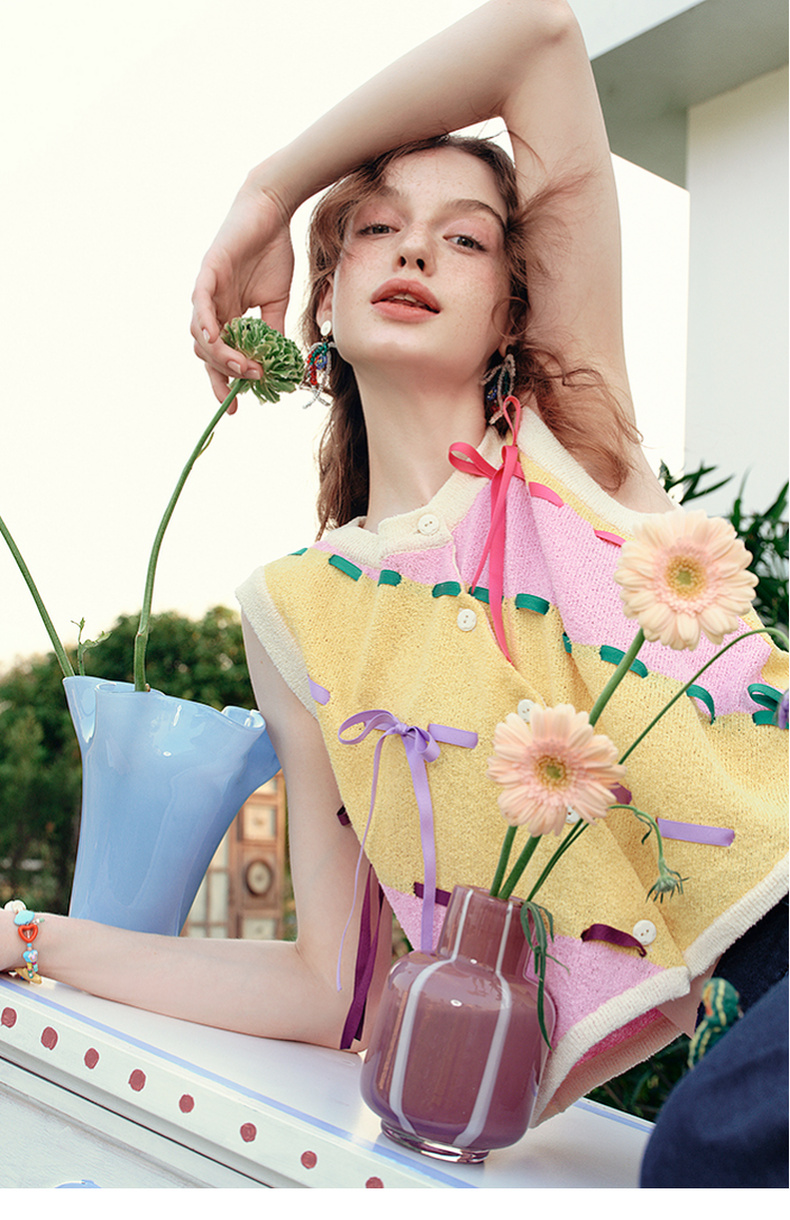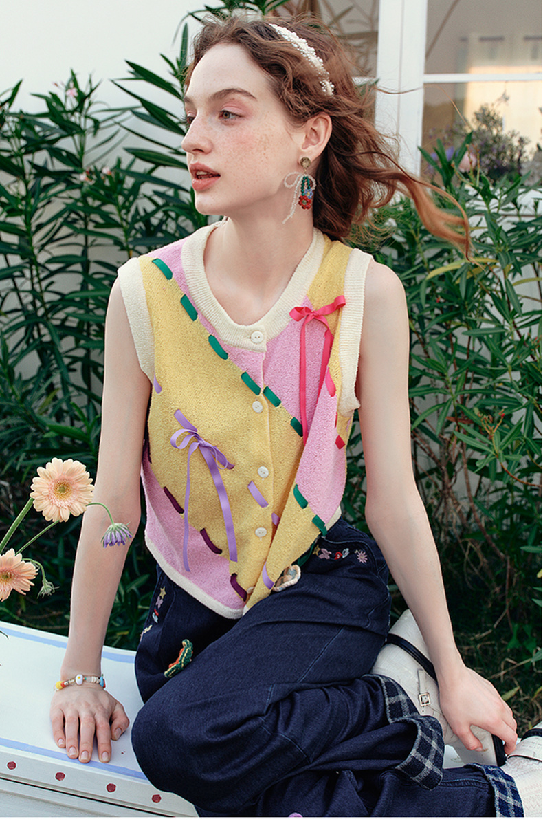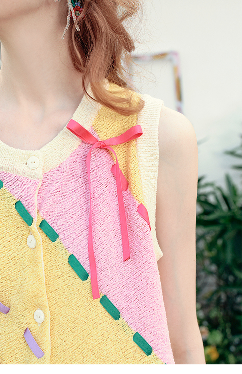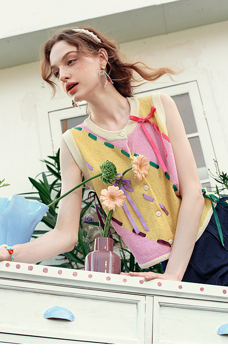 两三事 蝶翼梦境 2025夏季新款抽绳绑带拼色无袖针织开衫女宽松