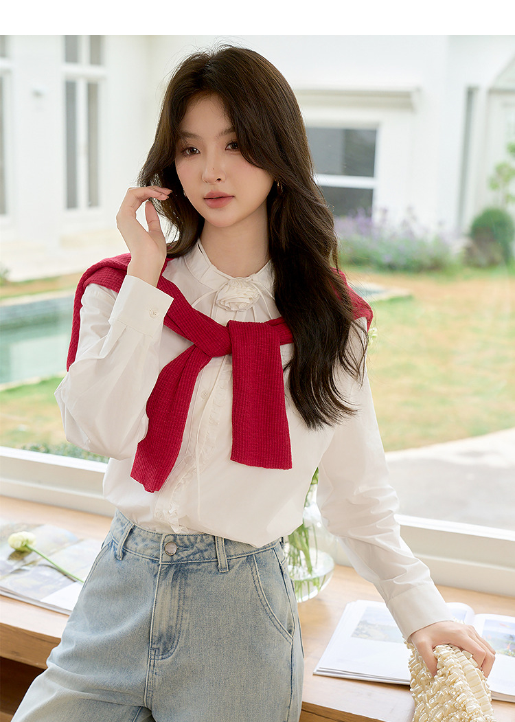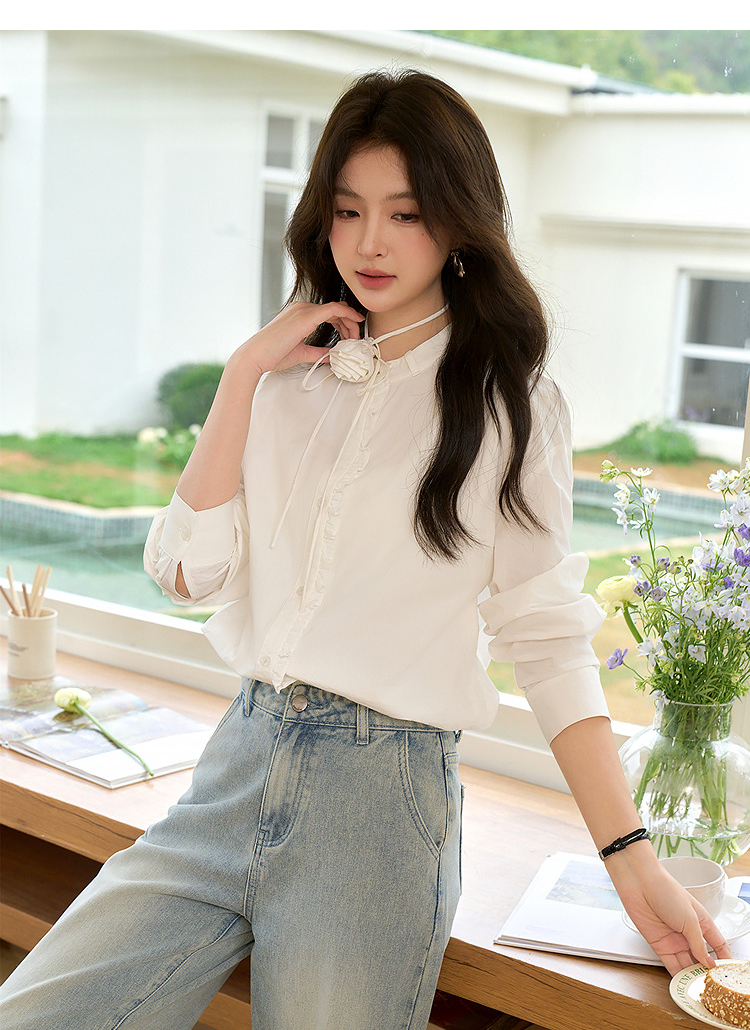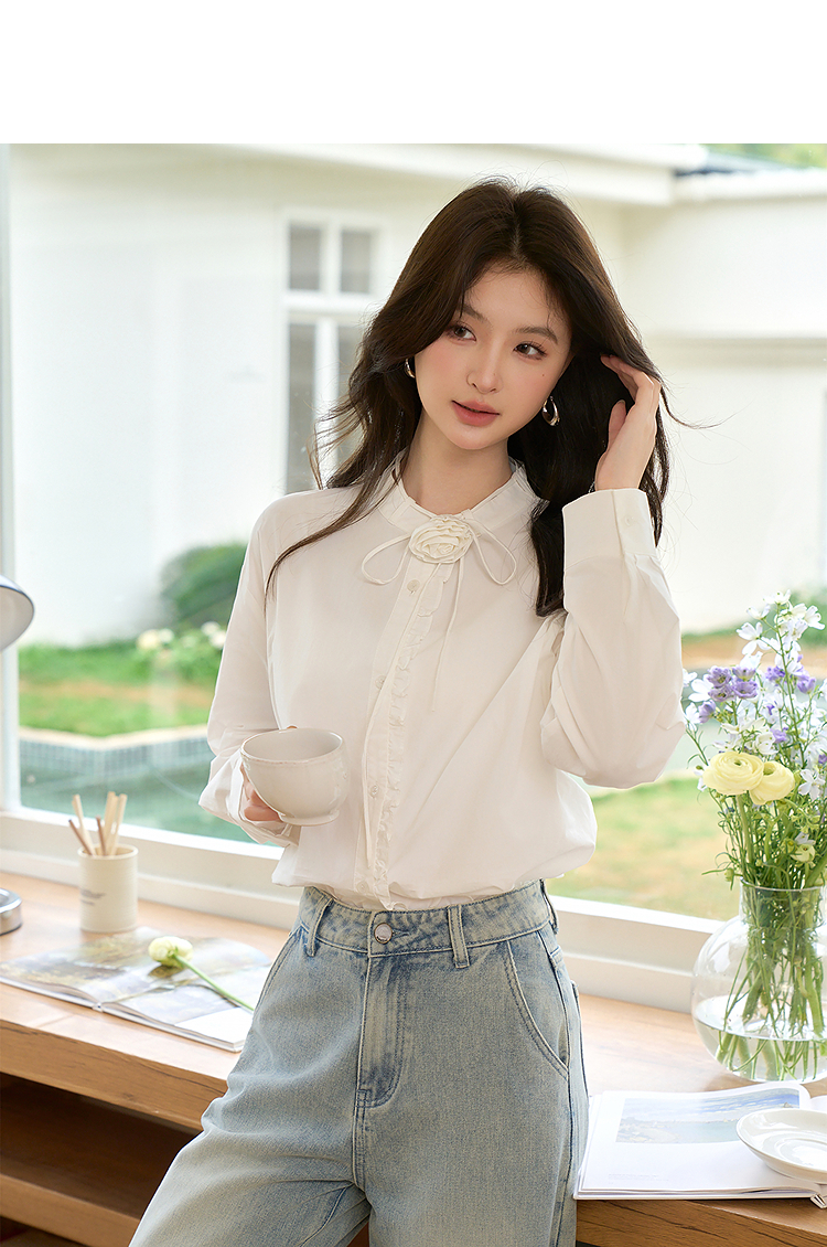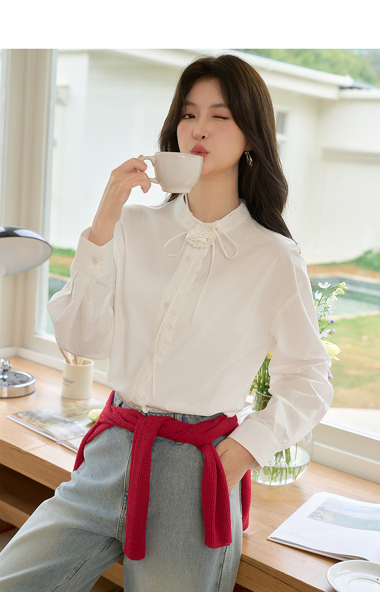 纯棉简约设计感文艺风拼接花边圆领衬衫女设计感衬衣V0450099