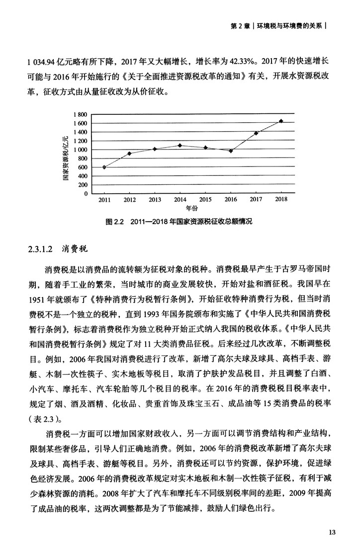 第2章对环境税和环境费进行分析,对排污费和环境保护税在性质上的区别和联系进行讨论,同时介绍我国现行的环境税费制度。
