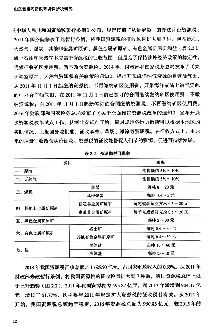 第5章介绍我国环境保护税法出台的过程和环境保护税的征收办法,采用对比的方法对山东省的环境保护税征收办法进行分析。