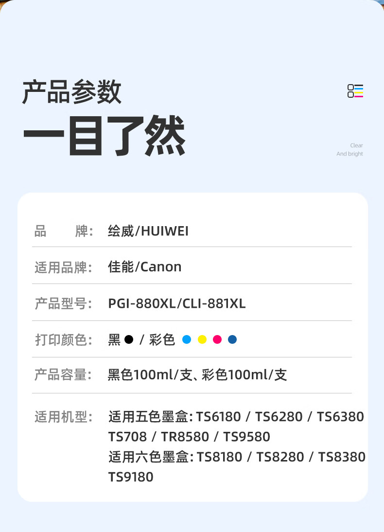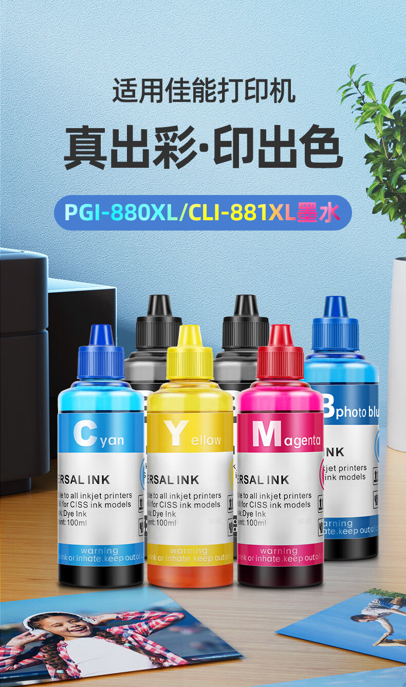 绘威PGI-880XL六色填充墨水套装 适用佳能TS8380 TS9580 TS8180 9180 6180 TR8580 708t打印机墨盒CLI-881